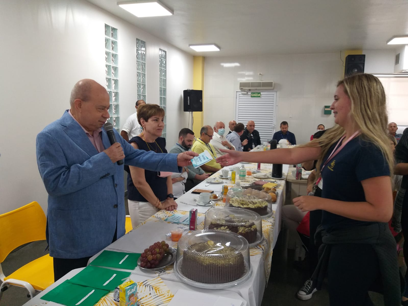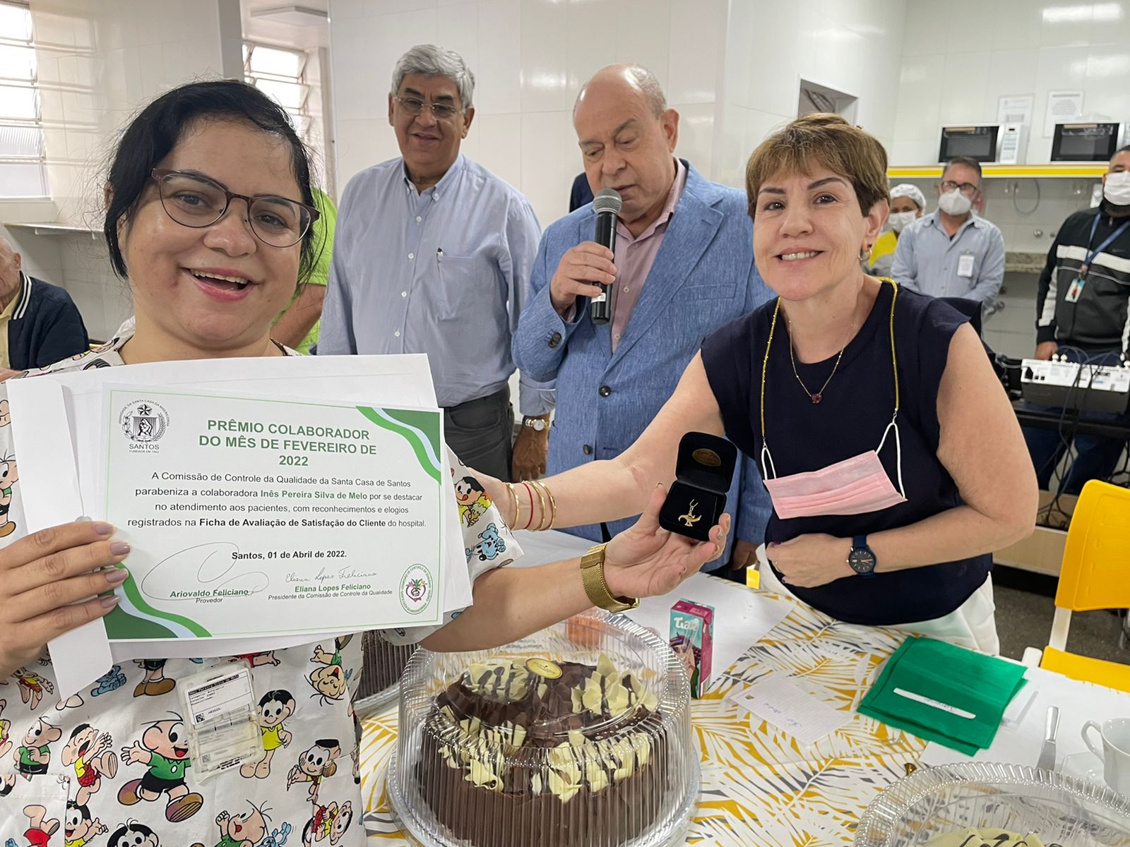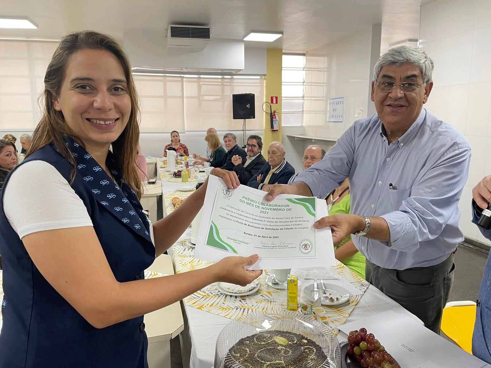 Os colaboradores mais elogiados foram chamados à frente para receber os cumprimentos e o certificado que congratula o profissional pelo destaque na assistência. A Técnica de Enfermagem Inês Pereira Silva de Melo foi destaque pela 4ª vez, e ganhou uma joia em ouro, que foi entregue pela presidente da C.C.Q. Eliana Lopes Feliciano, em reconhecimento pela excelência no atendimento.