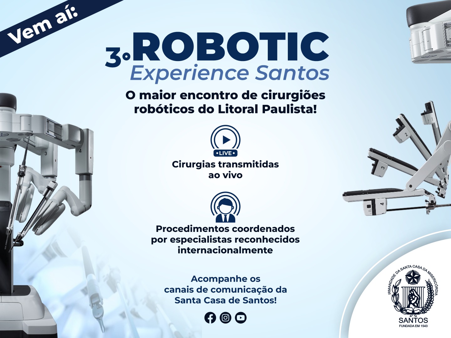 Acontecerá no Centro Robótico da Santa Casa de Santos, nos dias 28 e 31 de maio, a partir das 7 horas, o 3º Robotic Experience da Baixada Santista. O evento, está dentro da programação da XVIII Jornada Paulista de Urologia. O simpósio é coordenado pelo médico responsável do Centro Robótico da Santa Casa, Dr. Matheus Paiva.
