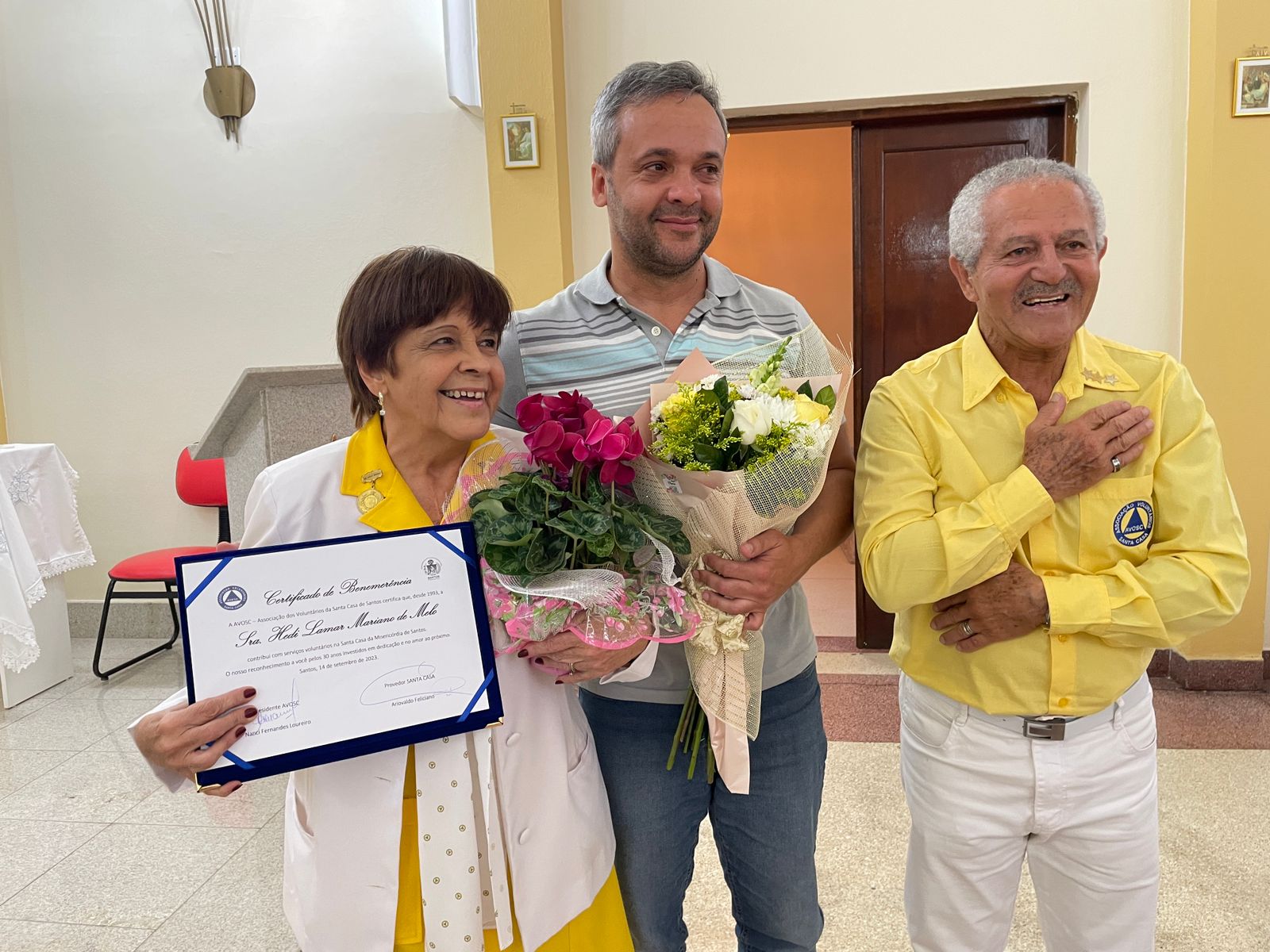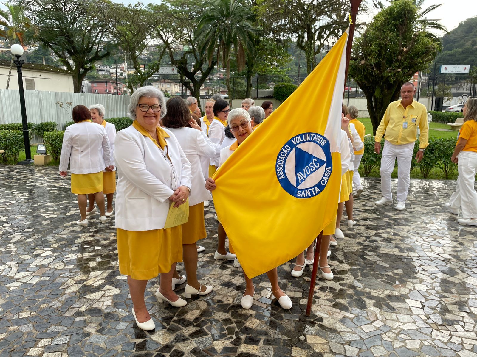 Assim teve início a história da AVOSC – Associação de Voluntários da Santa Casa de Santos, fundada em 14 de setembro de 1957, da qual as integrantes são conhecidas como “amarelinhas”, devido a cor de seus uniformes, ou “amarelinhos”, pois o quadro também conta com senhores. Atualmente o grupo é formado por 92 voluntários, que acolhem os pacientes mais necessitados do SUS, suprindo suas carências com o fornecimento de enxovais, materiais de higiene, empréstimos de bengalas, muletas, entre outras necessidades.