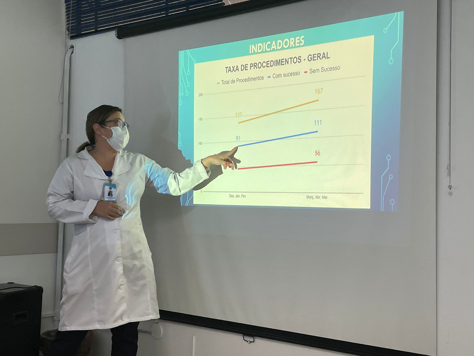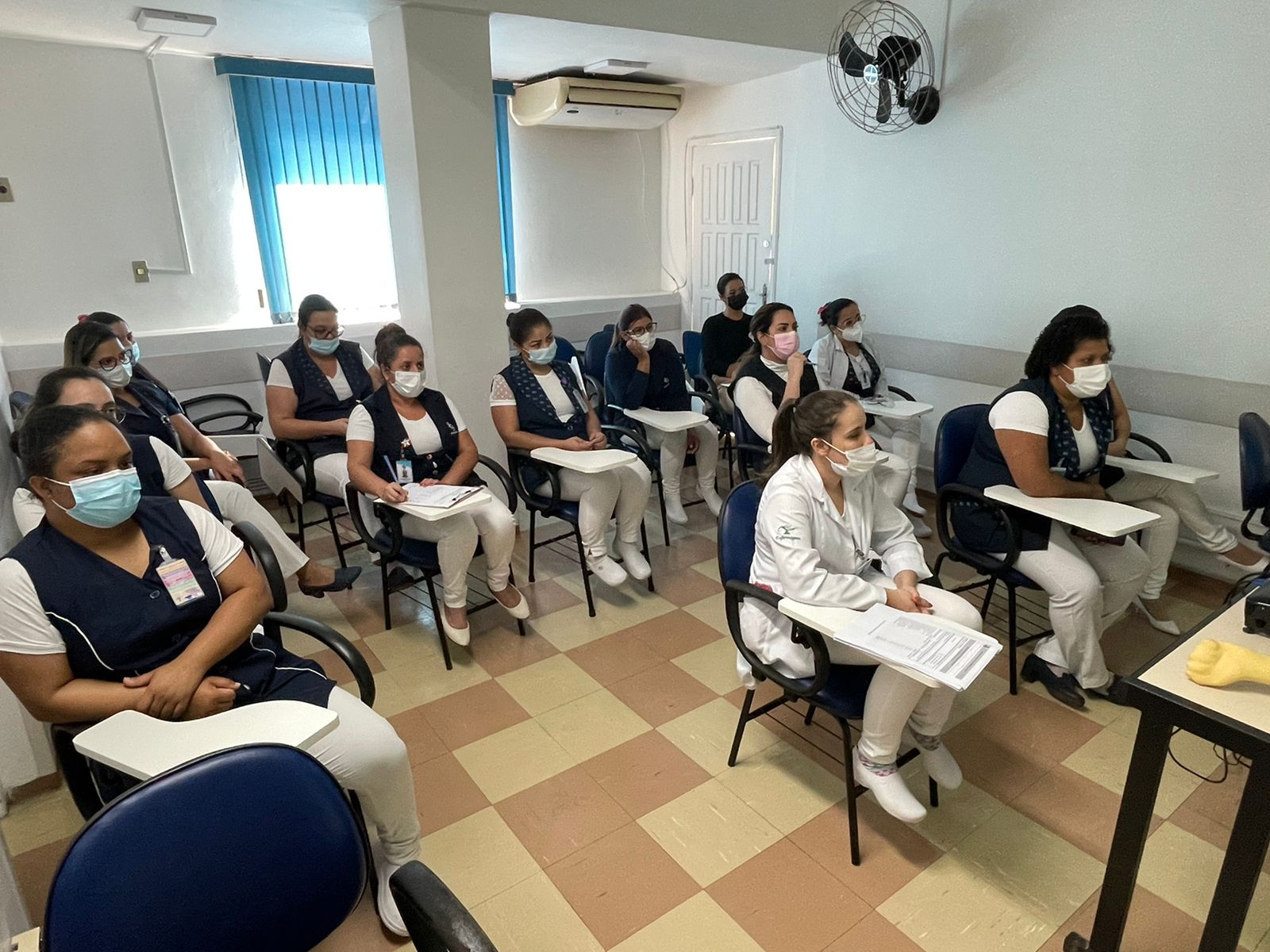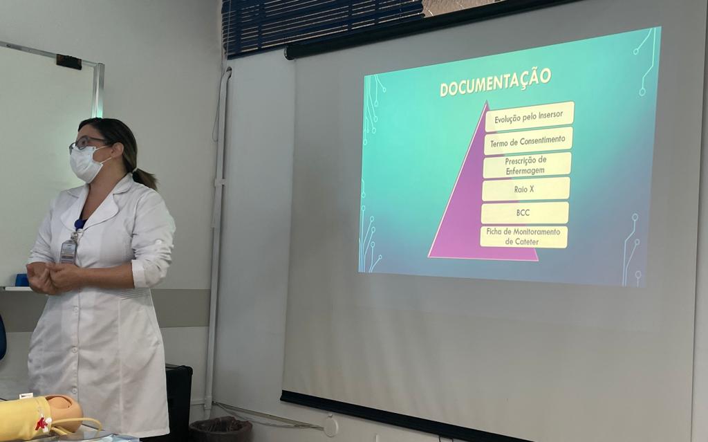 Na última sexta-feira (22/07/22), dando continuidade ao programa de capacitação, um grupo de cerca de 30 enfermeiros, já habilitados, participaram de uma oficina de atualização para Passagem de Cateter Central de Inserção Periférica – PICC, em curso ministrado pela enfermeira Noely Jesus, da Educação Continuada.