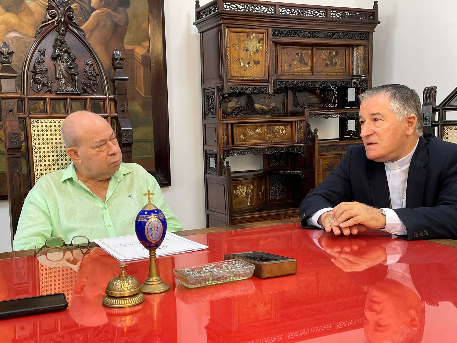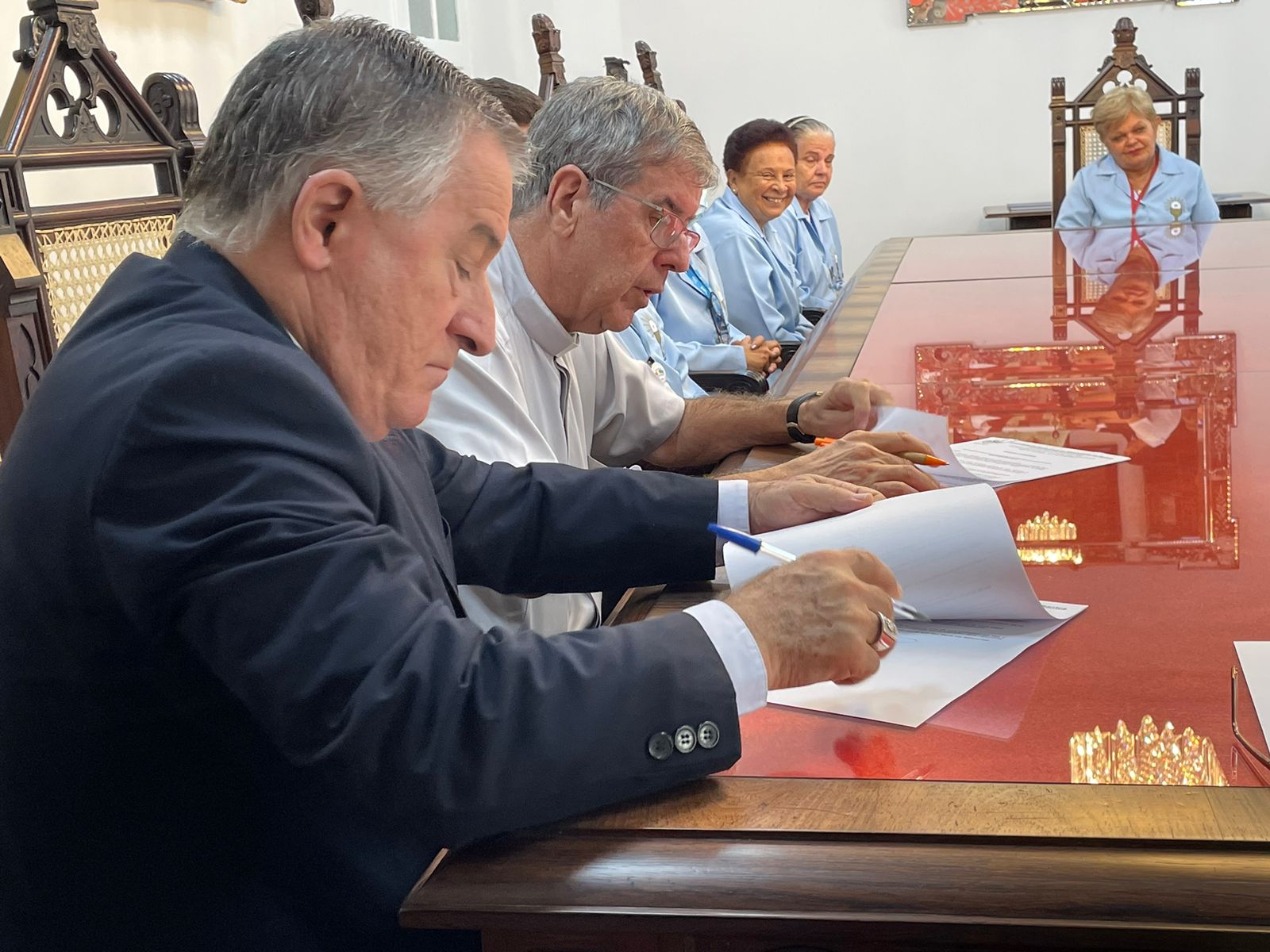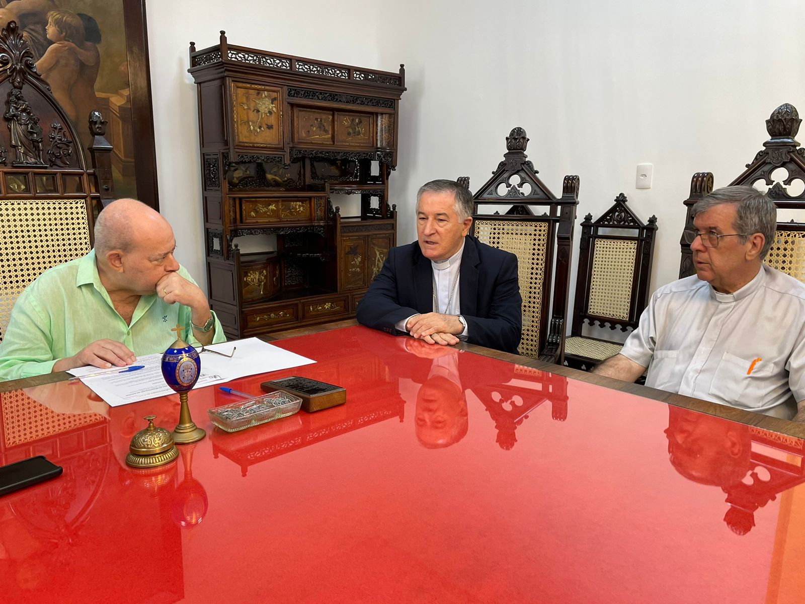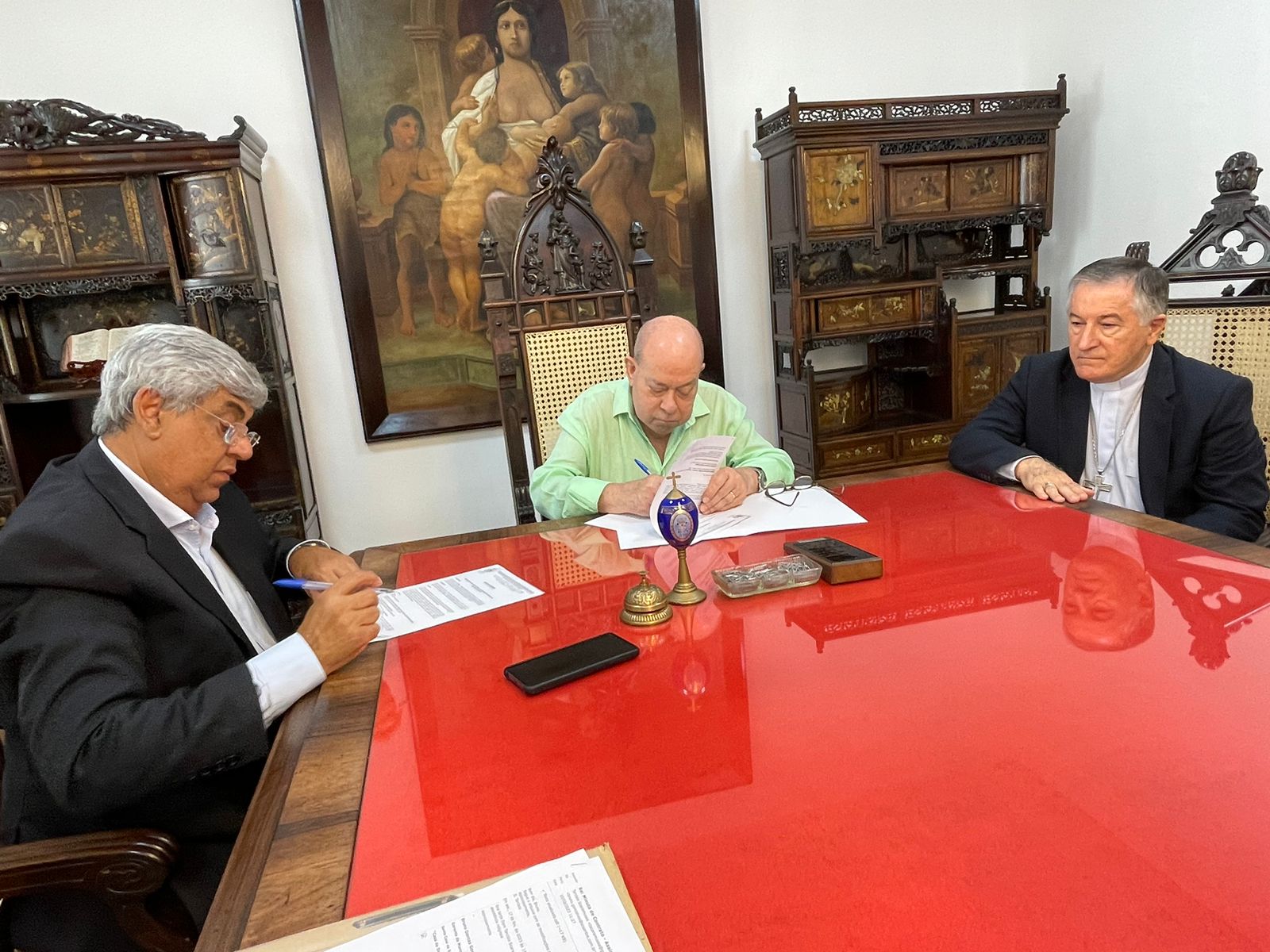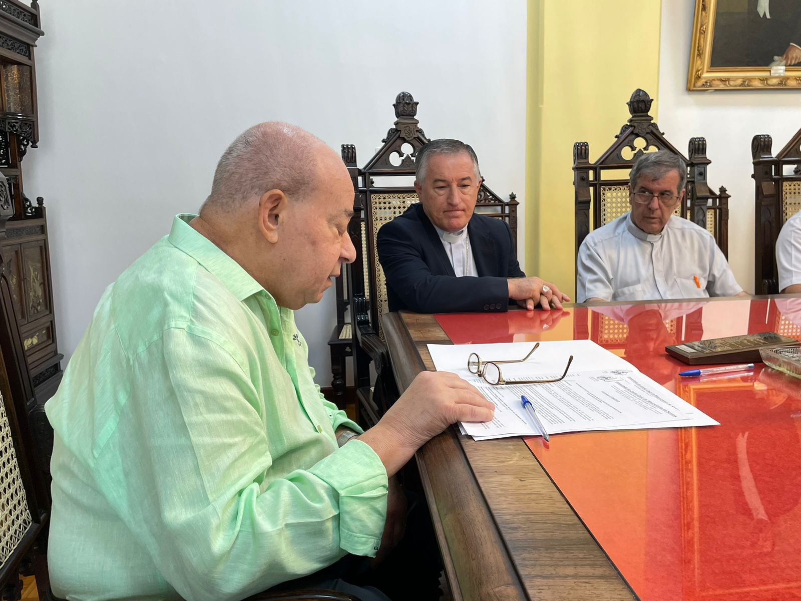 Para formalizar a renovação do contrato, o bispo Dom Tarcísio Scaramuzza esteve na Santa Casa de Santos em reunião com o provedor Ariovaldo Feliciano, na Sala da Mesa Administrativa.