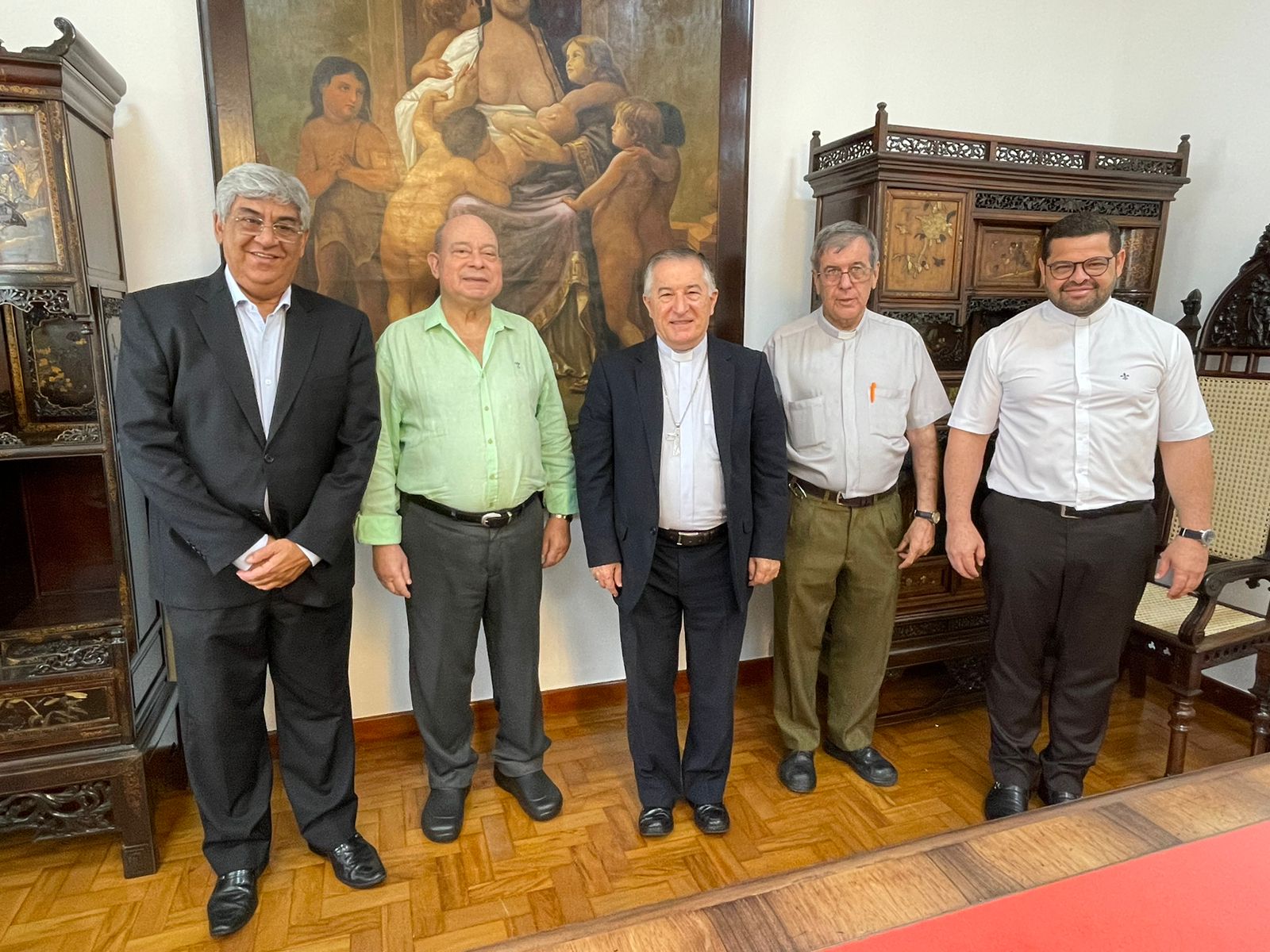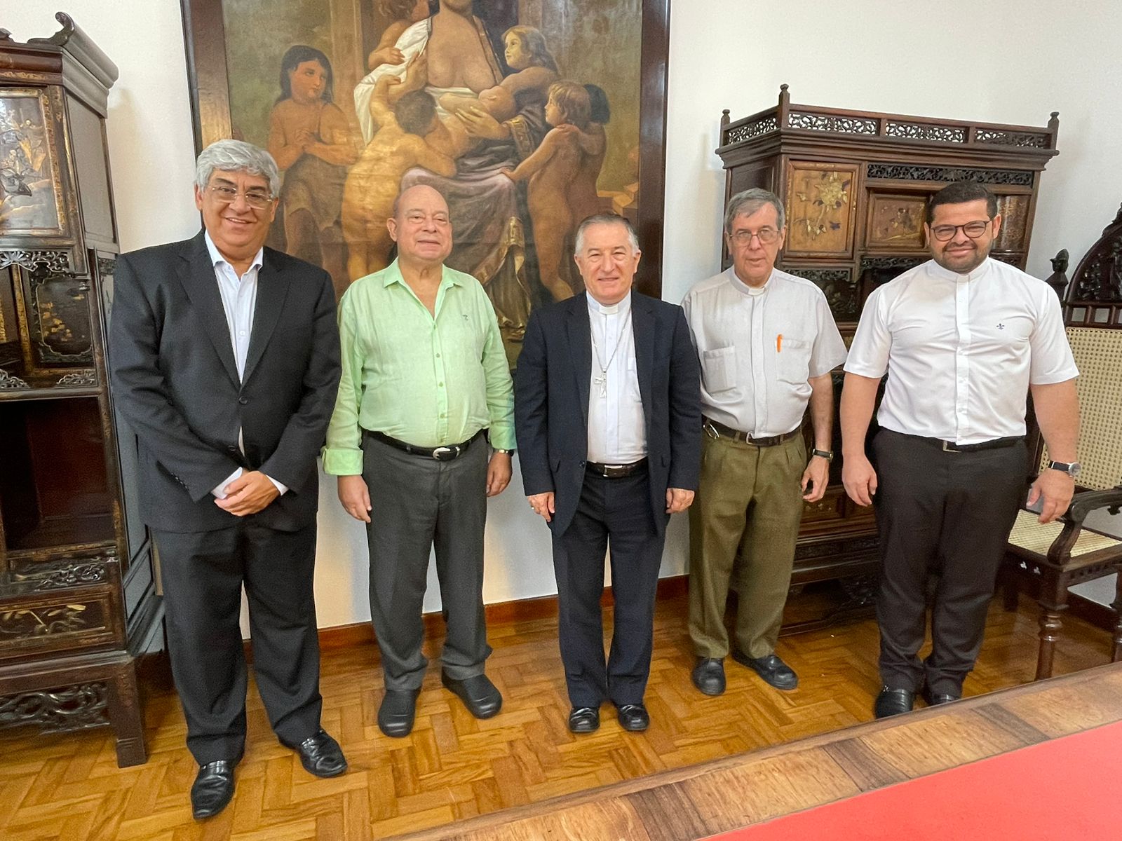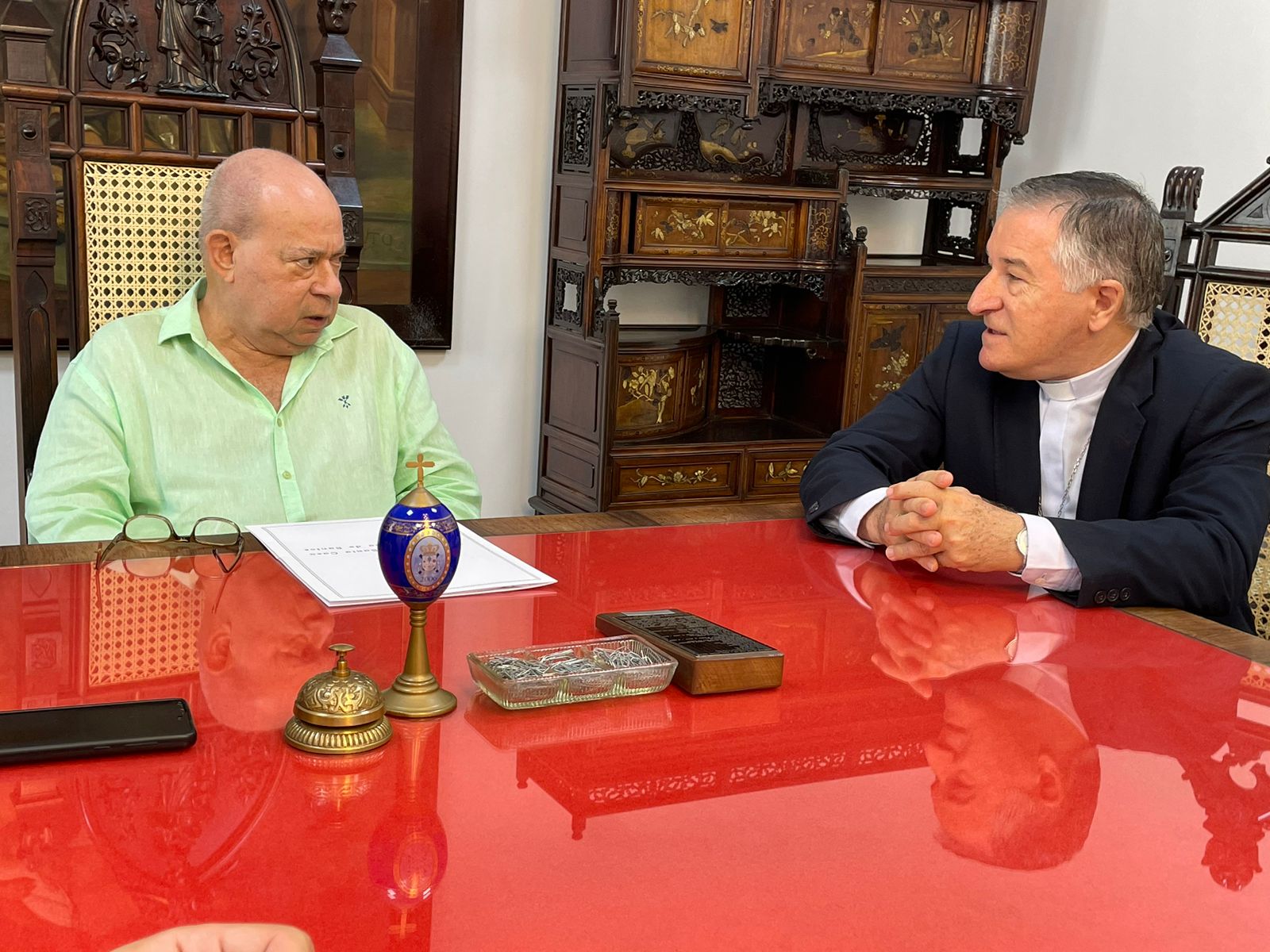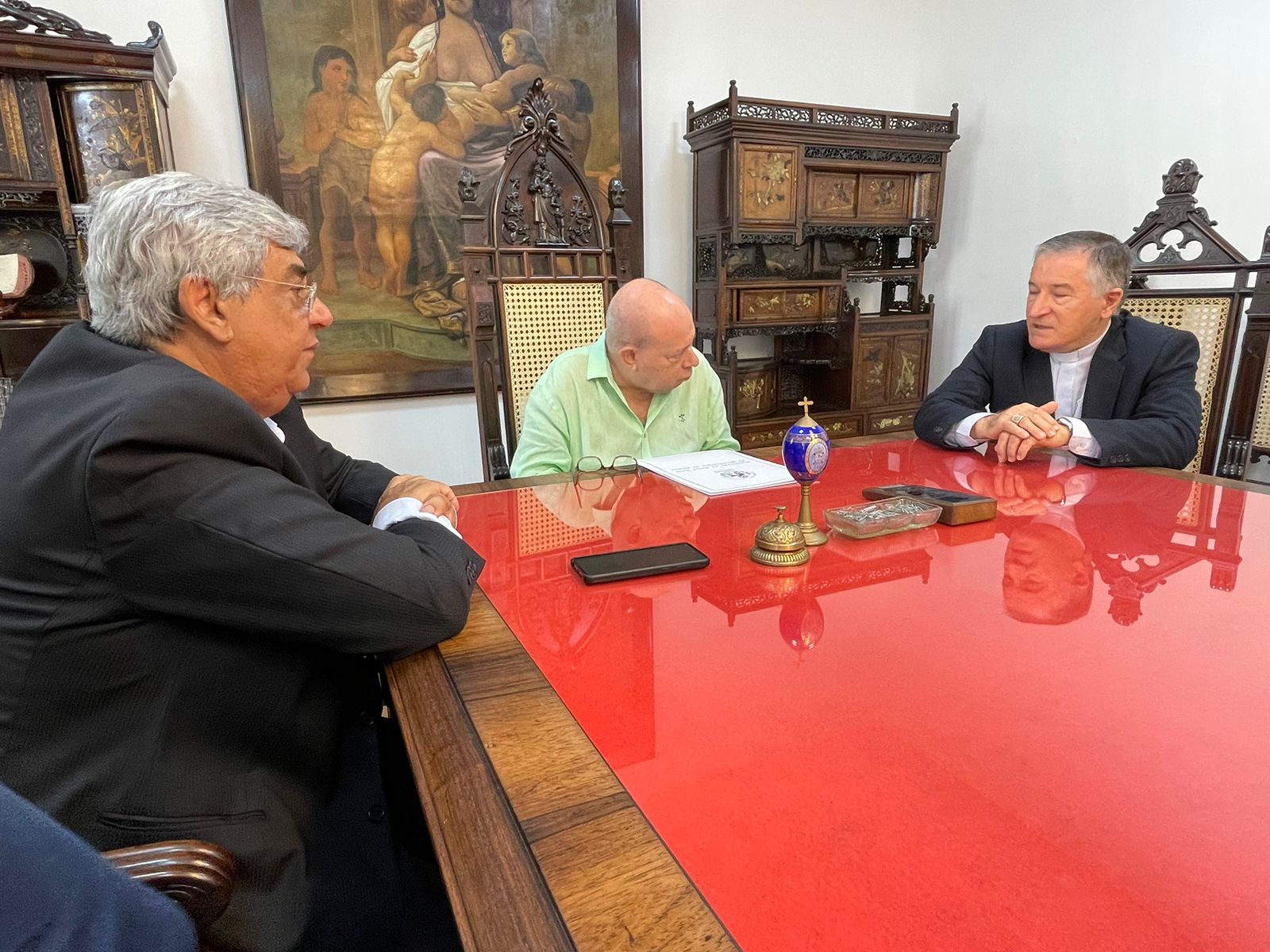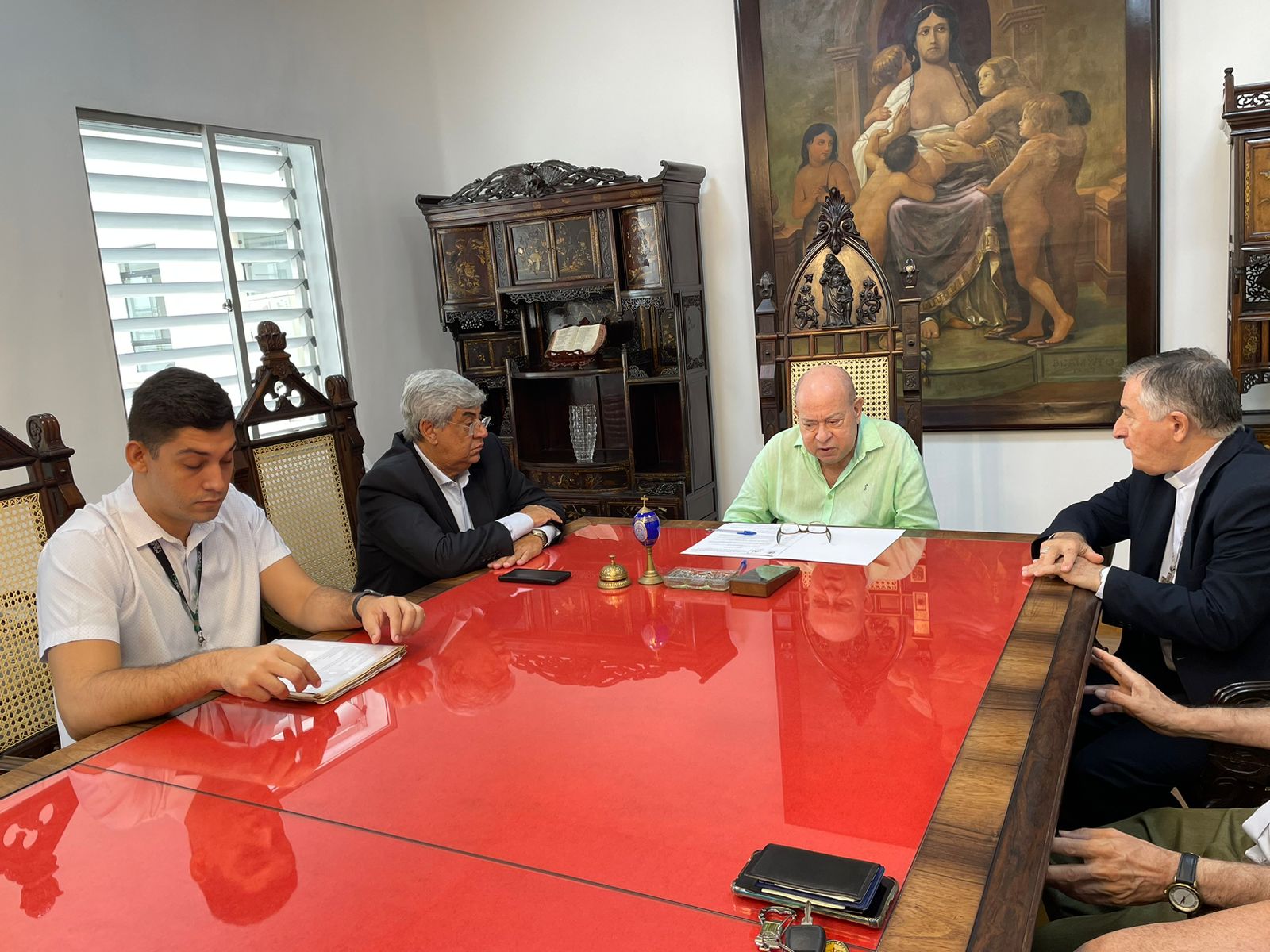 Para formalizar a renovação do contrato, o bispo Dom Tarcísio Scaramuzza esteve na Santa Casa de Santos em reunião com o provedor Ariovaldo Feliciano, na Sala da Mesa Administrativa.