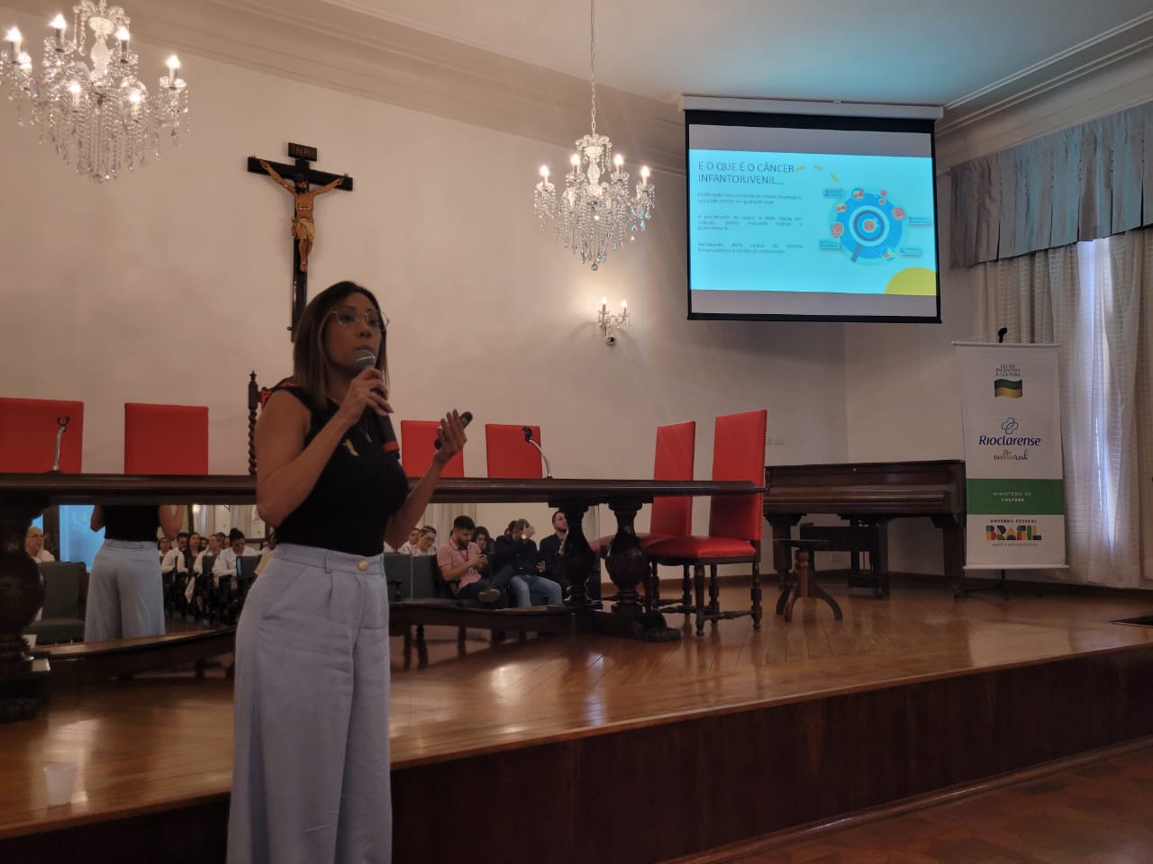 A primeira palestra foi ministrada pela Oncopediatra Drª. Fabiola Velarde, que explicou sobre a campanha Setembro Dourado, apresentou dados estatísticos e também destacou que os tipos de canceres mais comuns entre crianças são: as leucemias; os tumores do sistema nervoso central; e os linfomas. A Drª. Fabiola falou sobre as modalidades de tratamento, como a quimioterapia, a cirurgia oncológica e a radioterapia.