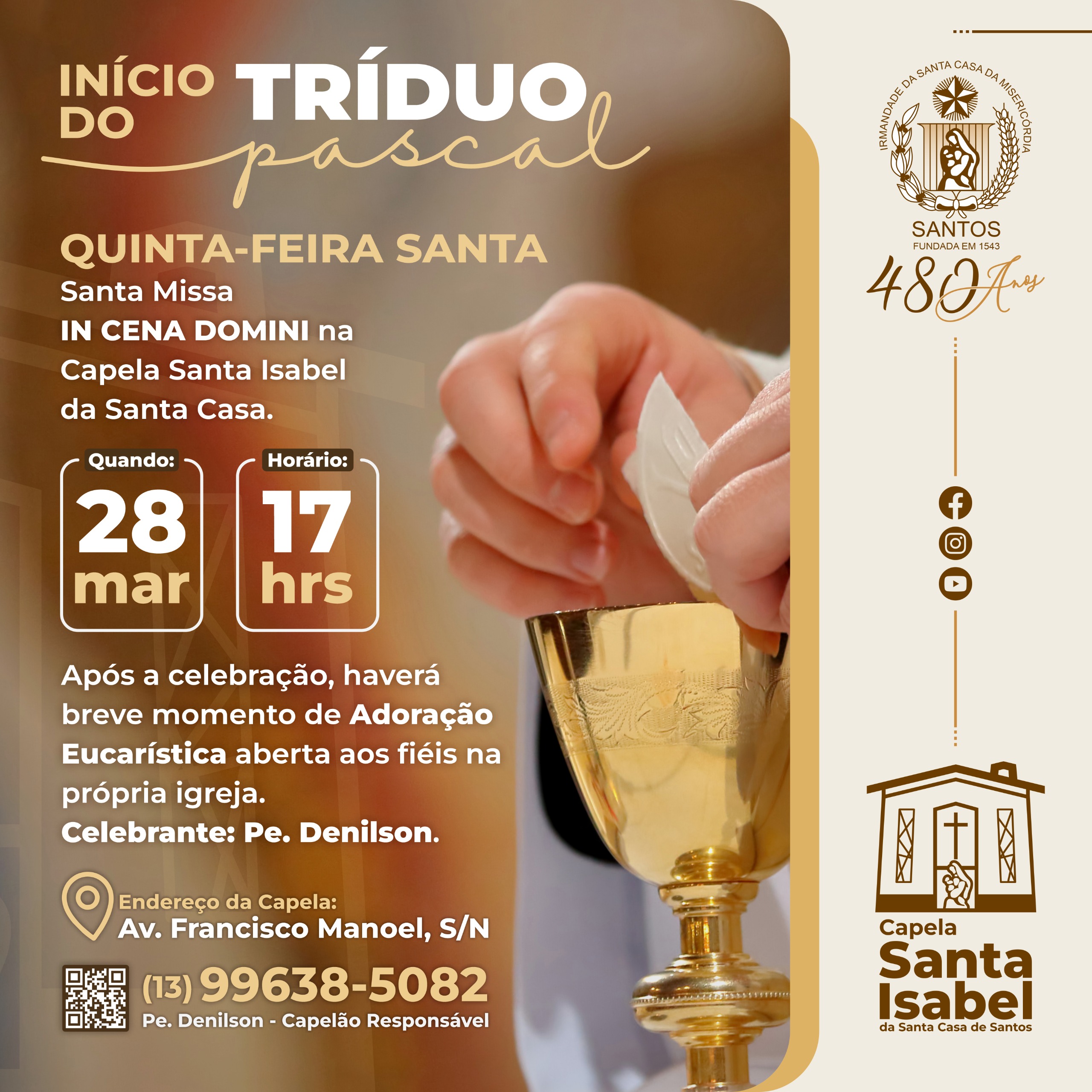 Já na Quinta-Feira Santa, acontecerá o início do Tríduo Pascal, com Santa Missa IN CENA DOMINI, em 28/3, às 17 horas, celebrada pelo Capelão Padre Denilson. Após a celebração, haverá breve momento de Adoração Eucarística aberta aos fiéis na própria igreja.