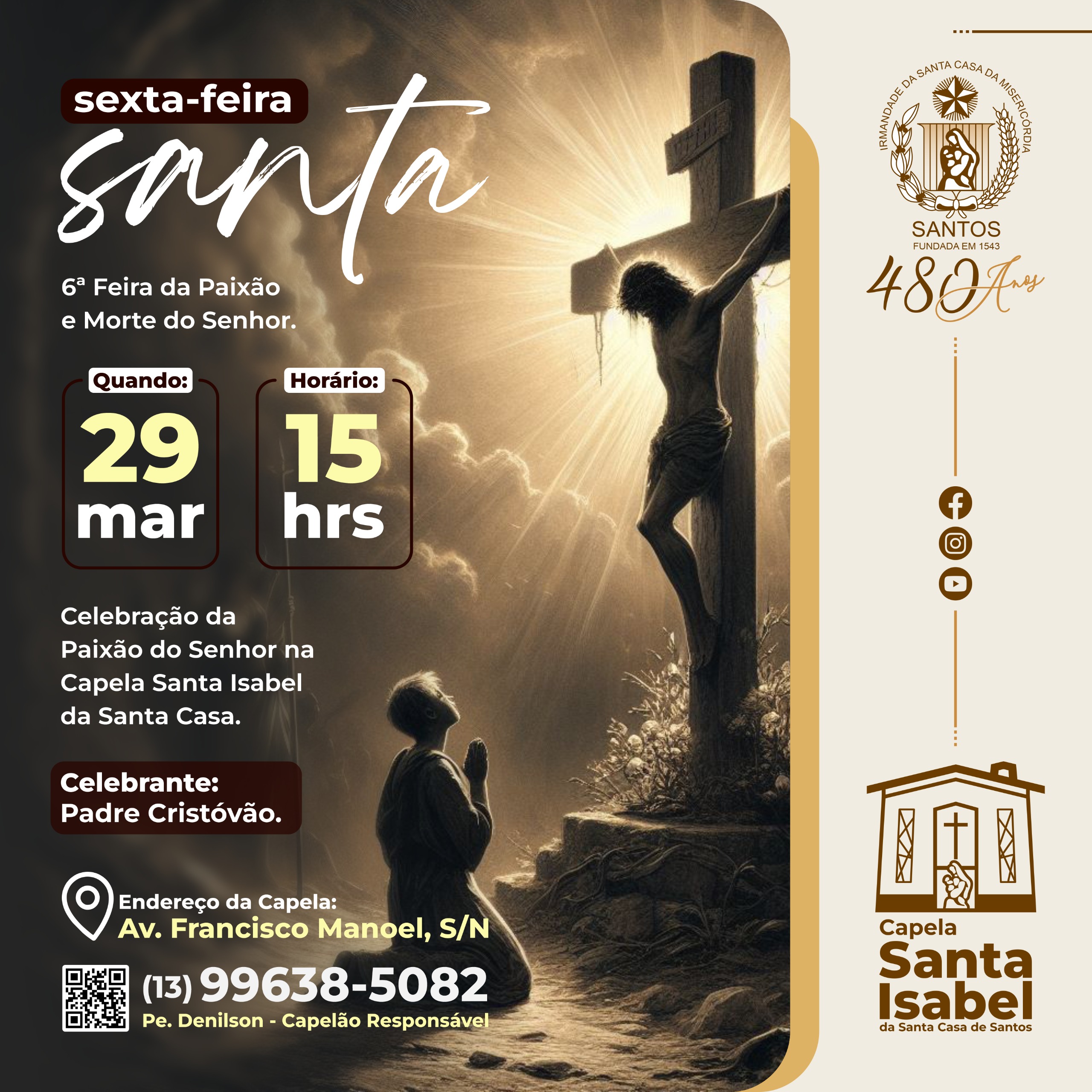 Na Sexta-Feira Santa, ou Sexta-Feira da Paixão, em 29/3, às 15 horas, haverá a celebração da Paixão do Senhor, celebrada pelo Padre Cristóvão.