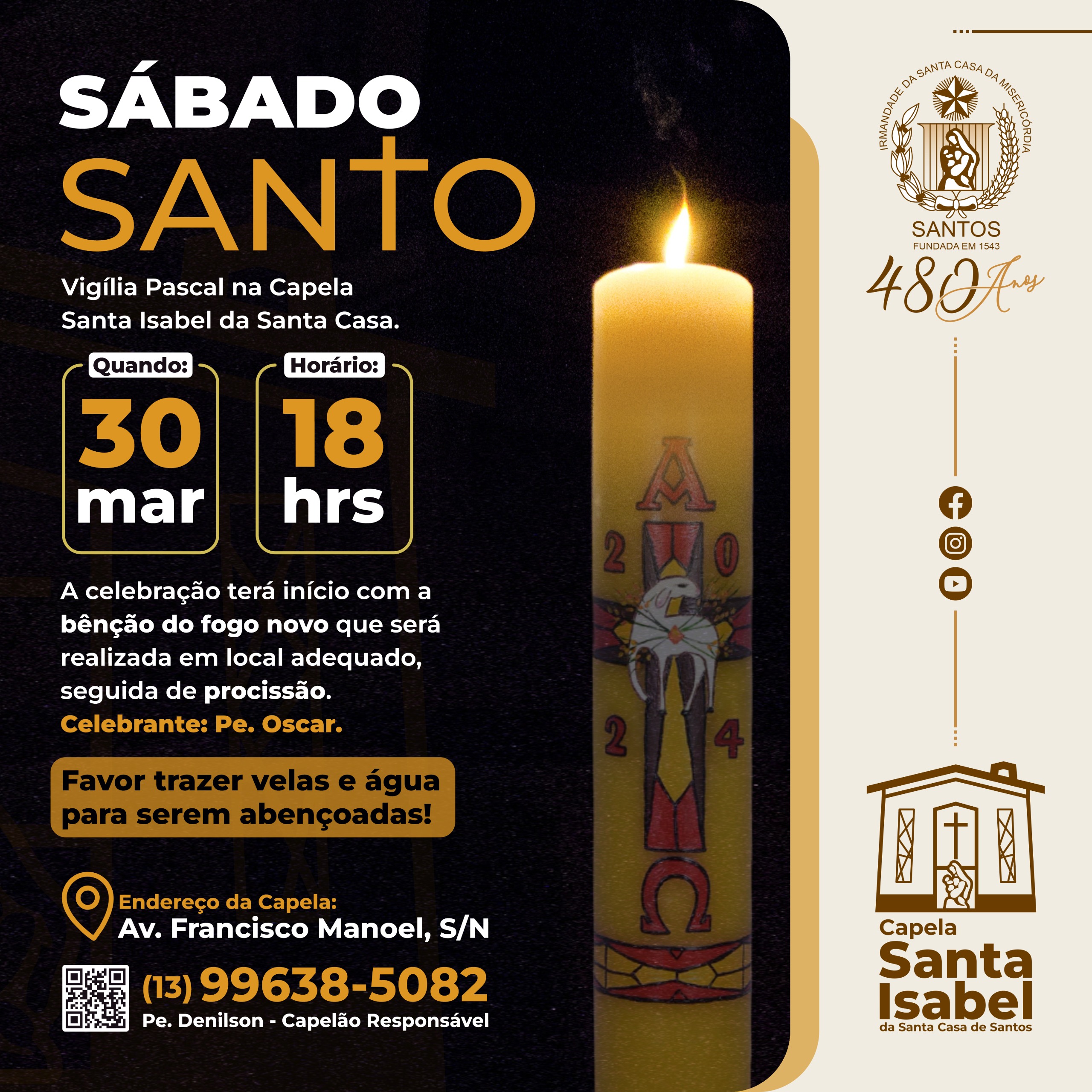 No Sábado Santo, em 30/3, às 18 horas, acontecerá a Vigília Pascal. A celebração terá início com a benção do fogo novo, que será realizada em local adequado, seguida de procissão. Neste dia a Santa Missa será celebrada pelo Padre Oscar. Os fiéis podem levar velas e água para serem abençoadas.