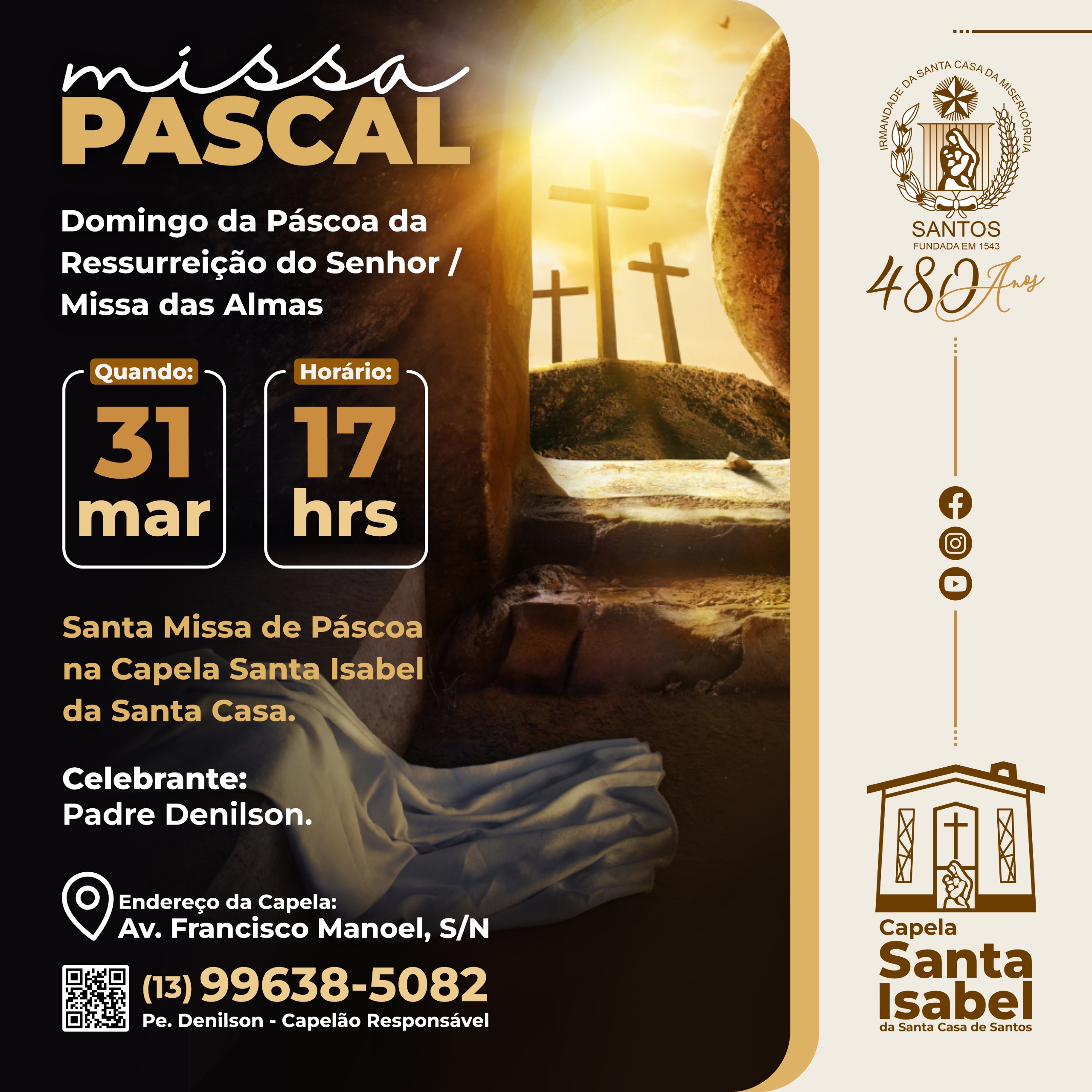 No Domingo de Páscoa da Ressurreição do Senhor, dia 31/3, às 17 horas, acontecerá a Santa Missa de Páscoa, com o celebrante Capelão Padre Denilson.
