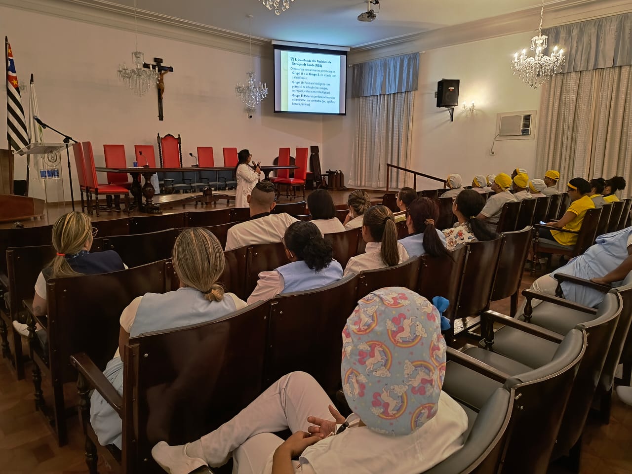 A segunda palestra da programação aconteceu às 19h30, para que os colaboradores do período noturno pudessem participar. O tema abordado foi Biossegurança no Ambiente de Trabalho e Prevenção de ISTs, com a Enfª. Olívia Guedes Silva, do Serviço de Controle de Infecção Hospitalar.