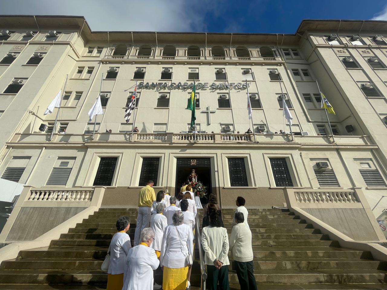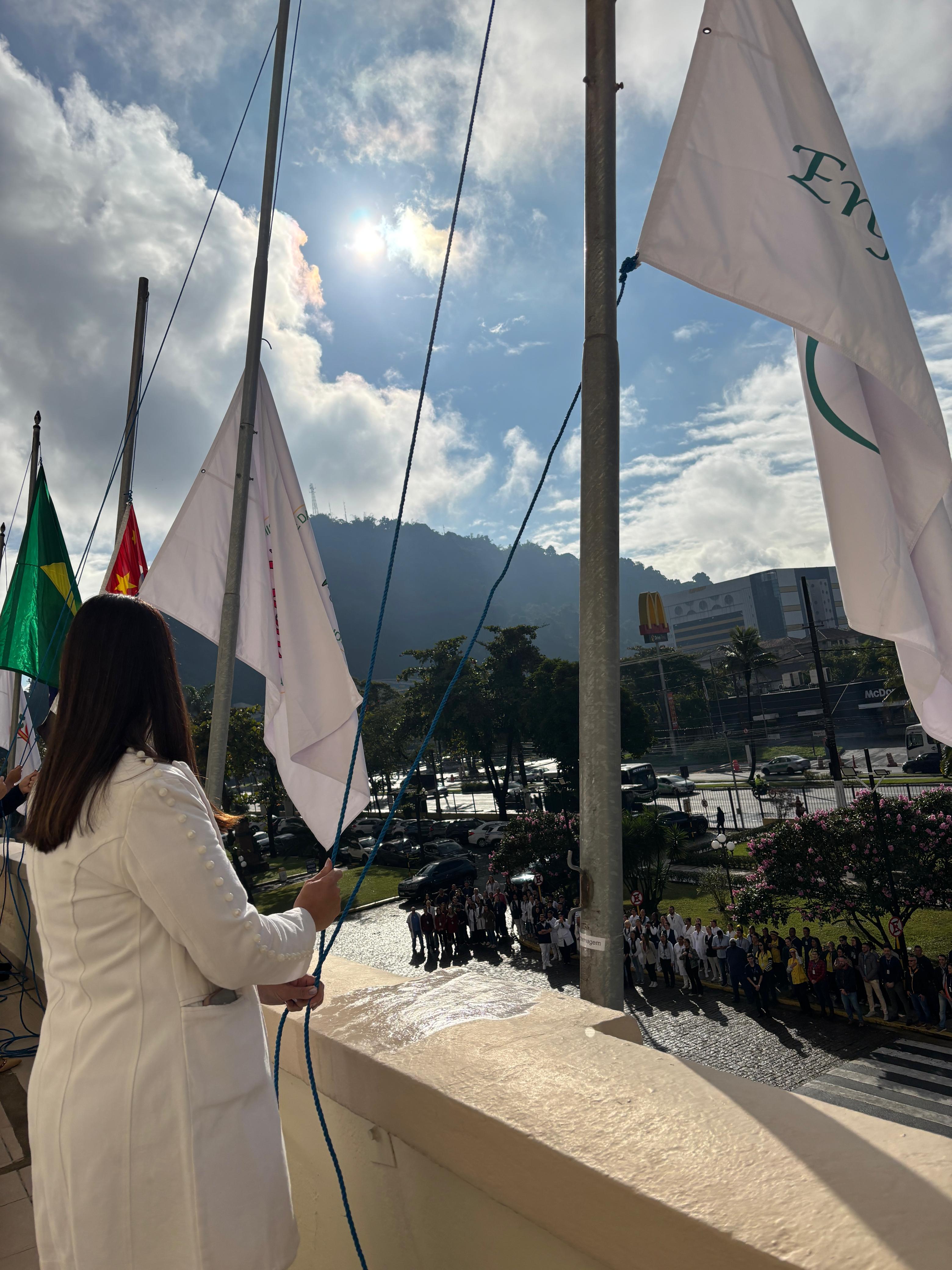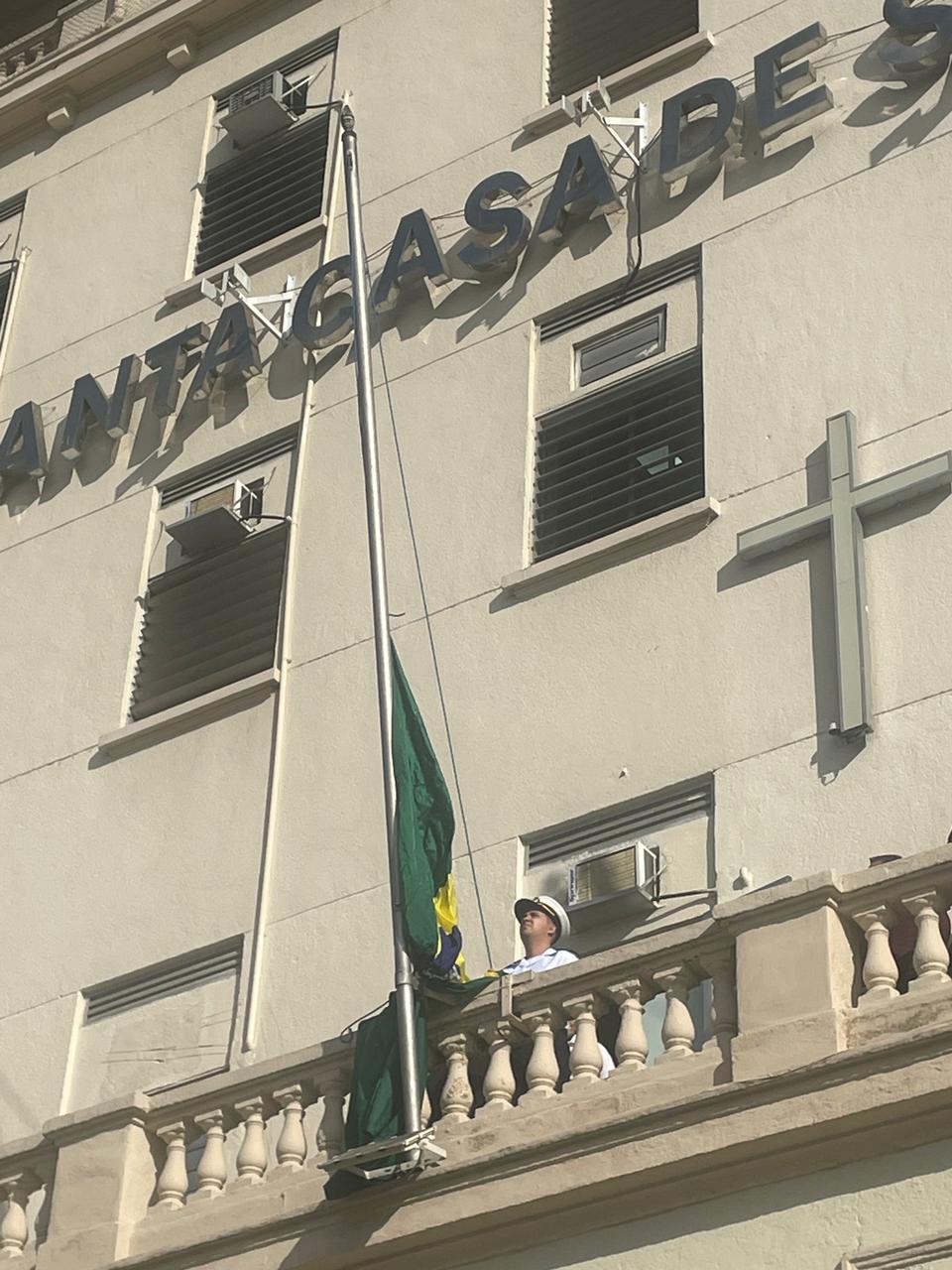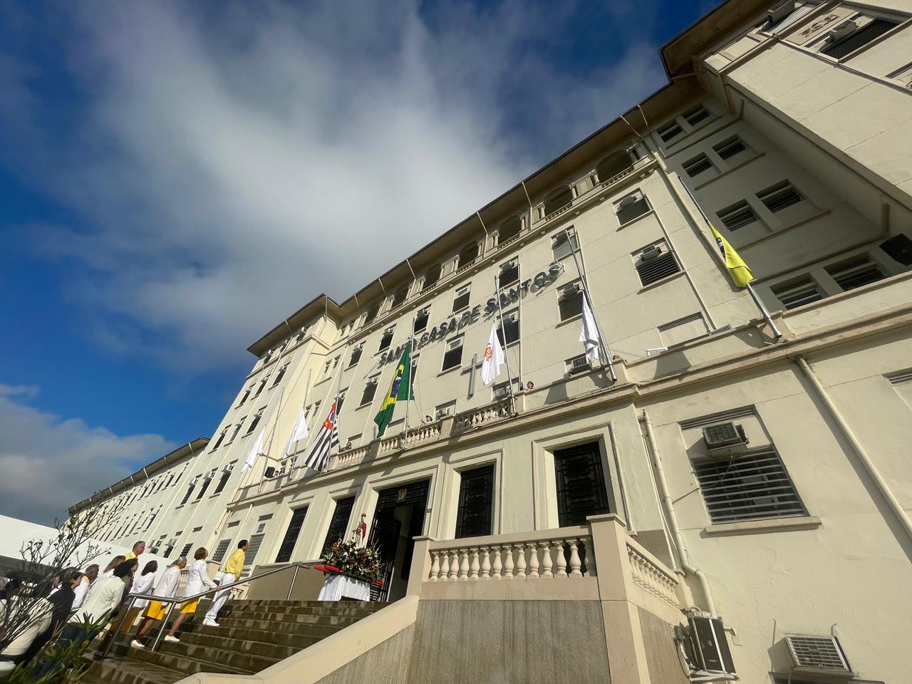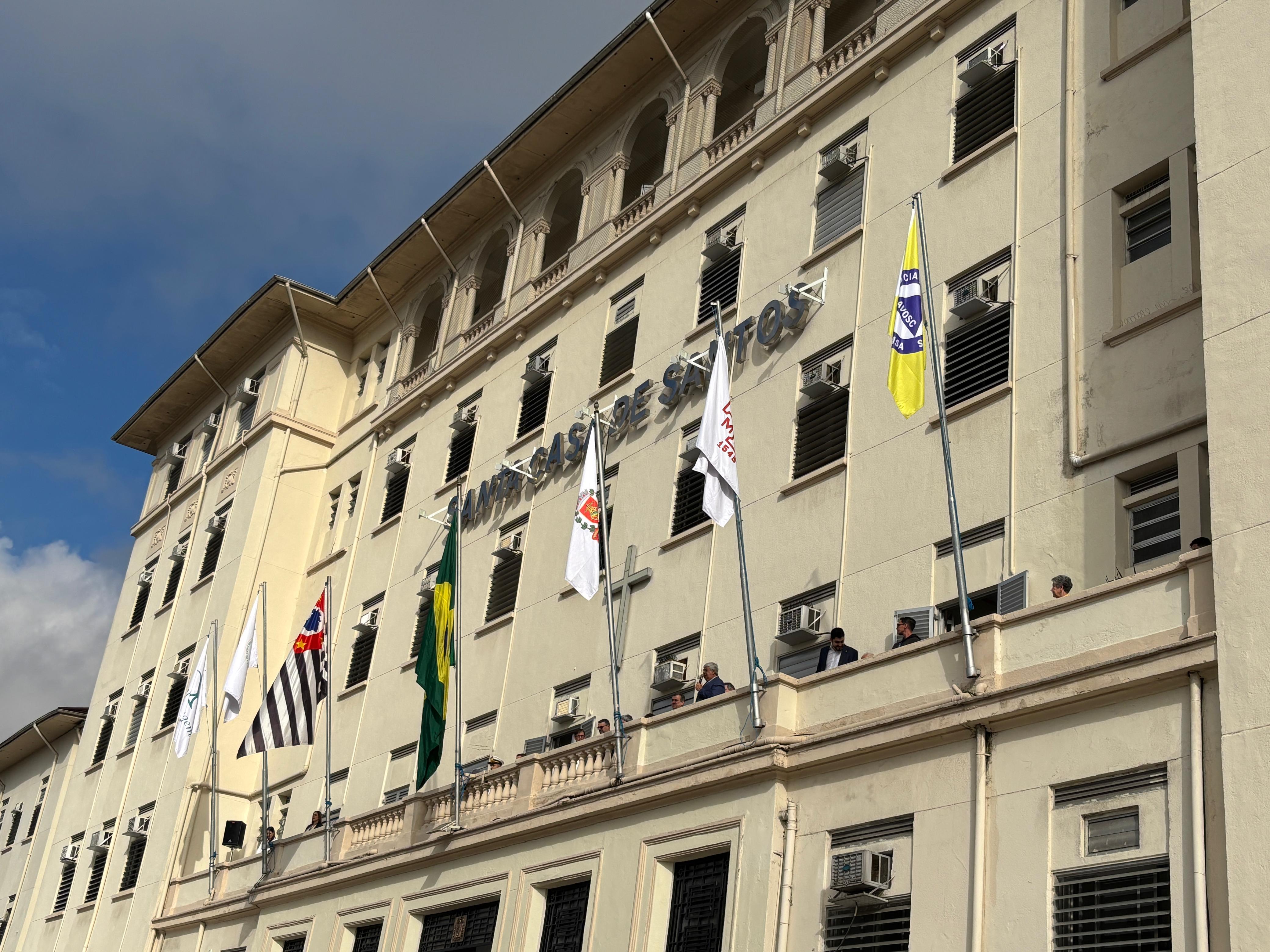 Da sacada da Santa Casa, gestores e membros da Mesa Administrativa realizaram o hasteamento das bandeiras, conforme segue: Representando o Capitão de Mar e guerra, o 2º Tenente Victor Hugo Santos Vaz Leite (Bandeira Nacional); Tenente João Batista (Bandeira do Estado de São Paulo); representando a prefeitura de Santos, o assessor da Secretaria de Saúde, Braz Antunes Mattos Neto (Bandeira de Santos); o vice-provedor Carlos Teixeira Filho (Bandeira da Santa Casa); Enfª Rita Rocha (Bandeira da Enfermagem); Ana Carolina Costa (Bandeira da Comissão de Controle da Qualidade) e Maria Emília (Bandeira da AVOSC).