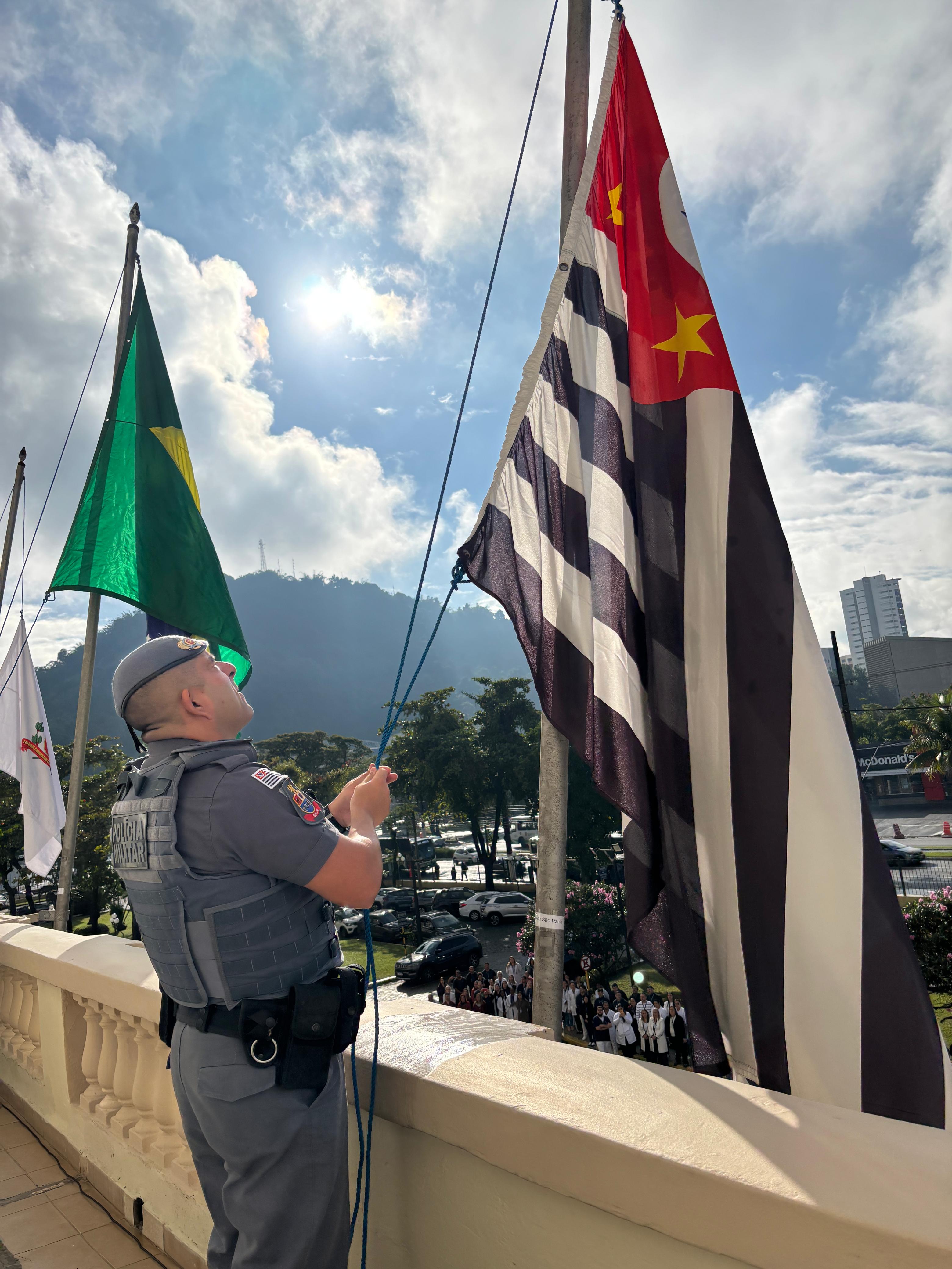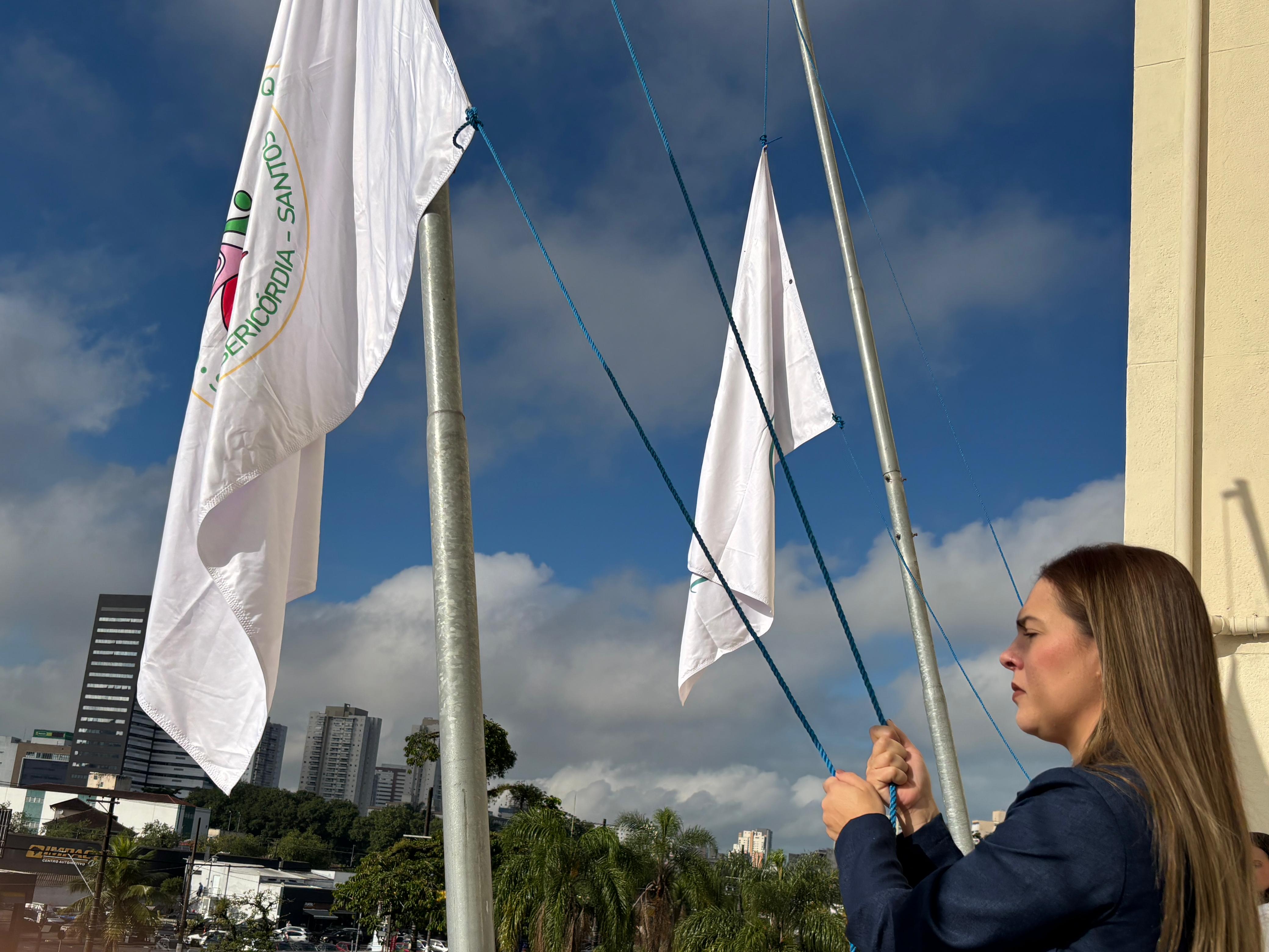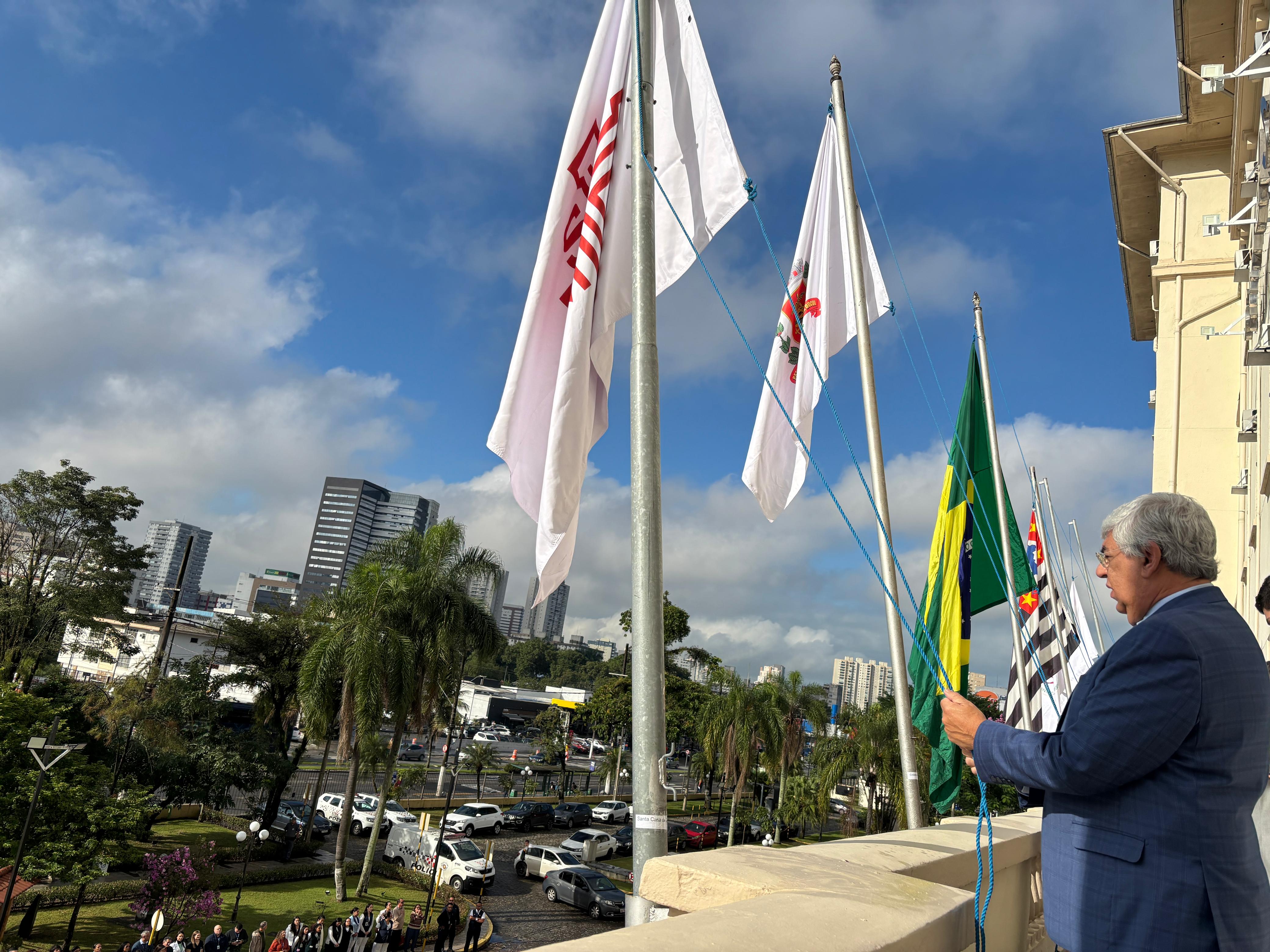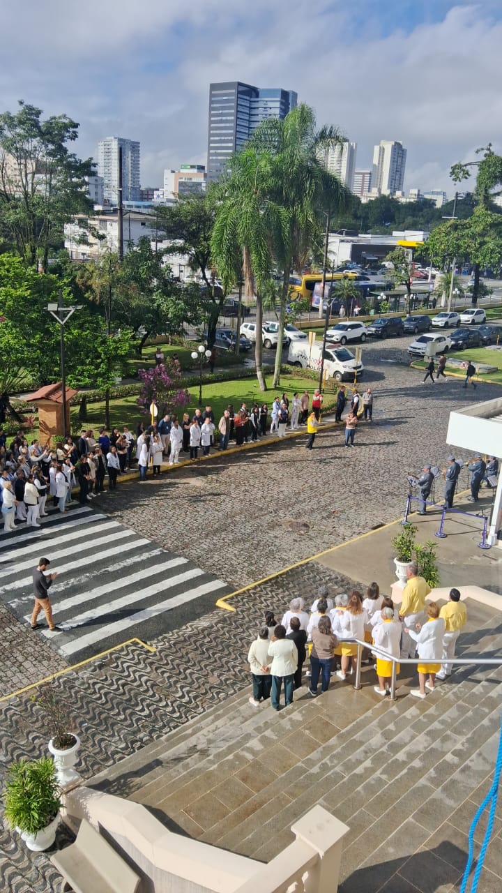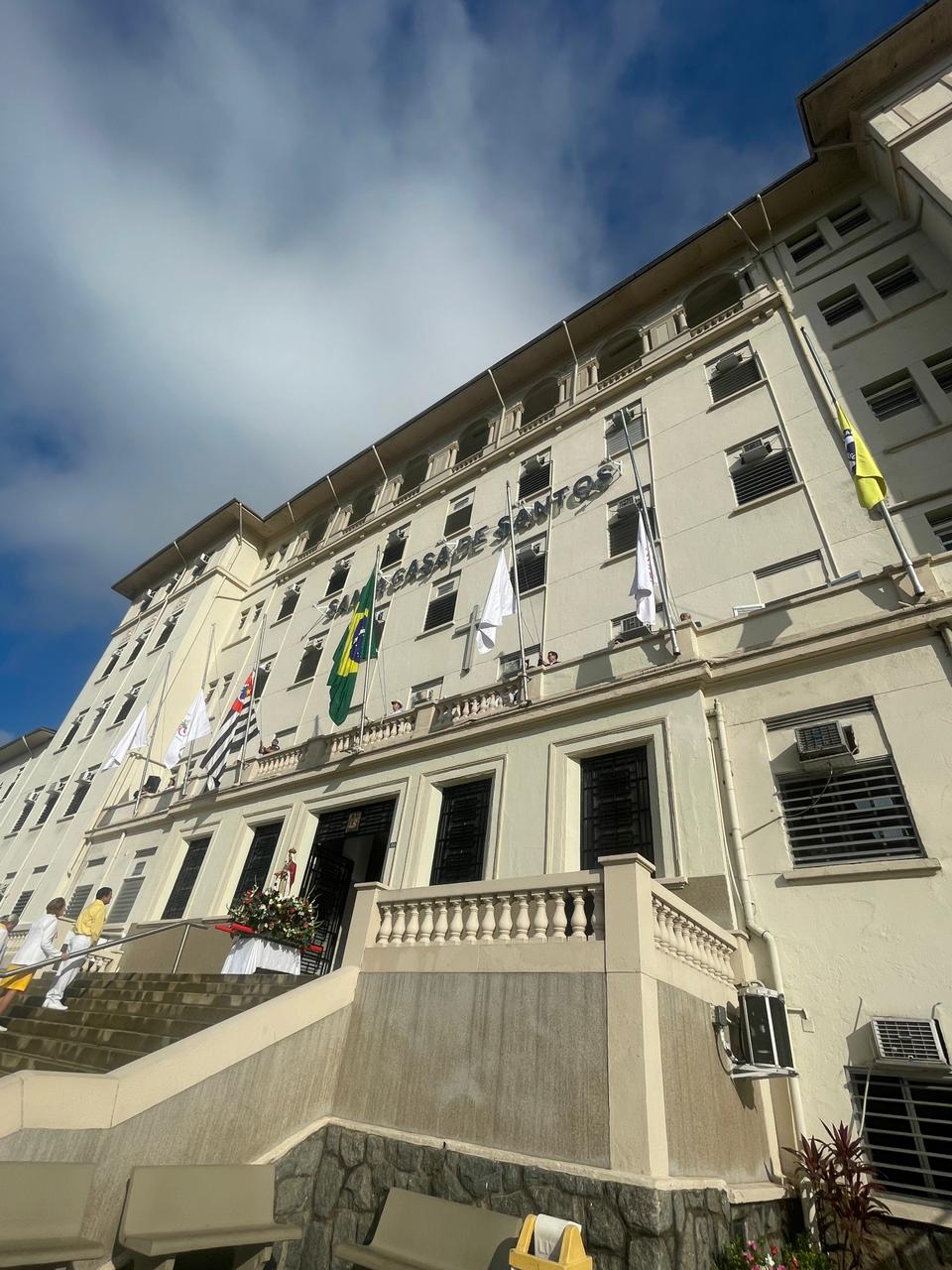 Da sacada da Santa Casa, gestores e membros da Mesa Administrativa realizaram o hasteamento das bandeiras, conforme segue: Representando o Capitão de Mar e guerra, o 2º Tenente Victor Hugo Santos Vaz Leite (Bandeira Nacional); Tenente João Batista (Bandeira do Estado de São Paulo); representando a prefeitura de Santos, o assessor da Secretaria de Saúde, Braz Antunes Mattos Neto (Bandeira de Santos); o vice-provedor Carlos Teixeira Filho (Bandeira da Santa Casa); Enfª Rita Rocha (Bandeira da Enfermagem); Ana Carolina Costa (Bandeira da Comissão de Controle da Qualidade) e Maria Emília (Bandeira da AVOSC).
