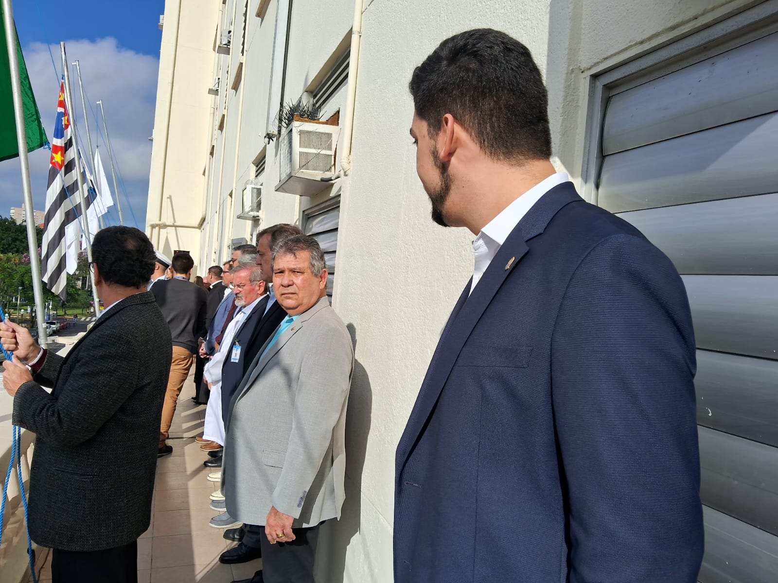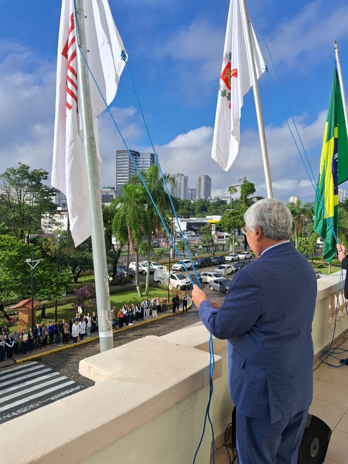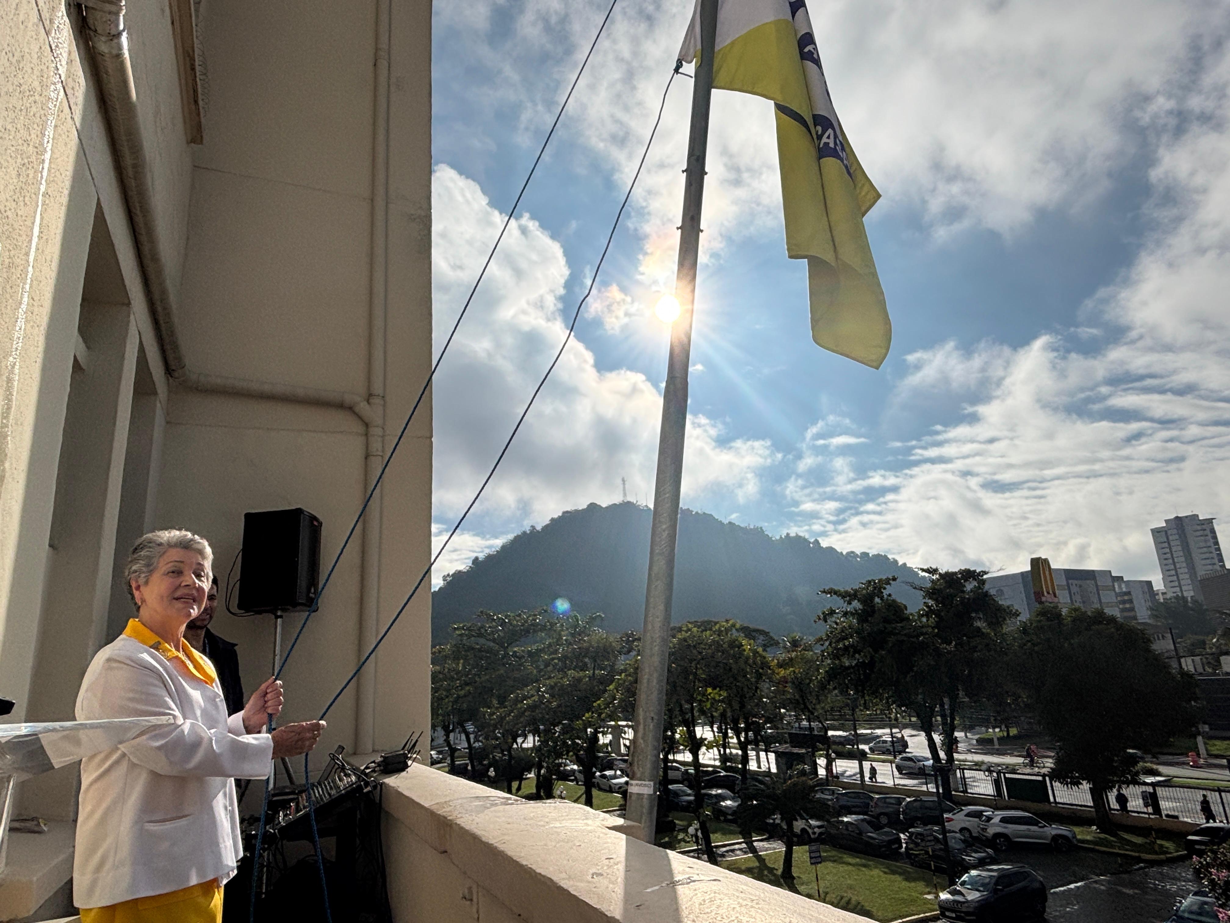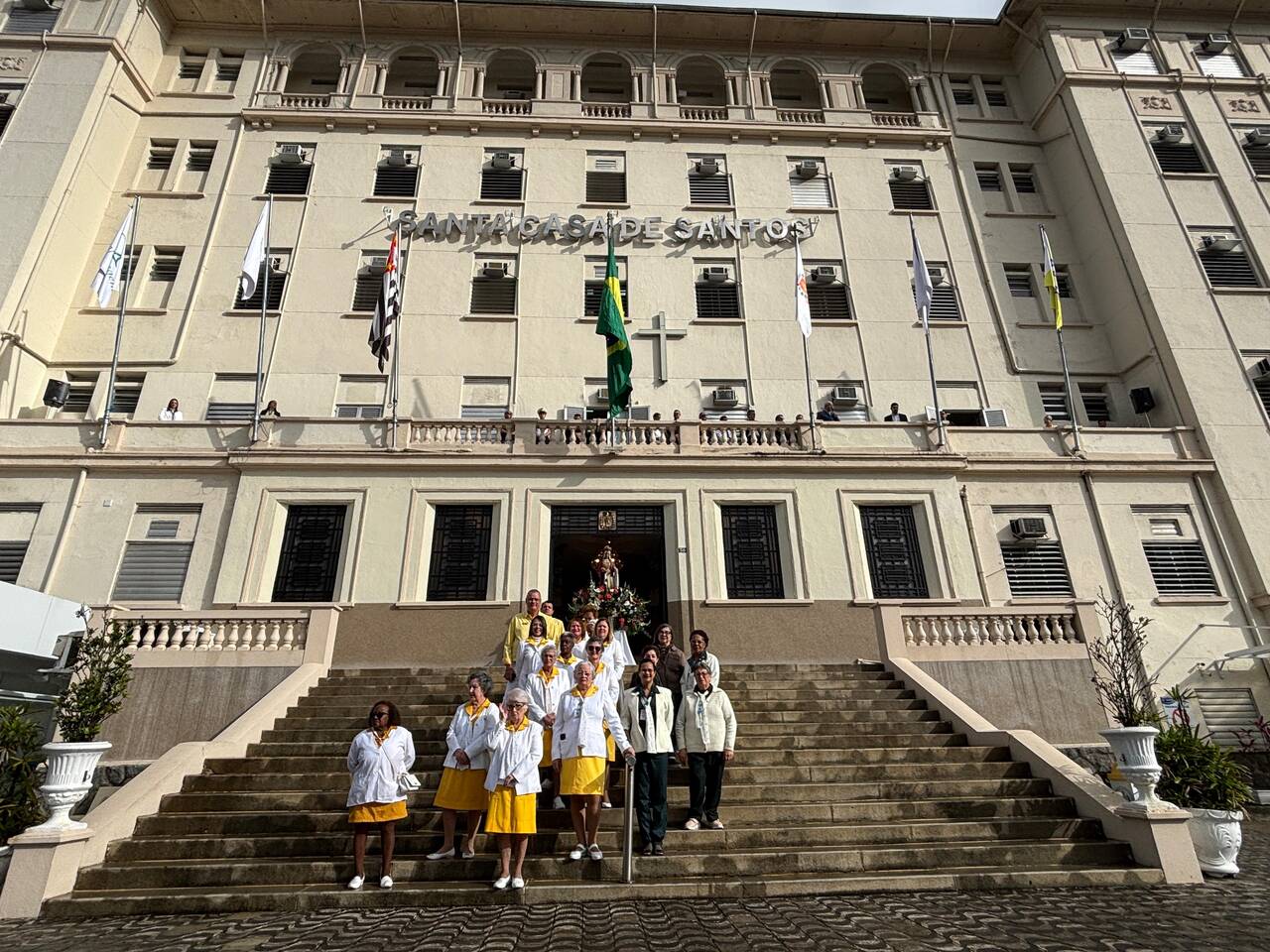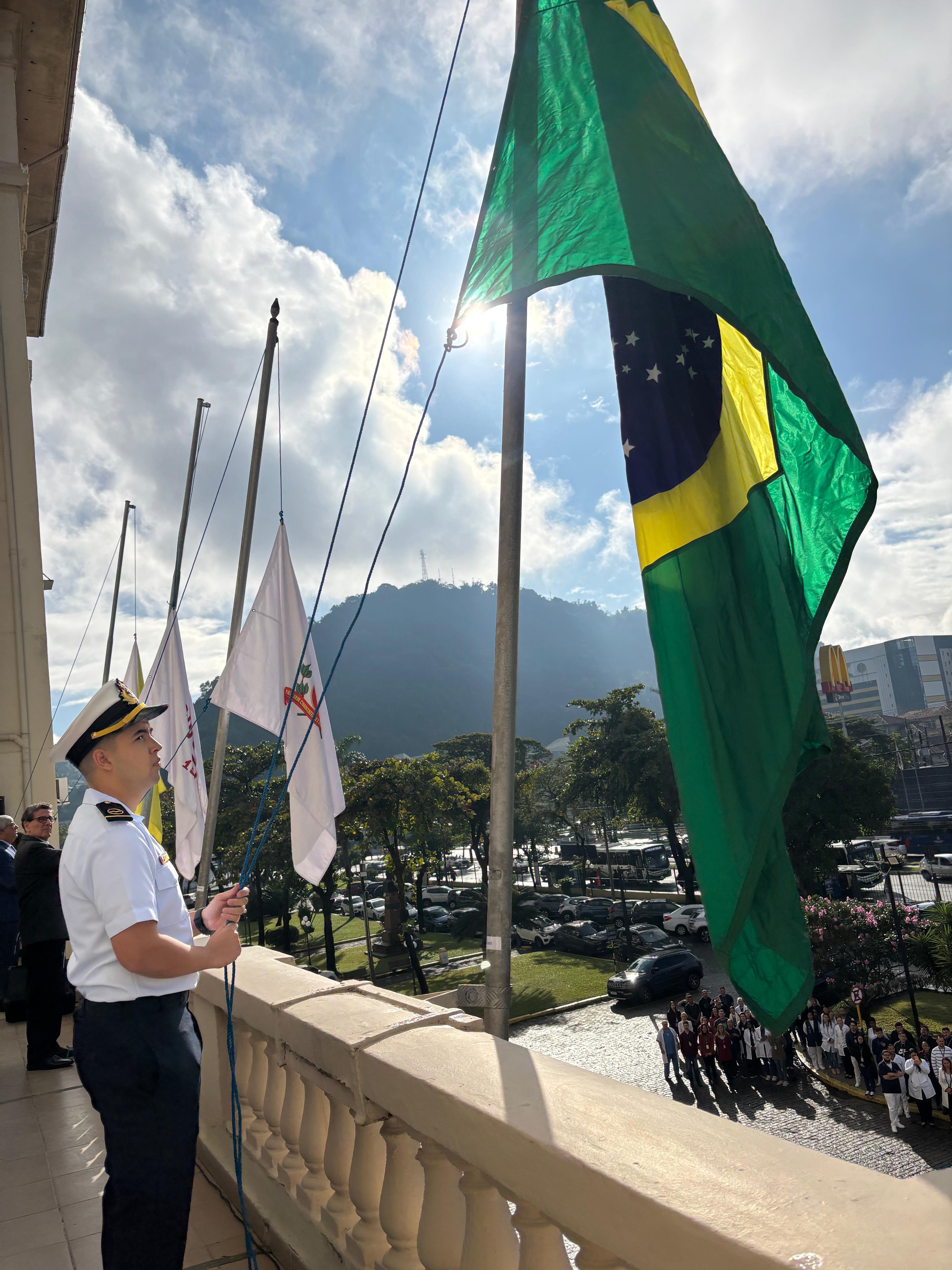 Da sacada da Santa Casa, gestores e membros da Mesa Administrativa realizaram o hasteamento das bandeiras, conforme segue: Representando o Capitão de Mar e guerra, o 2º Tenente Victor Hugo Santos Vaz Leite (Bandeira Nacional); Tenente João Batista (Bandeira do Estado de São Paulo); representando a prefeitura de Santos, o assessor da Secretaria de Saúde, Braz Antunes Mattos Neto (Bandeira de Santos); o vice-provedor Carlos Teixeira Filho (Bandeira da Santa Casa); Enfª Rita Rocha (Bandeira da Enfermagem); Ana Carolina Costa (Bandeira da Comissão de Controle da Qualidade) e Maria Emília (Bandeira da AVOSC).
