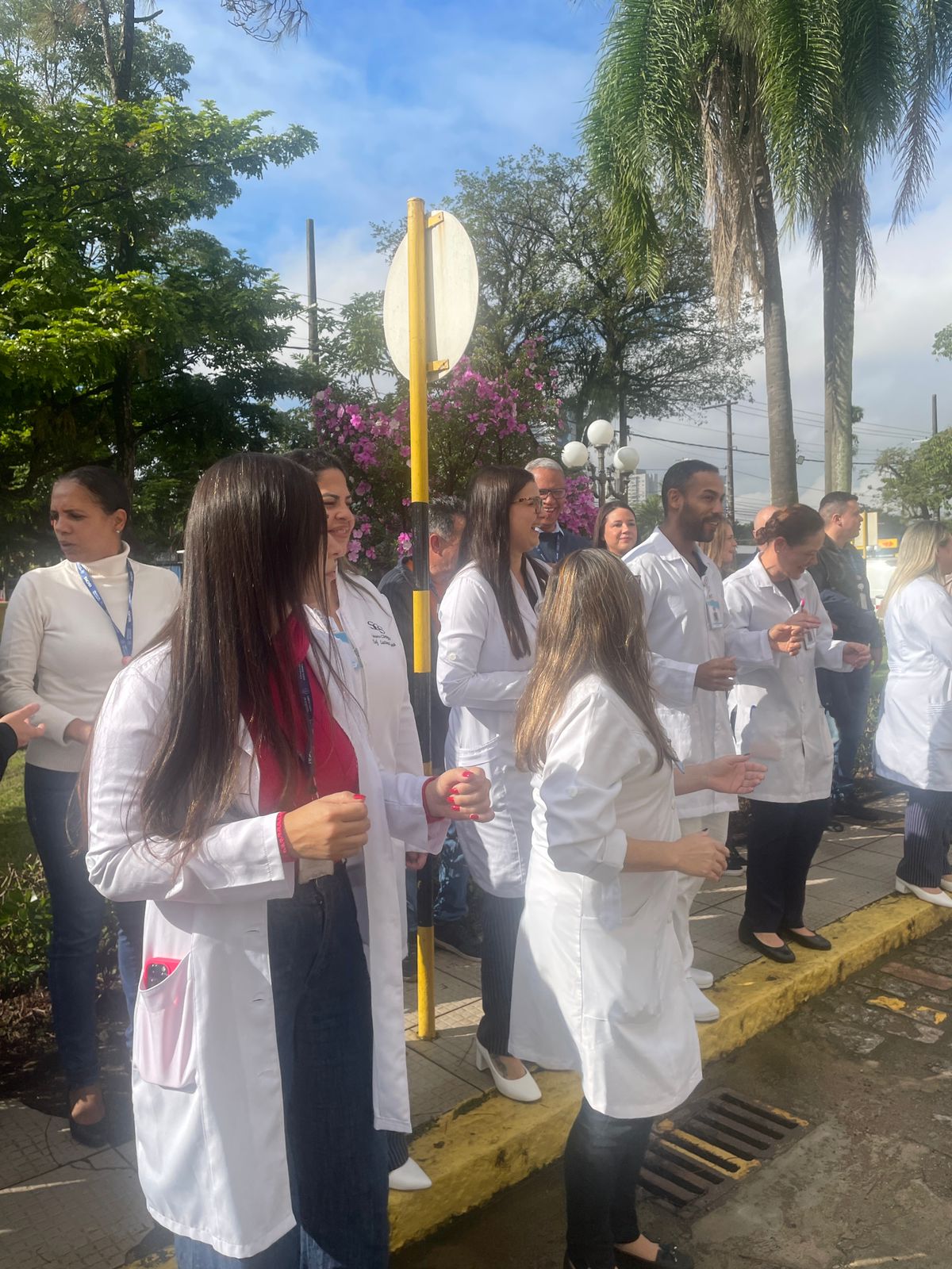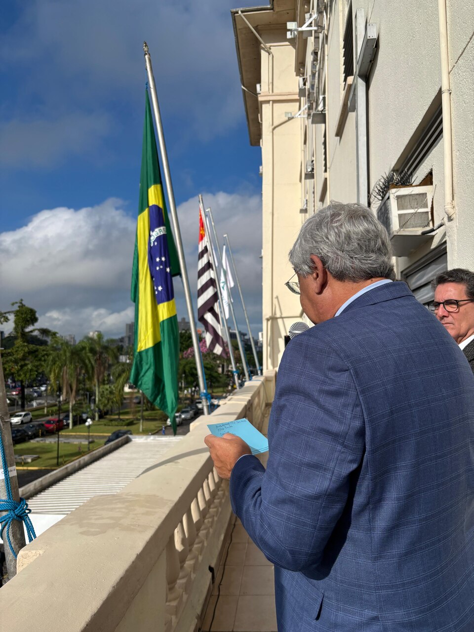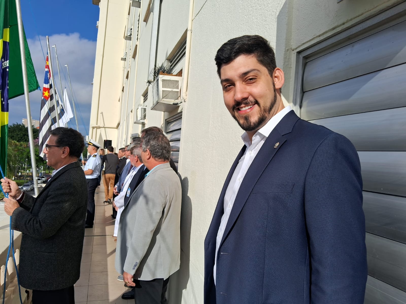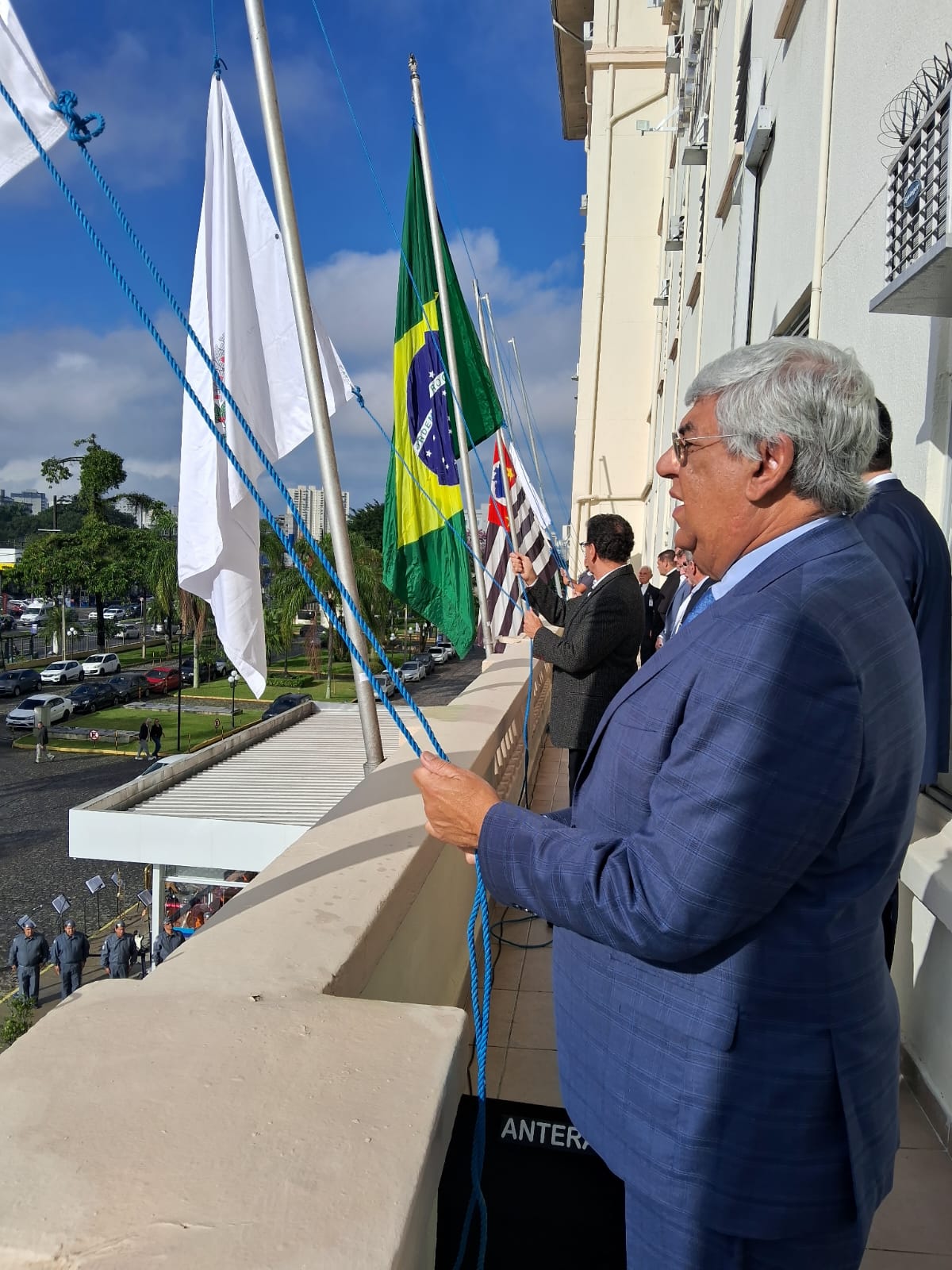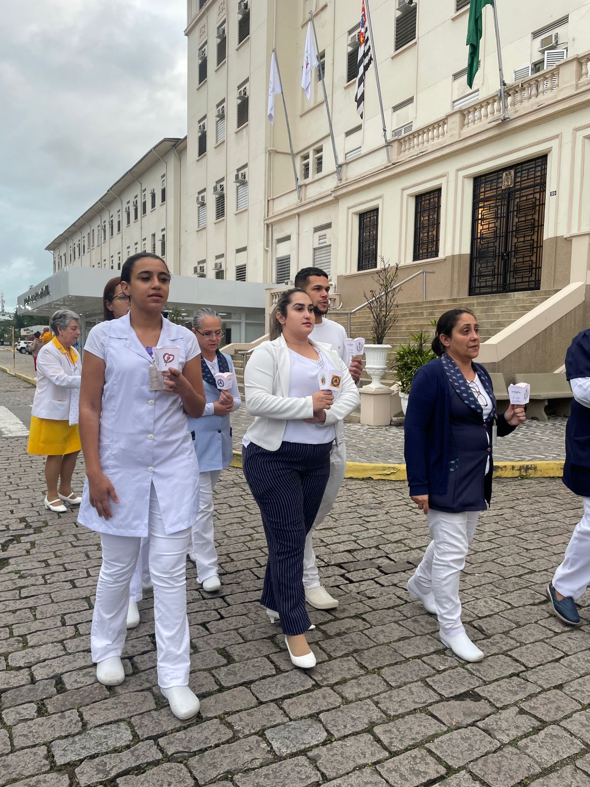 Da sacada da Santa Casa, gestores e membros da Mesa Administrativa realizaram o hasteamento das bandeiras, conforme segue: Representando o Capitão de Mar e guerra, o 2º Tenente Victor Hugo Santos Vaz Leite (Bandeira Nacional); Tenente João Batista (Bandeira do Estado de São Paulo); representando a prefeitura de Santos, o assessor da Secretaria de Saúde, Braz Antunes Mattos Neto (Bandeira de Santos); o vice-provedor Carlos Teixeira Filho (Bandeira da Santa Casa); Enfª Rita Rocha (Bandeira da Enfermagem); Ana Carolina Costa (Bandeira da Comissão de Controle da Qualidade) e Maria Emília (Bandeira da AVOSC).