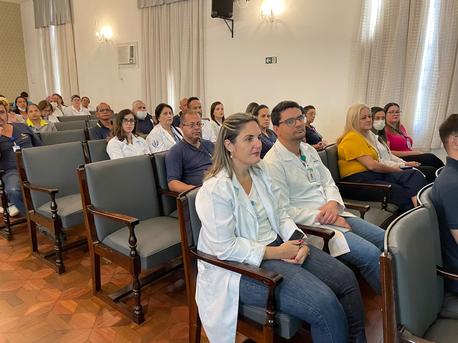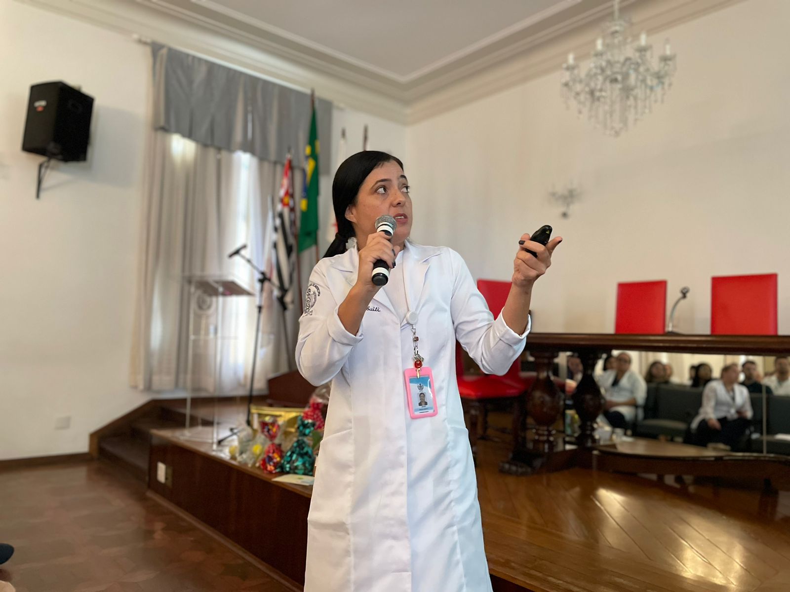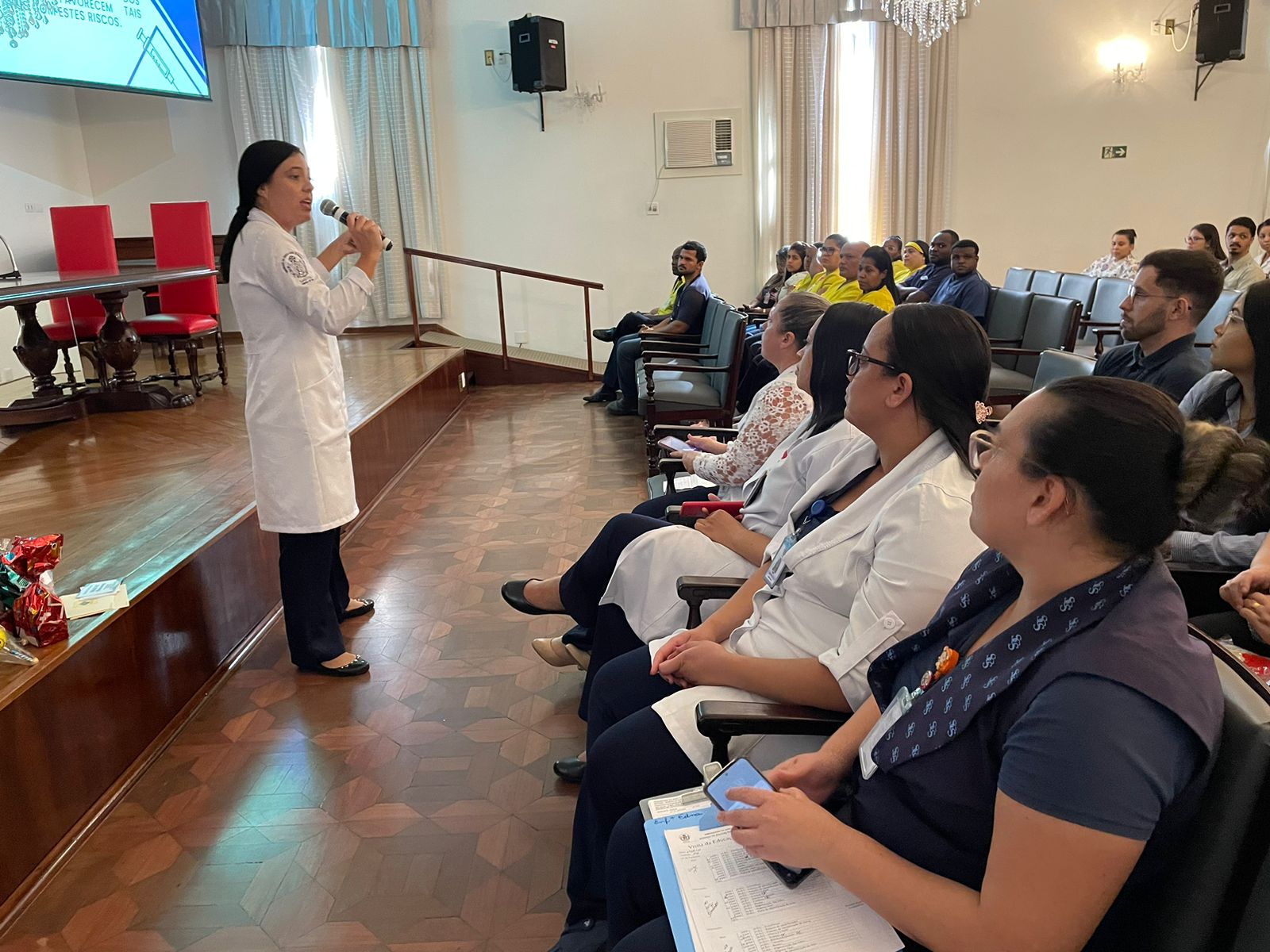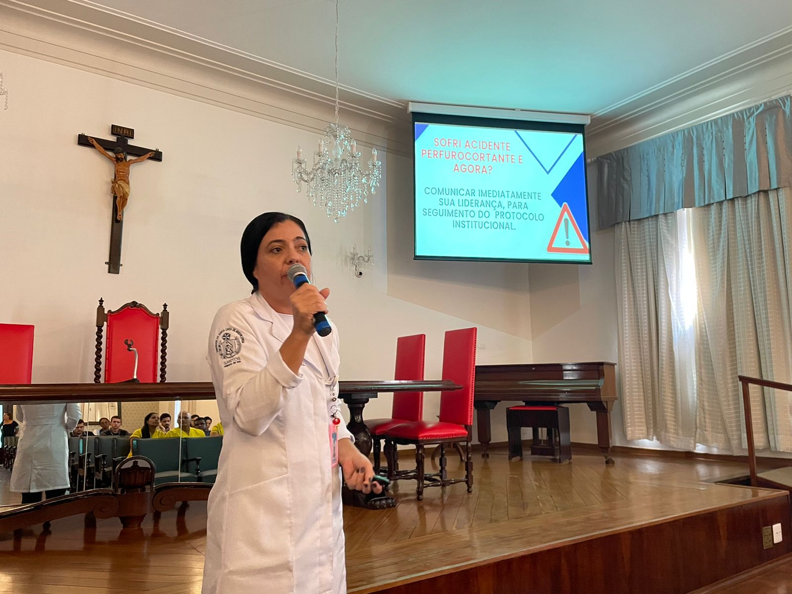 Nas palestras desta quarta, dia 19/4, a Enfª. Nivea Sbaiti, da Educação Continuada, explicou sobre situações que provocam acidentes com materiais perfuro cortantes, e também orientou sobre o uso adequado e montagem correta das caixas coletoras “Descarpack”.
