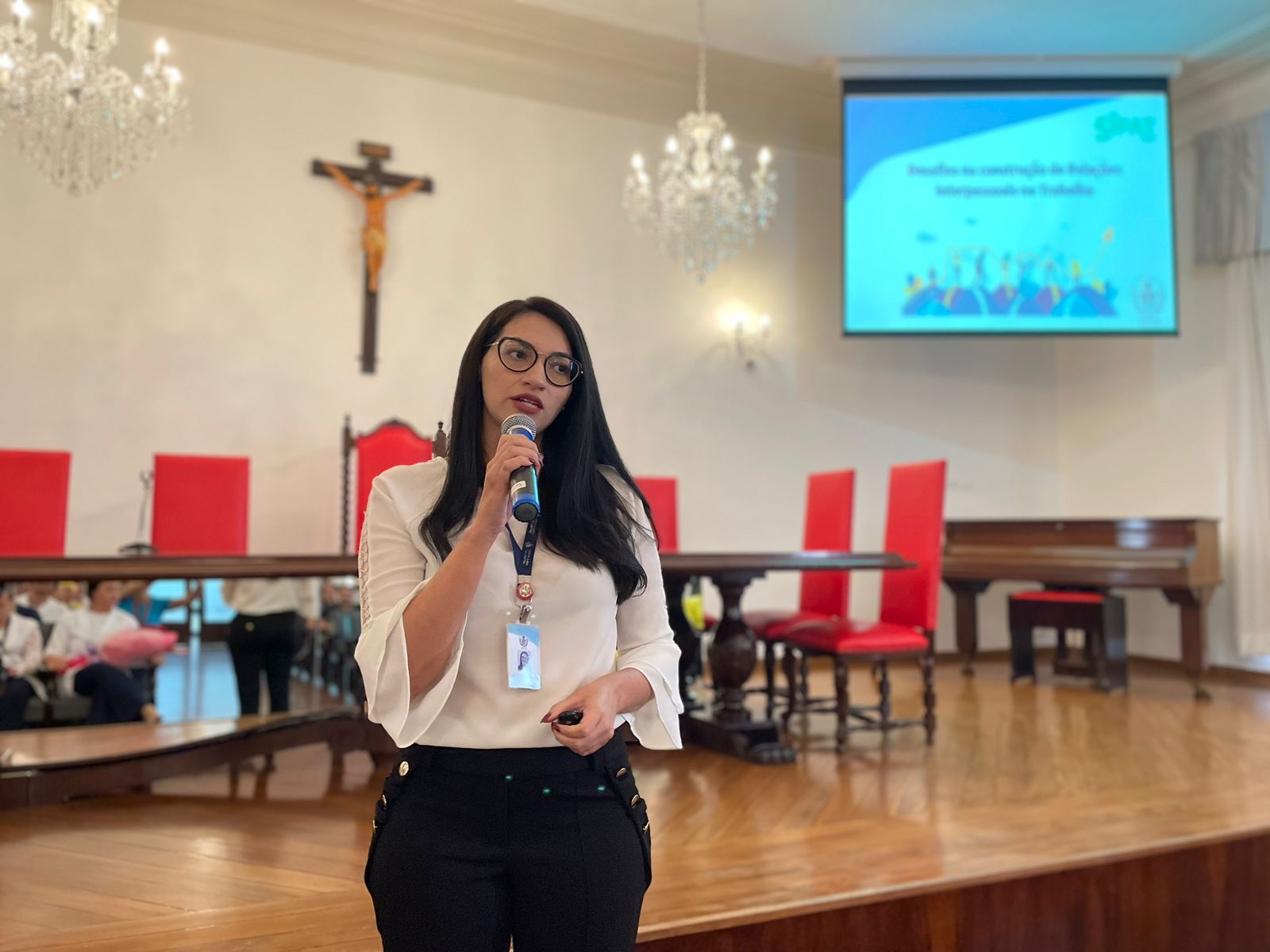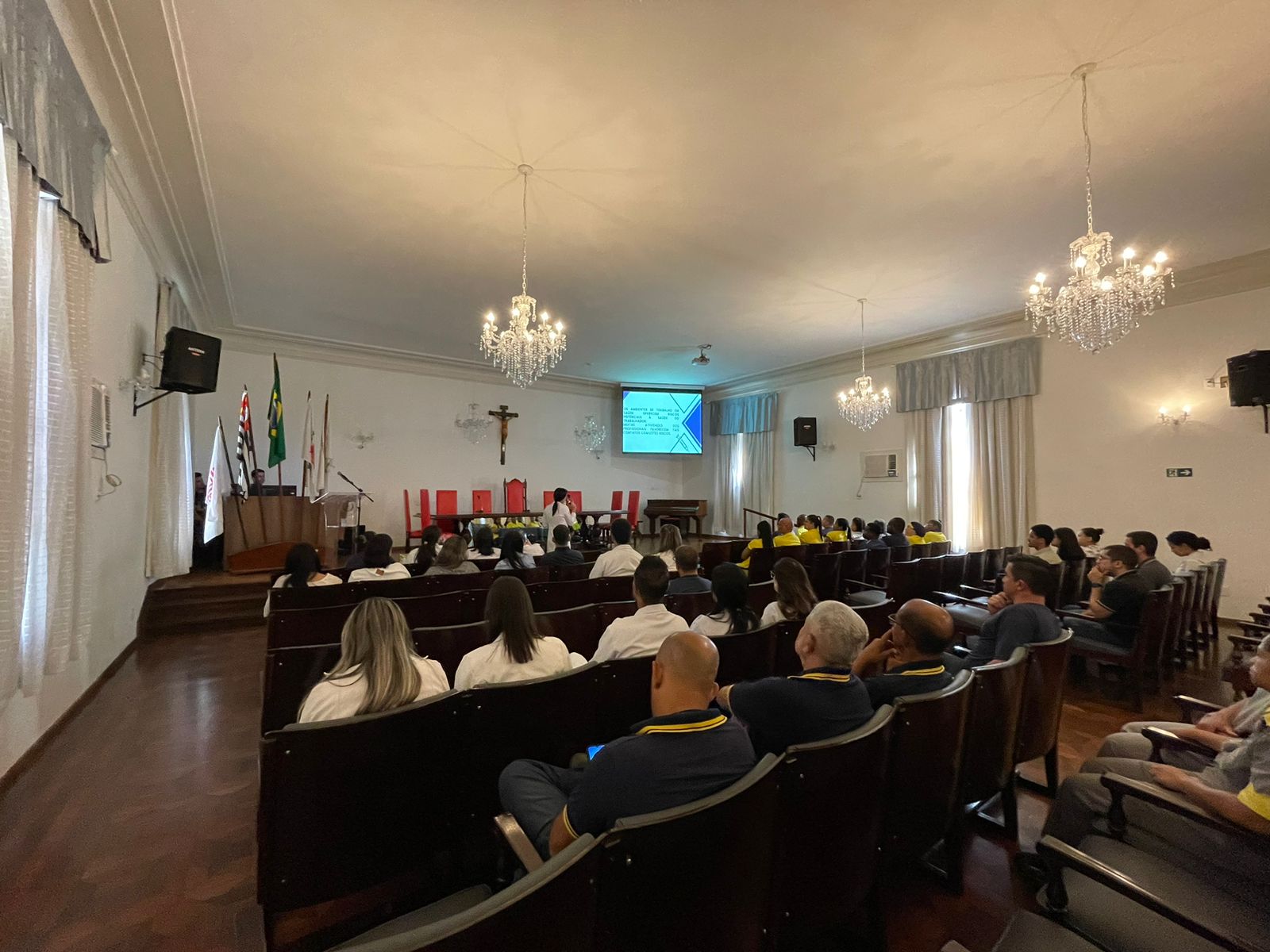 Na sequência, foi a vez da analista de RH, Ana Paula Moyano, falar dos desafios da construção de relações interpessoais no trabalho, e destacou a importância da ética profissional e comunicação assertiva. O assunto foi finalizado com uma dinâmica de grupo, onde os maus pensamentos deveriam ser soprados em uma bexiga escura, a qual teria como destino o lixo. Já os pensamentos e palavras positivas foram soprados em uma bexiga colorida, a qual deveria ser jogada no ar e compartilhada com os presentes. O momento lúdico alegrou o consistório e divertiu a todos com a brincadeira.