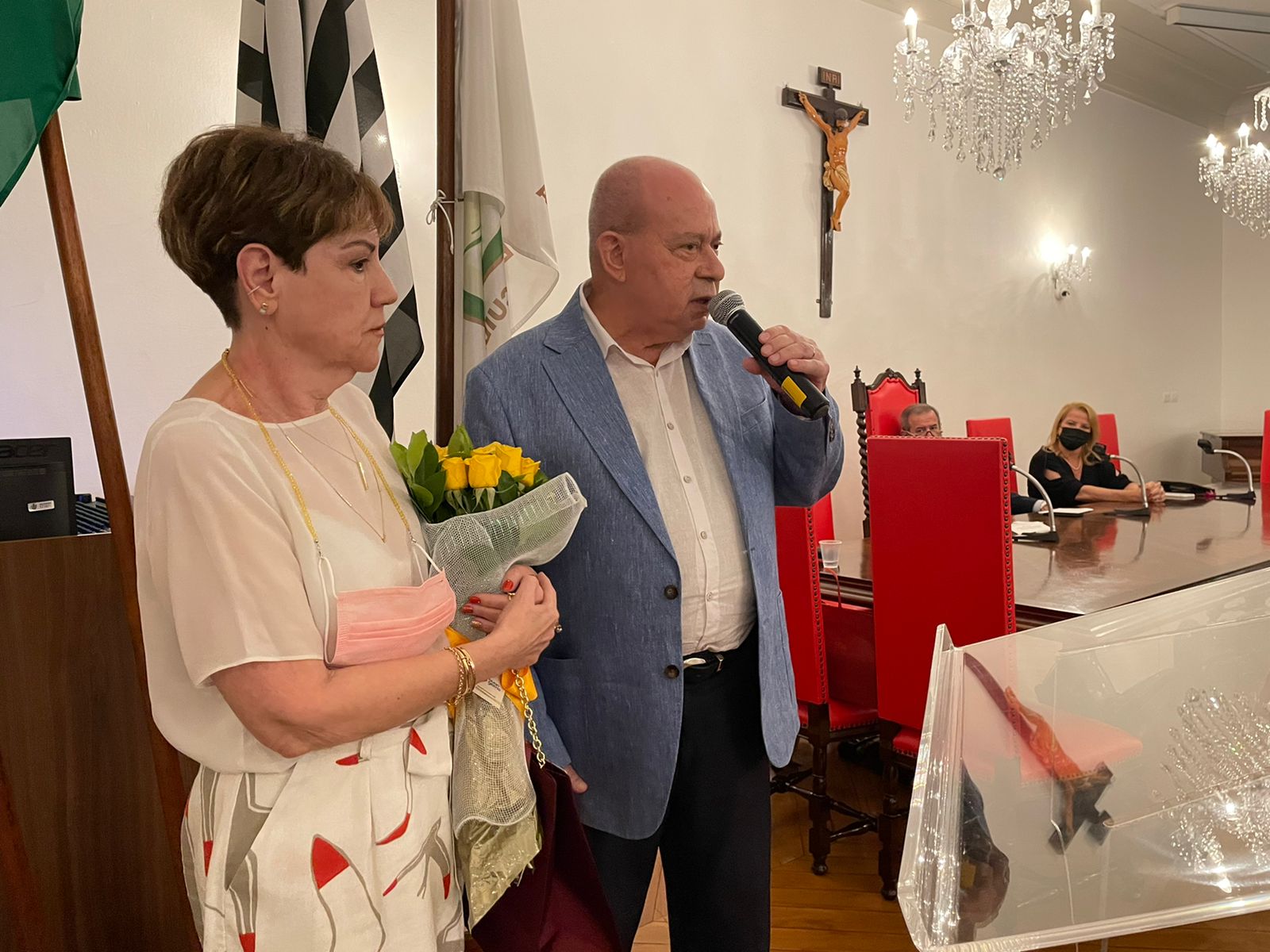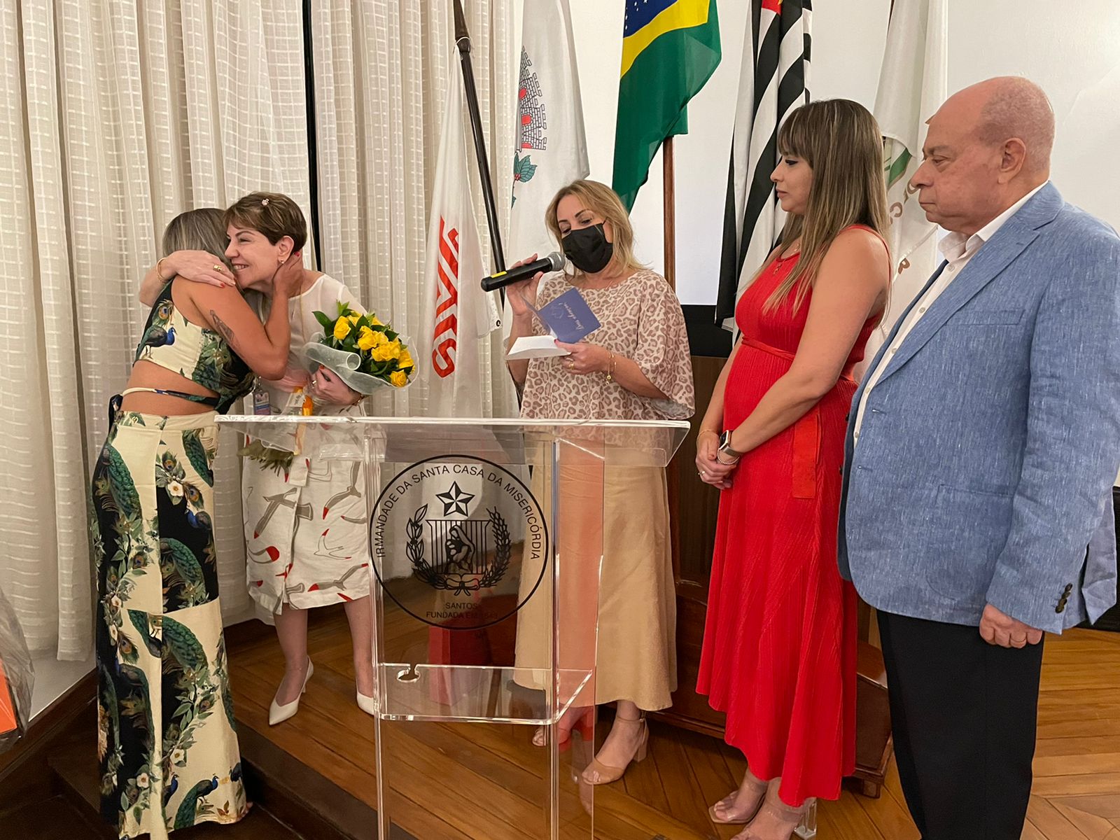 O provedor Ariovaldo Feliciano e a voluntária verdinha, Karilyn Lopes Feliciano, fizeram uma homenagem surpresa para a Presidente da Comissão de Controle da Qualidade (CCQ), Eliana Lopes Feliciano, enaltecendo o trabalho realizado na Santa Casa de Santos. Dona Eliana, como é carinhosamente conhecida, recebeu das mãos da gerente de enfermagem, Alessandra Shepis um buquê de flores, em agradecimento à atuação junto com a enfermagem do hospital.