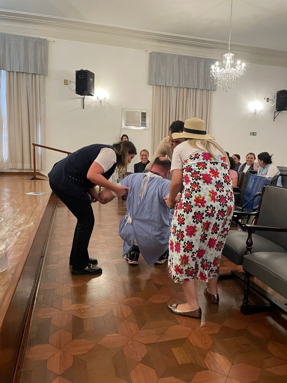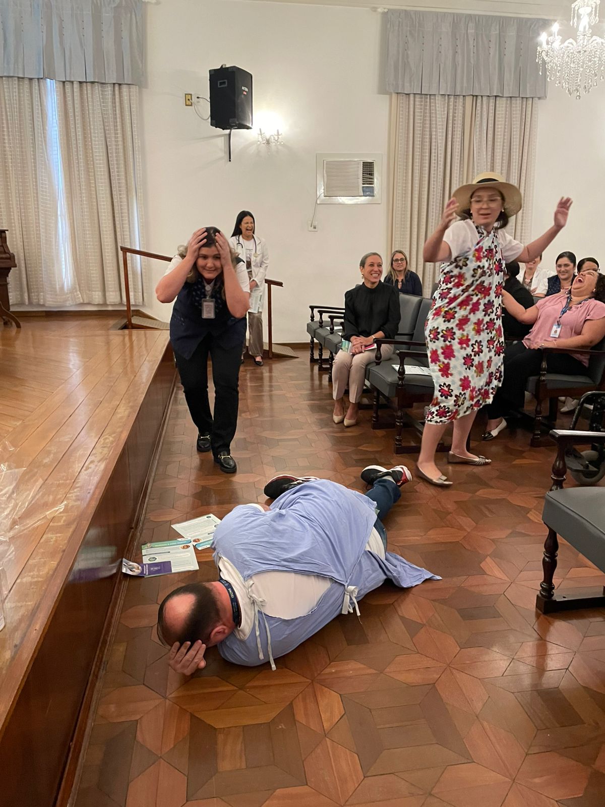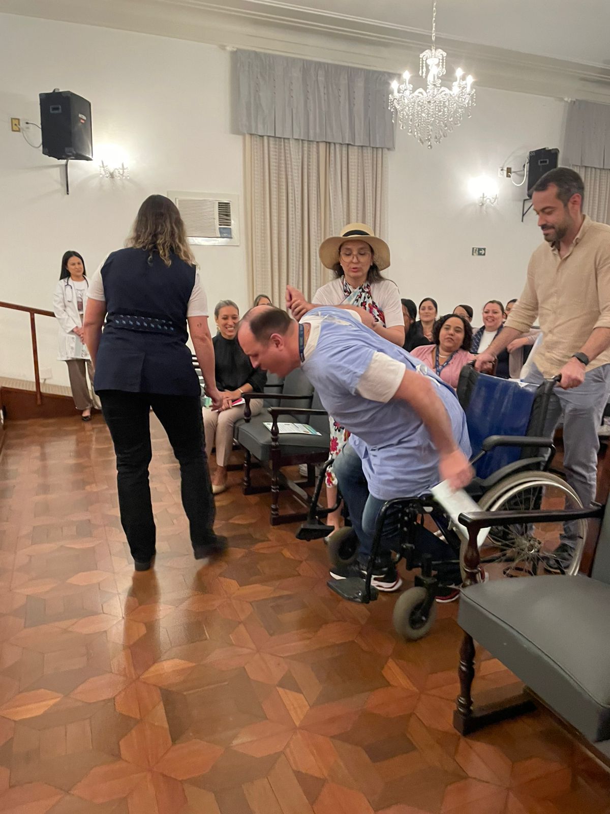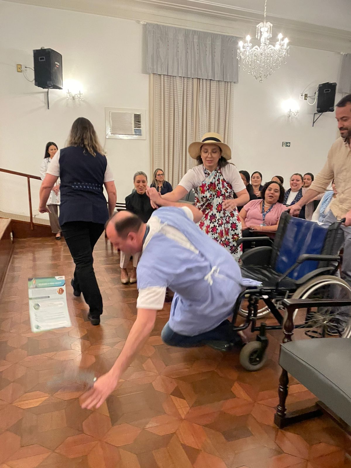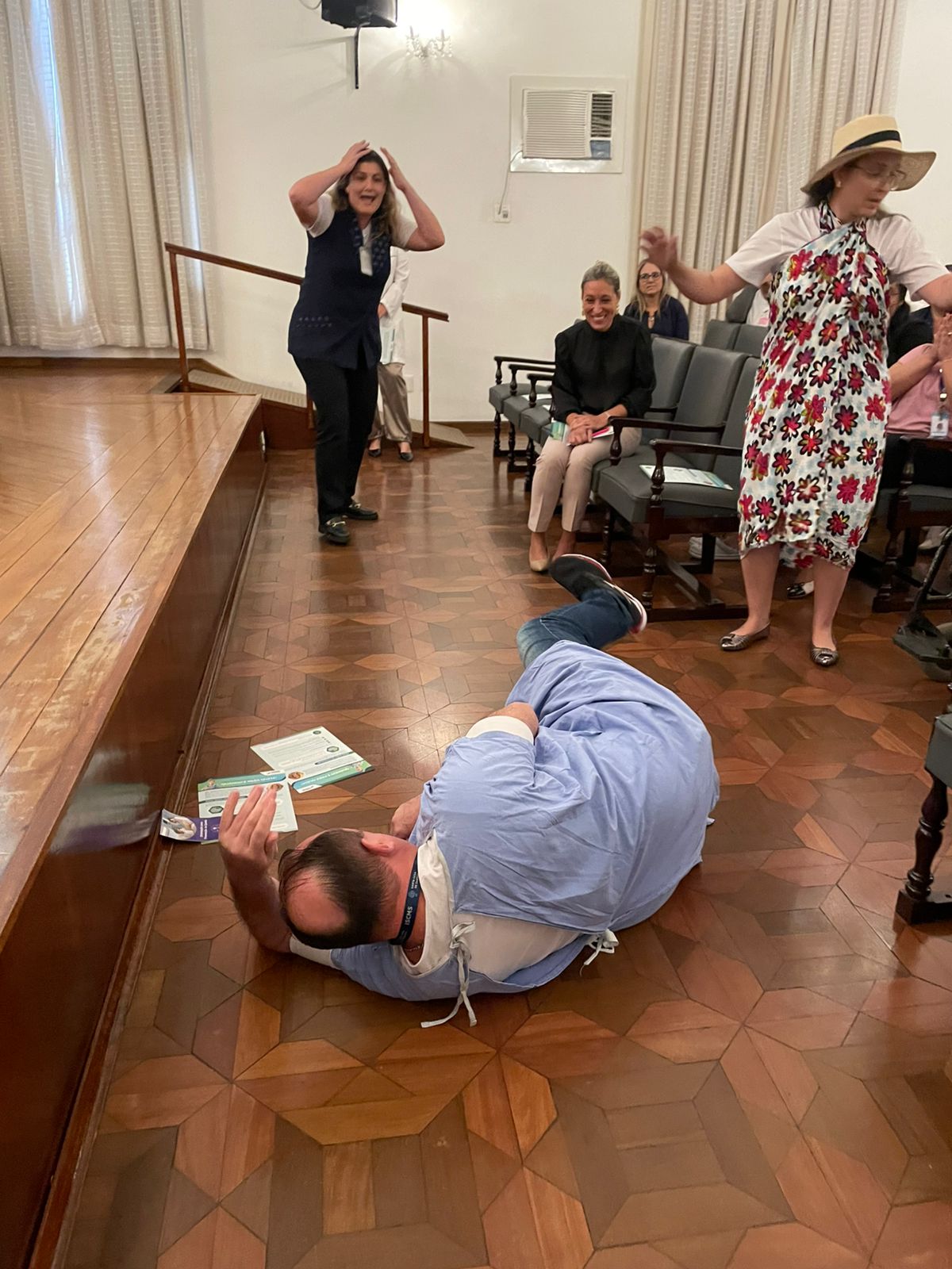 No decorrer da programação, a equipe apresentou uma peça teatral que simulou a entrada de um paciente idoso no hospital. A encenação retratou a situação de uma queda sofrida pelo paciente, ilustrando de forma prática os desafios enfrentados no atendimento e reforçando a importância da atenção, da prevenção e da atuação rápida da equipe multiprofissional.