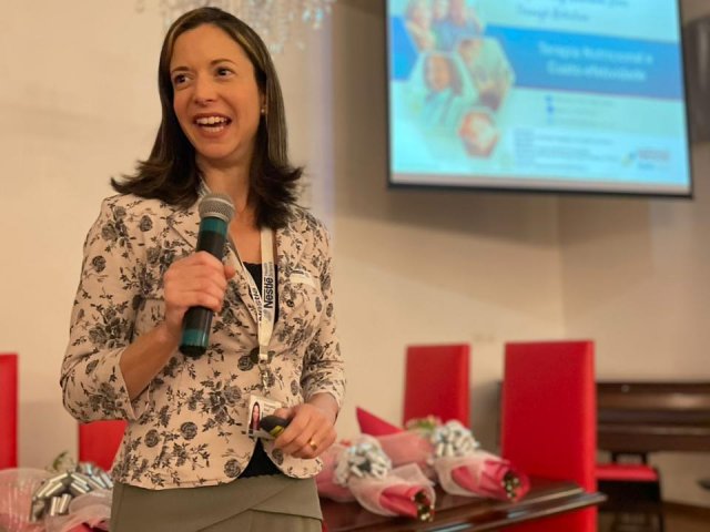 A primeira palestra do dia, ministrada por Fabíola Bolaños, representante da Nestlé, e pela nutricionista clínica hospitalar Isabella Robles Brasil Silveira, que abordaram “A importância da alimentação e suplementação no acompanhamento do paciente idoso”. As especialistas ressaltaram o impacto direto da nutrição adequada na prevenção de doenças e na recuperação hospitalar dos idosos, destacando a sarcopenia, desnutrição e lesão por pressão.