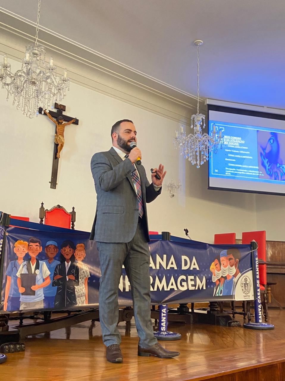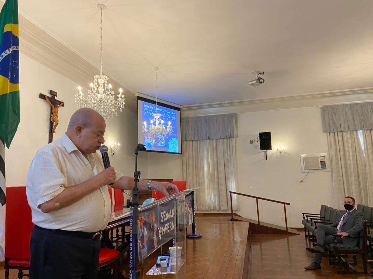 A Semana da Enfermagem 2021 da Santa Casa de Santos está sendo um sucesso de público e com participação interativa dos profissionais. Ontem, dia 17/5, o provedor Ariovaldo Feliciano fez a abertura do evento, no Consistório da Irmandade, e apresentou o palestrante do dia, o Procurador Geral, advogado e especialista em redes sociais, Dr. Raphael Vita Costa. O provedor explicou ainda sobre evolução da internet, os perigos da fakenews e agradeceu aos profissionais de saúde por participarem do evento.