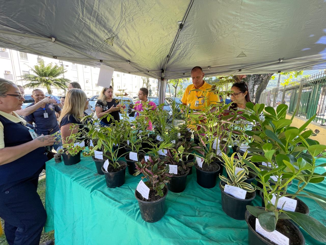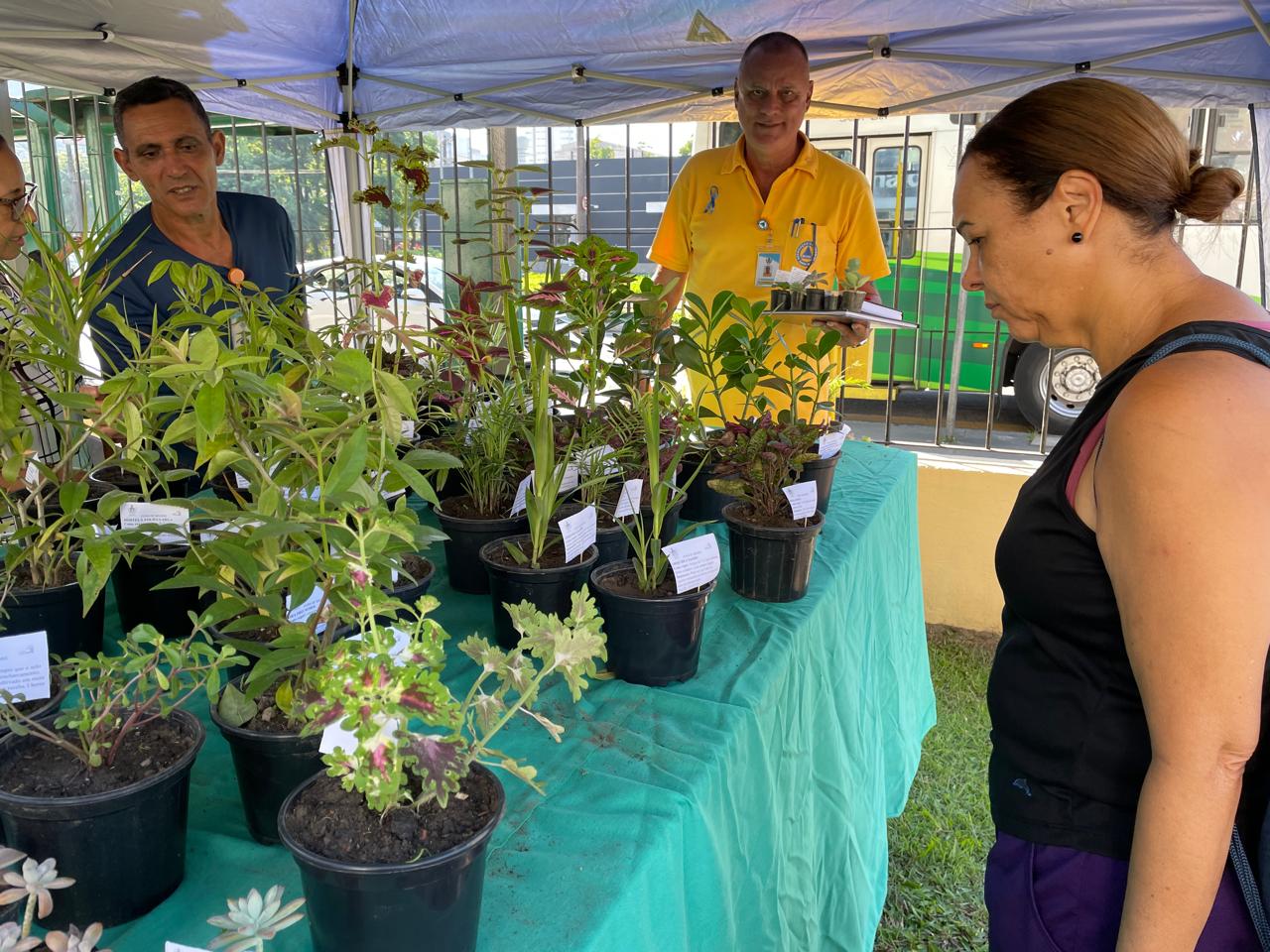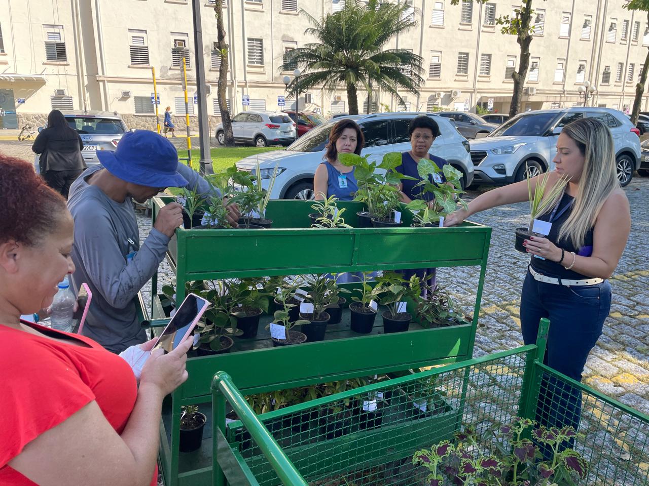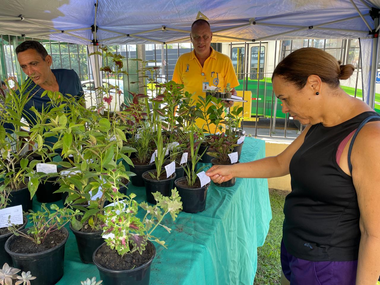 Entre os interessados em adquirir as mudas, estavam funcionários e pessoas que passavam pelo local, como pacientes e visitantes. Destaque para a enfermeira Raquel, da Central de Vagas, que não perde uma feira e sempre compra várias mudinhas.