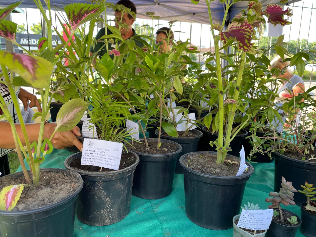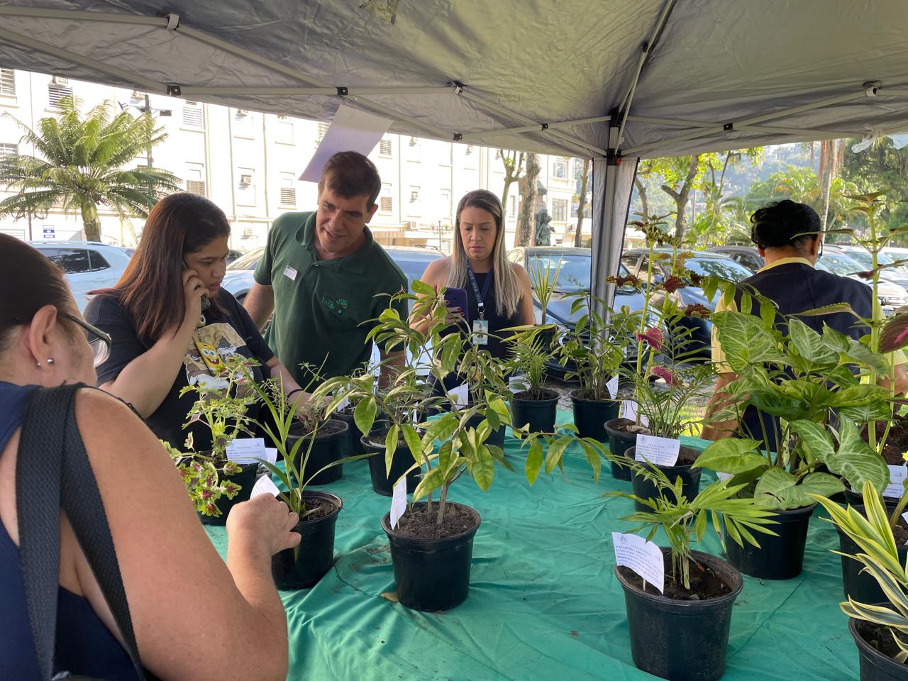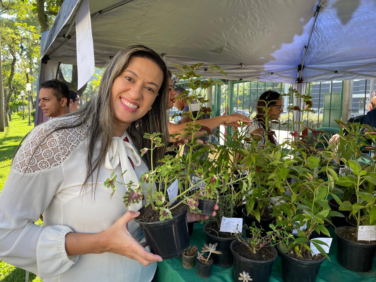 Entre os interessados em adquirir as mudas, estavam funcionários e pessoas que passavam pelo local, como pacientes e visitantes. Destaque para a enfermeira Raquel, da Central de Vagas, que não perde uma feira e sempre compra várias mudinhas.
