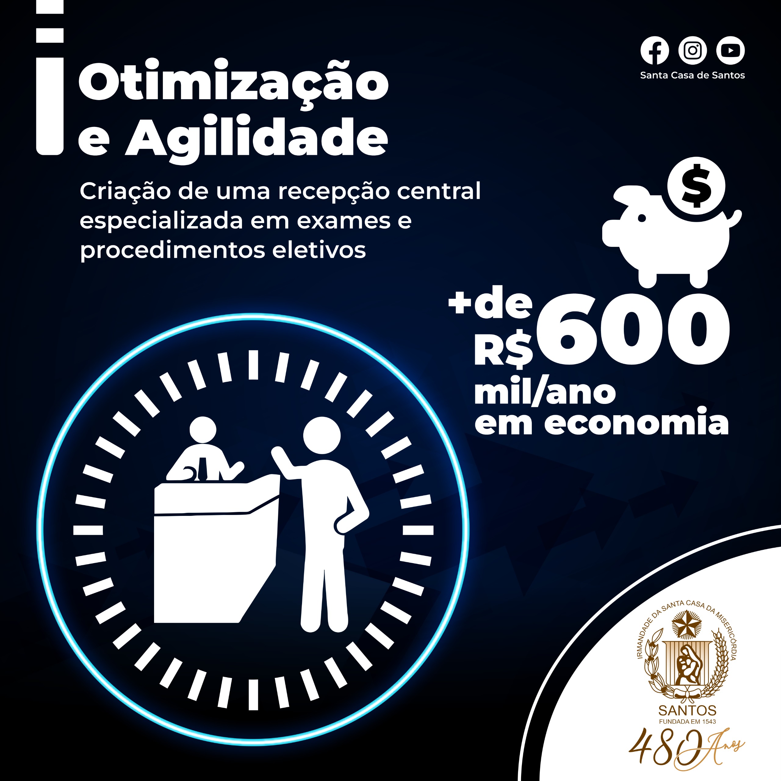 Para a Recepção a previsão de economia é de mais de R$ 600 mil ao ano, com a criação de uma recepção central especializada em exames e procedimentos eletivos. Com essa mudança, houve agilidade no serviço e evolução profissional dos colaboradores remanejados.