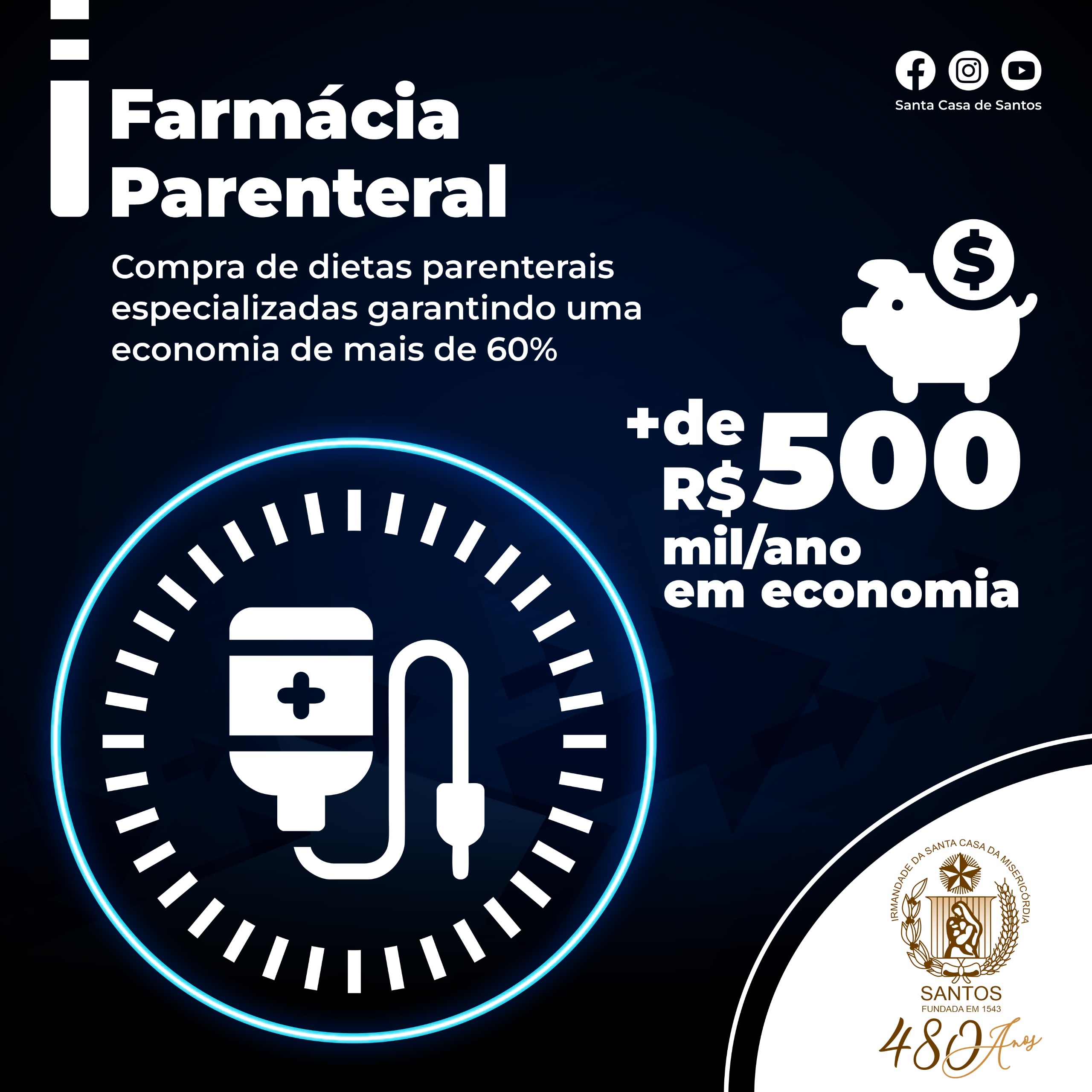 Já a Farmácia Parenteral a previsão de economia é de mais de R$ 500 mil ao ano, com a compra de dietas parenterais especializadas garantindo uma redução de mais de 60%.