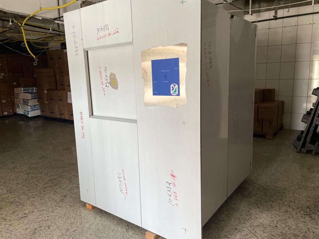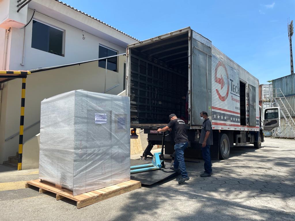 A entrega da Autoclave Universal Ultra Fast, da Ortosíntese, mobilizou a equipe da Central de Equipamentos, Engenharia Clínica e DMG, que ajudaram a transportadora a descarregar o aparelho de quase 2 toneladas.