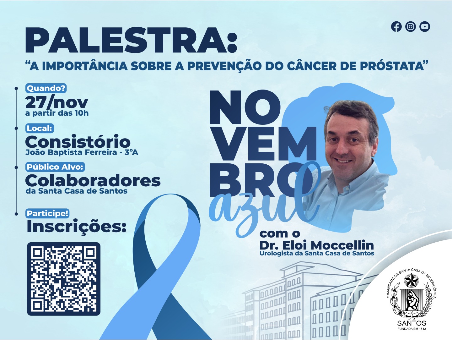 No dia 27/11, às 10h, o Setor de Medicina do Trabalho da Santa Casa de Santos promoverá o evento institucional “Novembro Azul – A importância da prevenção do câncer de próstata”, com palestras da nutricionista, Rita de Cássia, e do urologista, Dr. Eloi Moccellin.