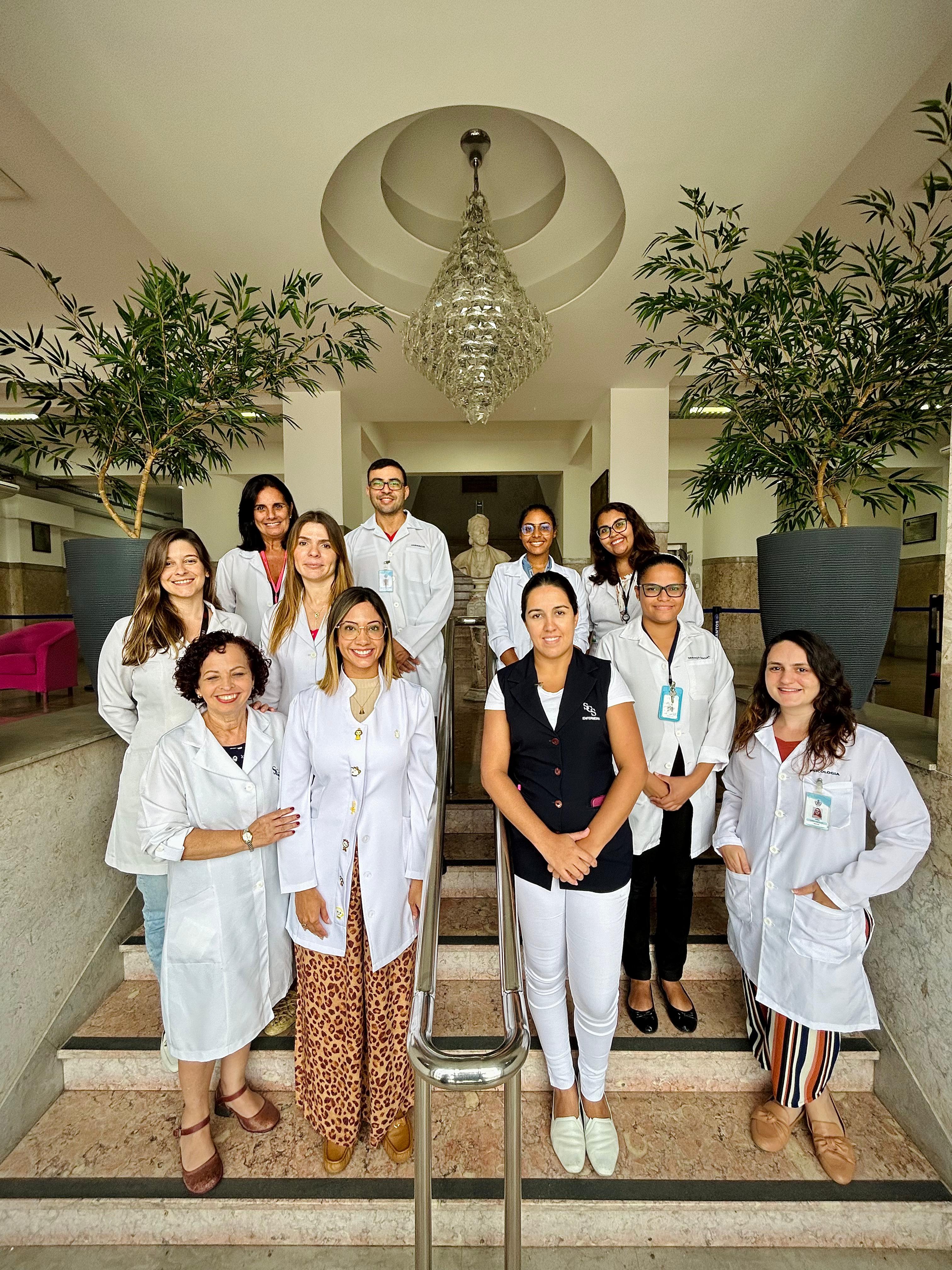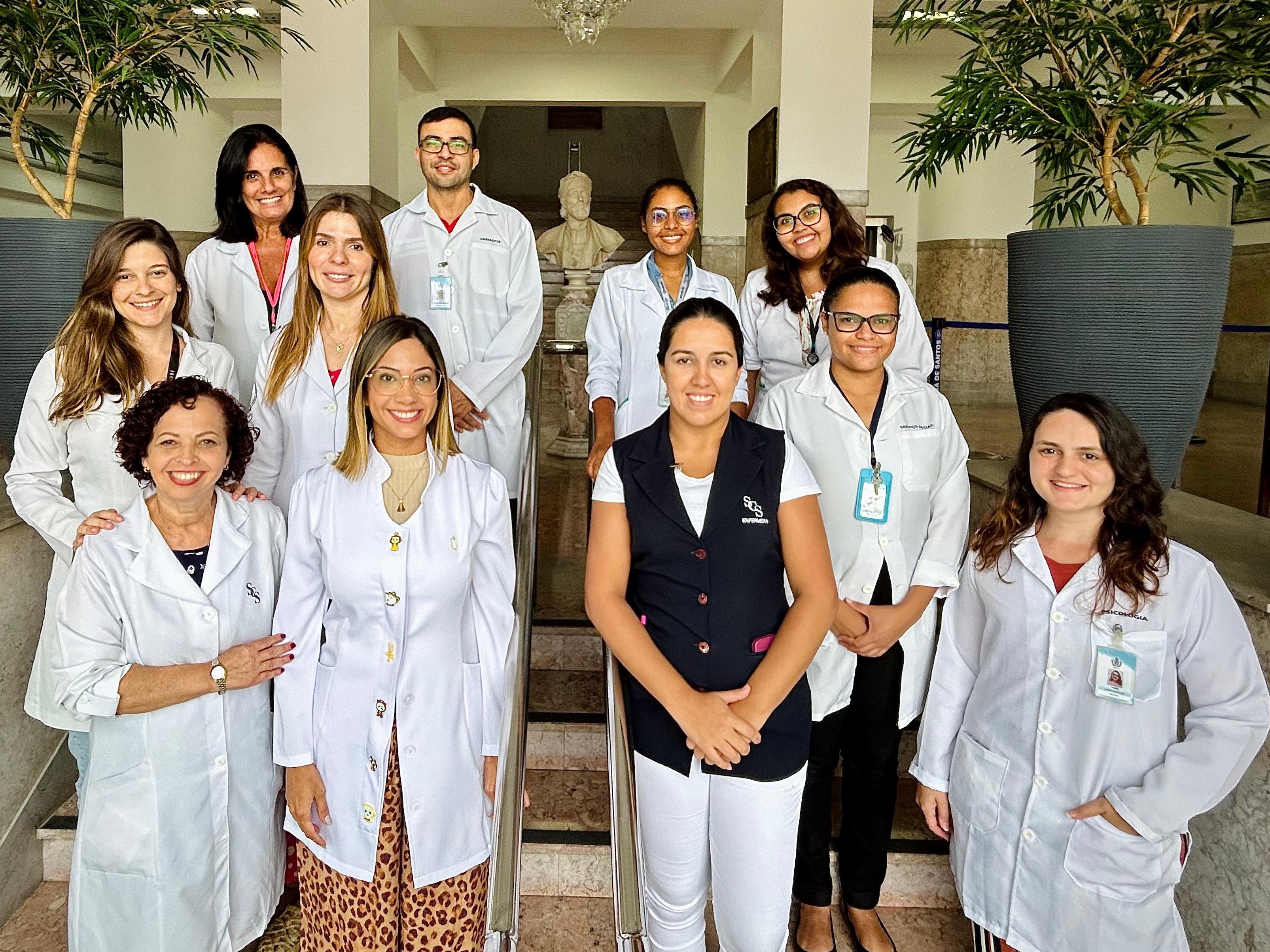 A equipe multidisciplinar (foto) é formada por profissionais das seguintes áreas: humanização, psicologia, serviço social, fonoaudiologia, pedagogia, fisioterapia, nutrição, bucomaxilofacial, enfermagem, farmácia, médicos especialistas e radioterapia.