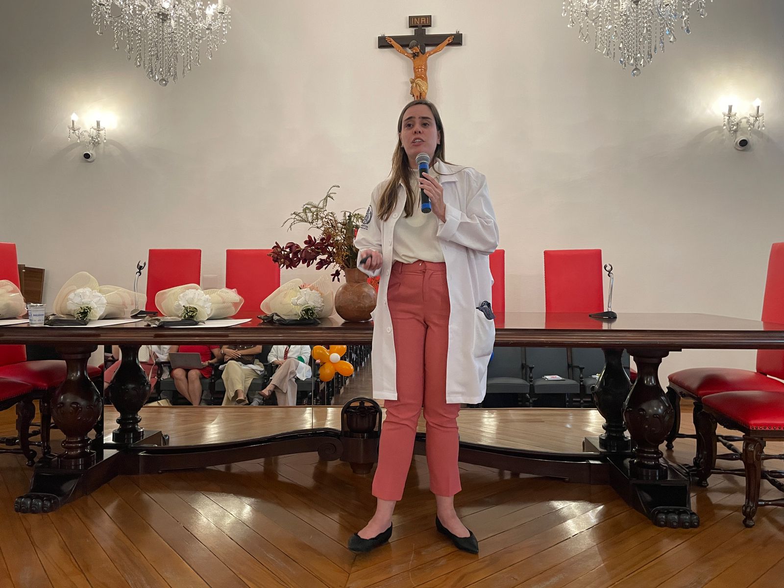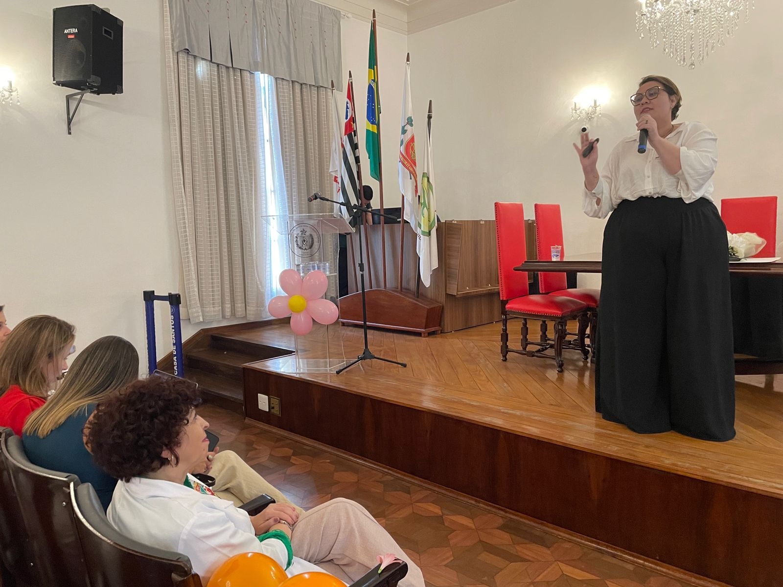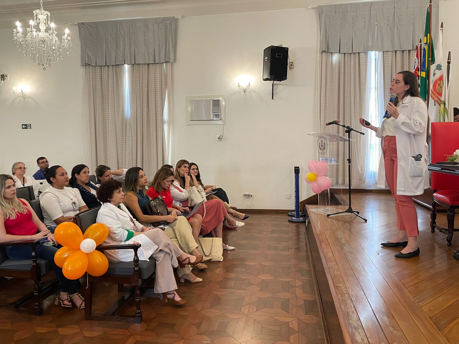 A segunda palestra foi com a médica oncologista pediátrica responsável pelo Serviço de Oncopediatra da Santa Casa, Drª. Fabiola Velarde, que falou sobre os sinais e sintomas do câncer, e a importância do diagnóstico precoce. Drª. Fabiola também explicou que a causa do câncer infanto juvenil ainda é desconhecida.