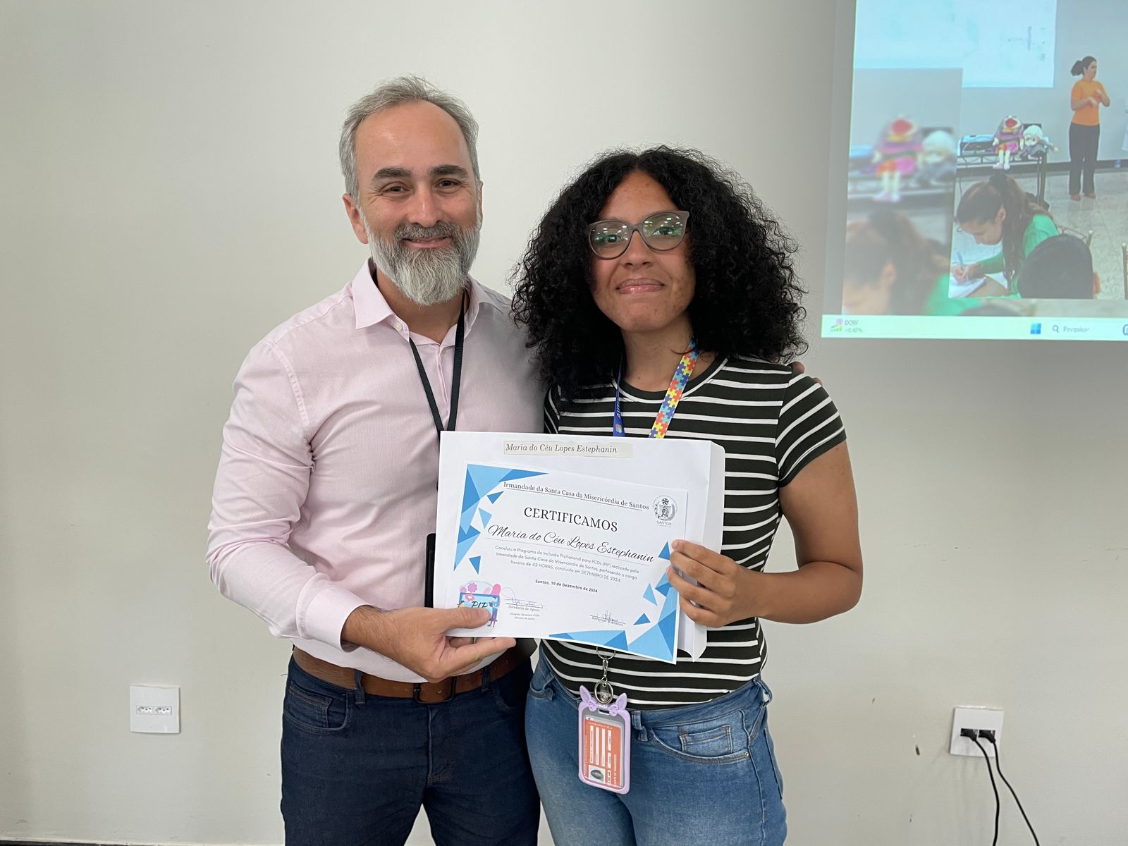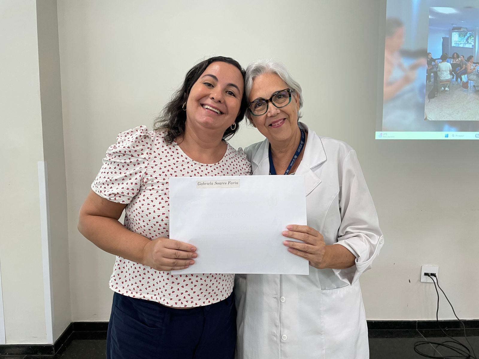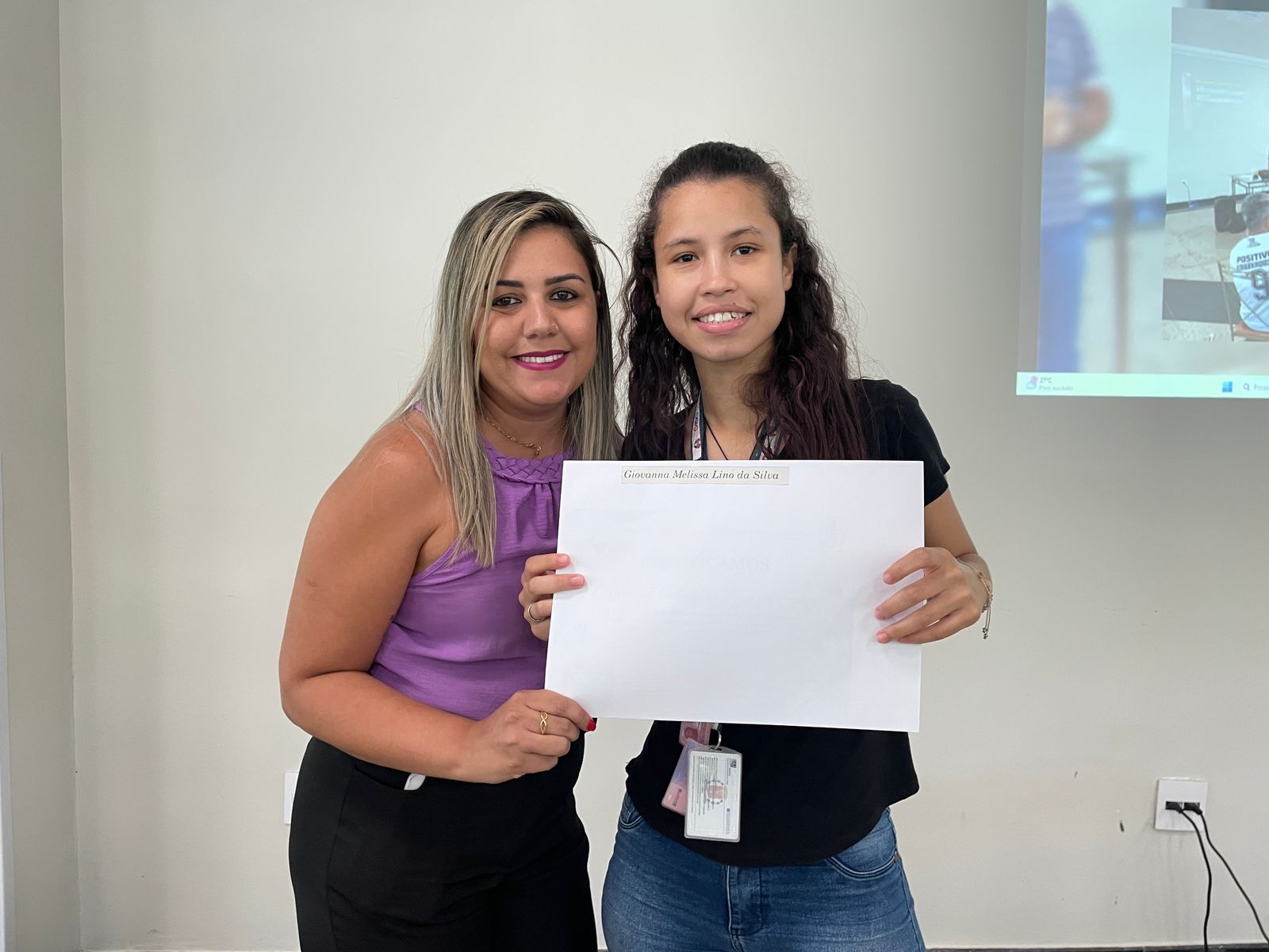 Após a apresentação, que foi aplaudida e aprovada por todos os presentes, os certificados foram entregues aos participantes pelos profissionais que ministraram as aulas, como forma de reconhecimento pela dedicação e empenho no compartilhamento de conhecimento.