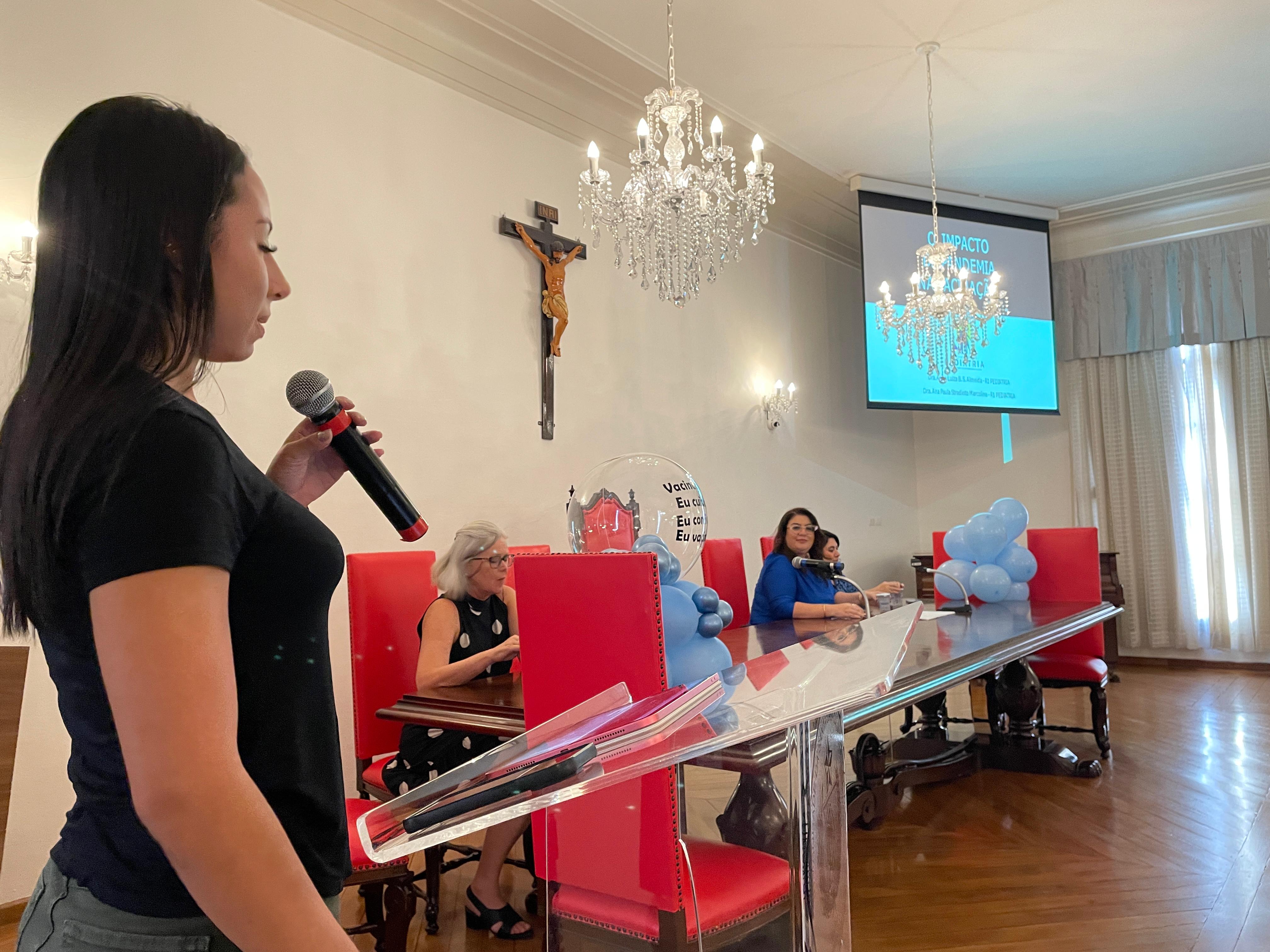 A seguir, a residente do 1º ano de pediatria, Drª. Anna Luiza Barbosa da Silva Almeida, apresentou um trabalho sobre o impacto da pandemia da Covid-19 na vacinação.