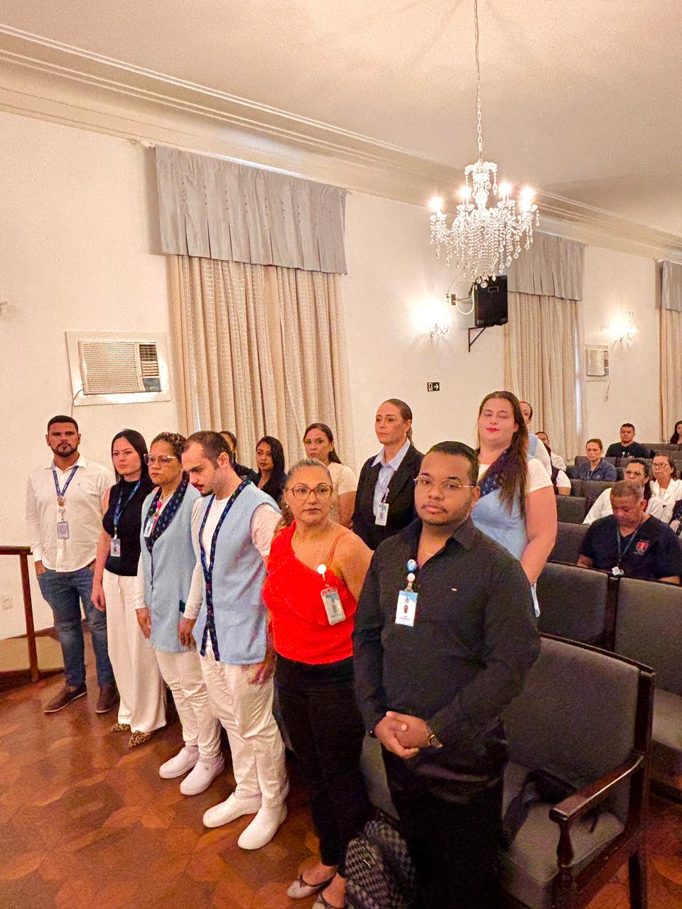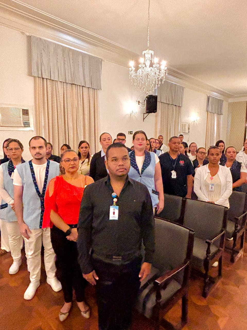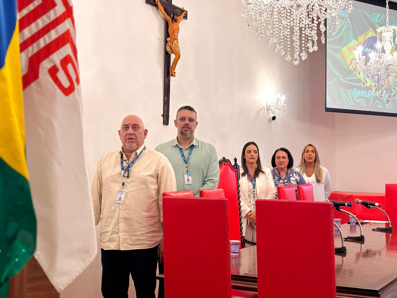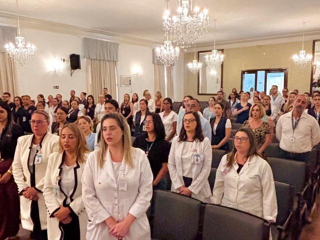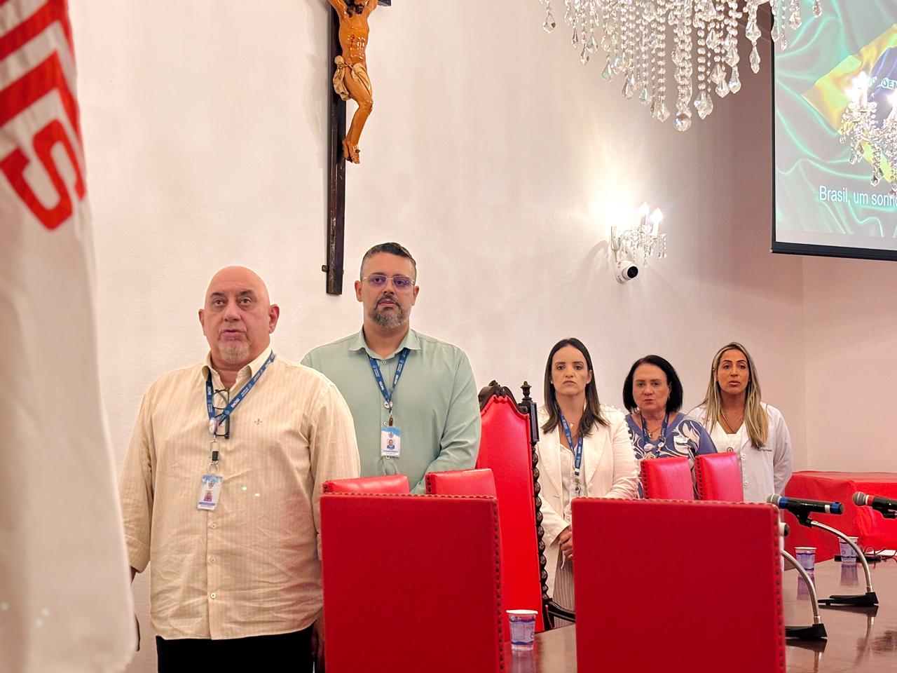 A mesa de honra foi composta pelo Diretor Administrativo Eduardo Pimentel representando a provedoria, pelo Diretor Técnico Dr. Alex Macedo, pela Gestora de Enfermagem Rita Rocha, pela representante do COREN Ivete Louzada Trotti e pela Presidente da Comissão de Ética de Enfermagem 2026 Thaís Fernandes.