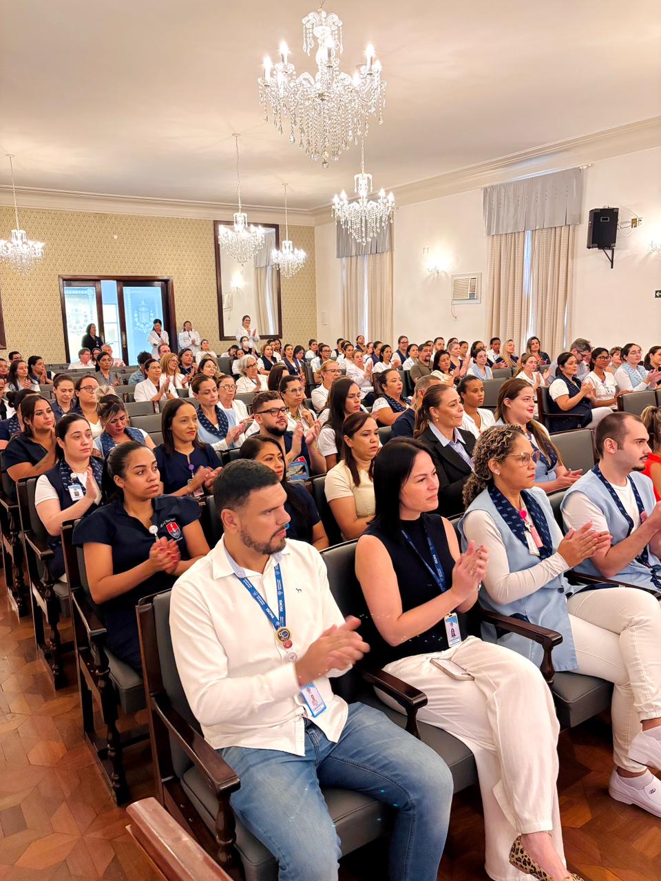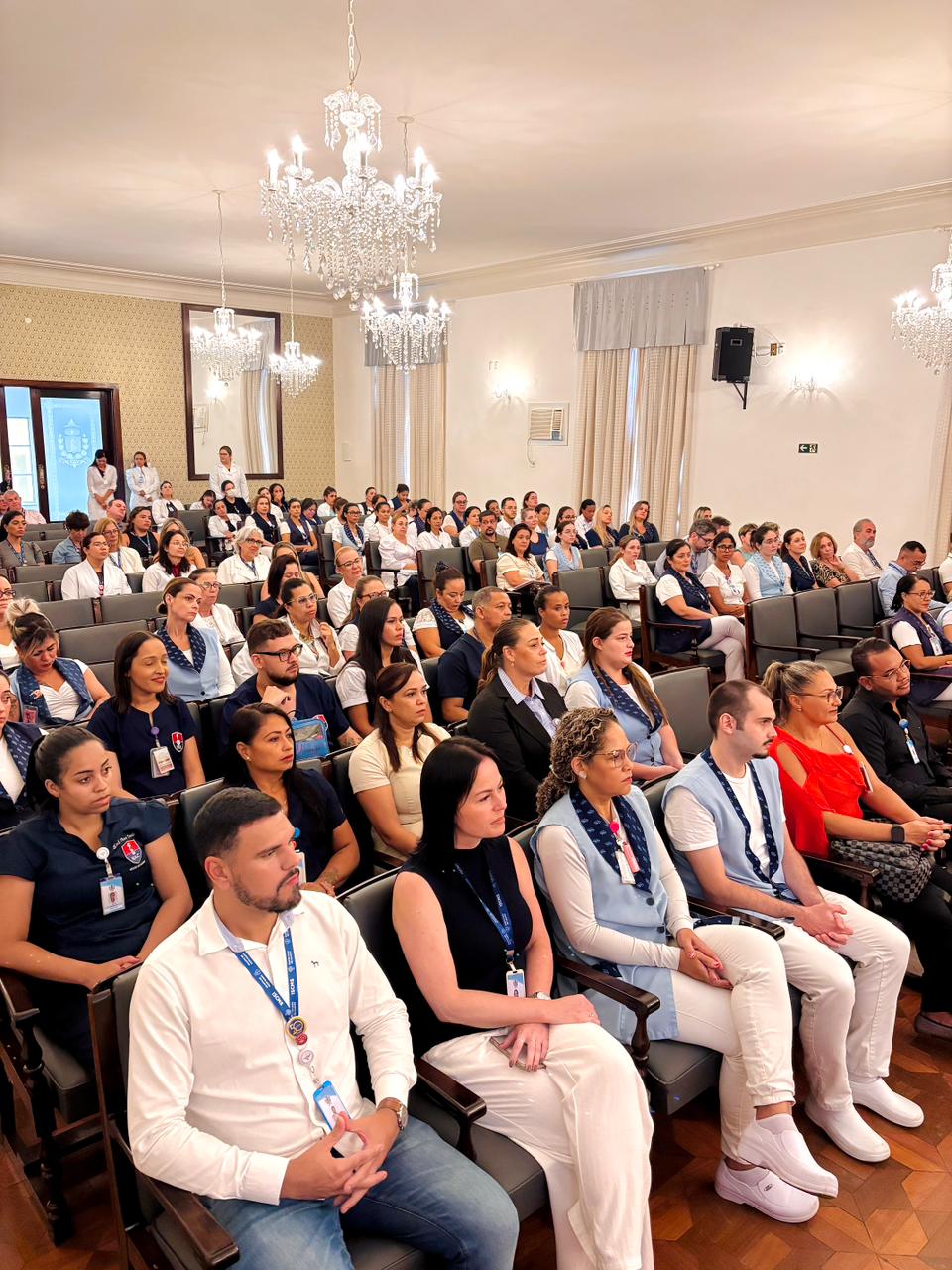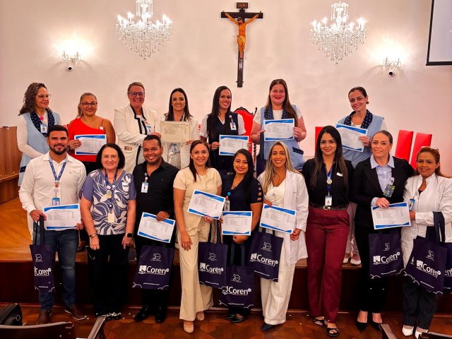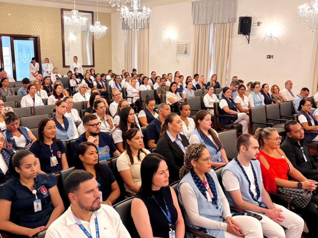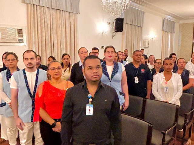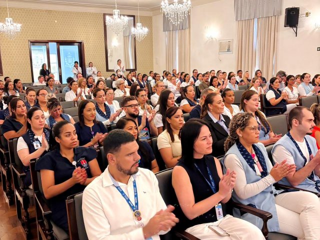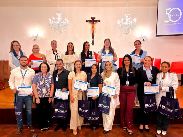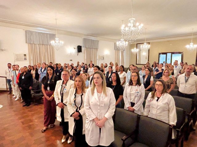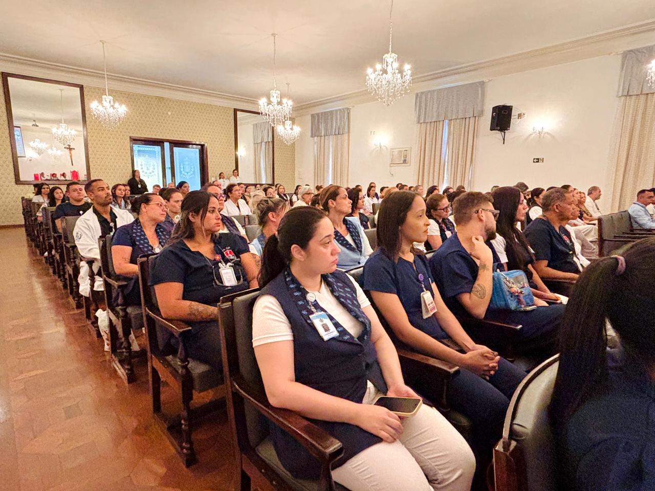 A mesa de honra foi composta pelo Diretor Administrativo Eduardo Pimentel representando a provedoria, pelo Diretor Técnico Dr. Alex Macedo, pela Gestora de Enfermagem Rita Rocha, pela representante do COREN Ivete Louzada Trotti e pela Presidente da Comissão de Ética de Enfermagem 2026 Thaís Fernandes.