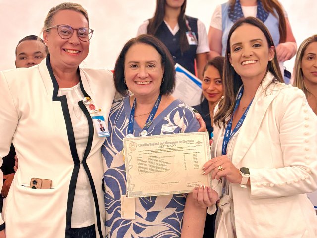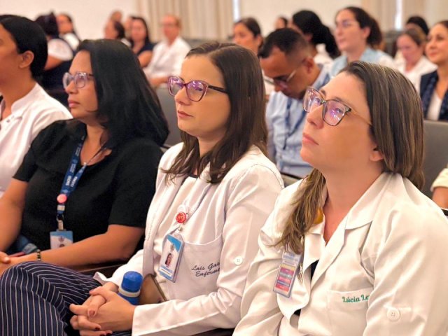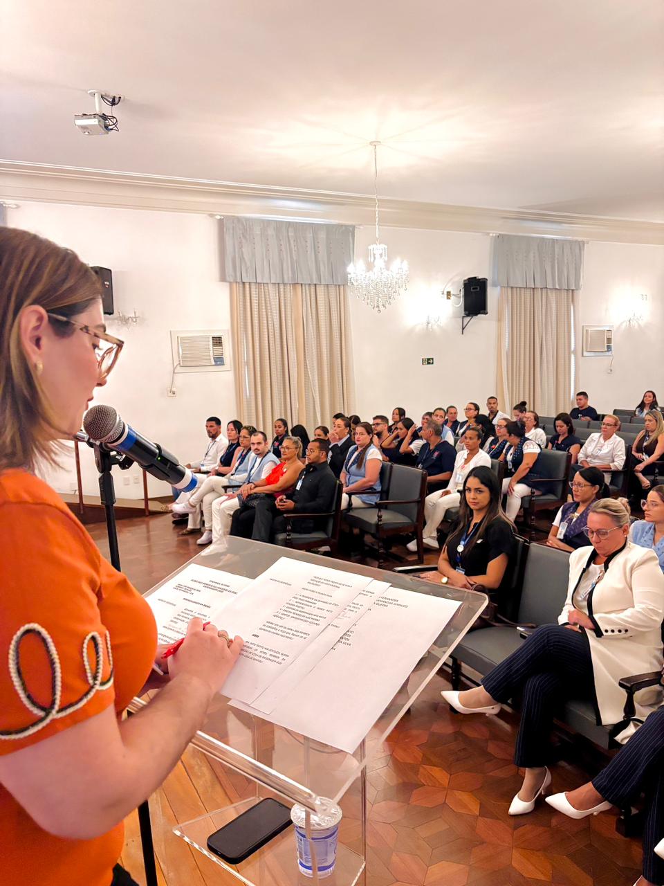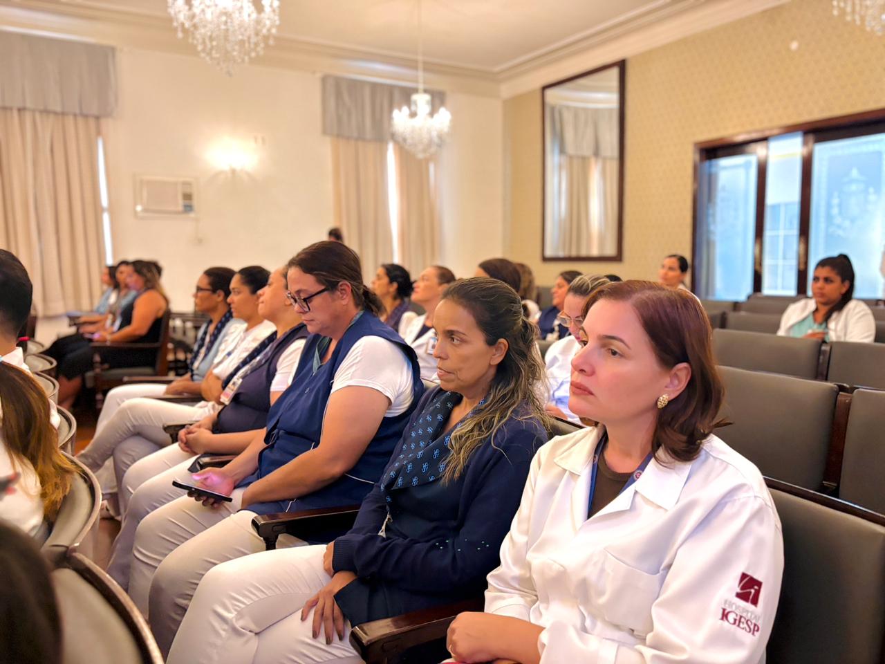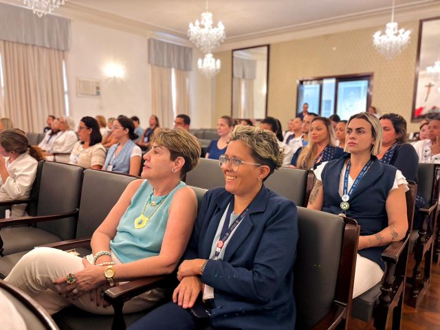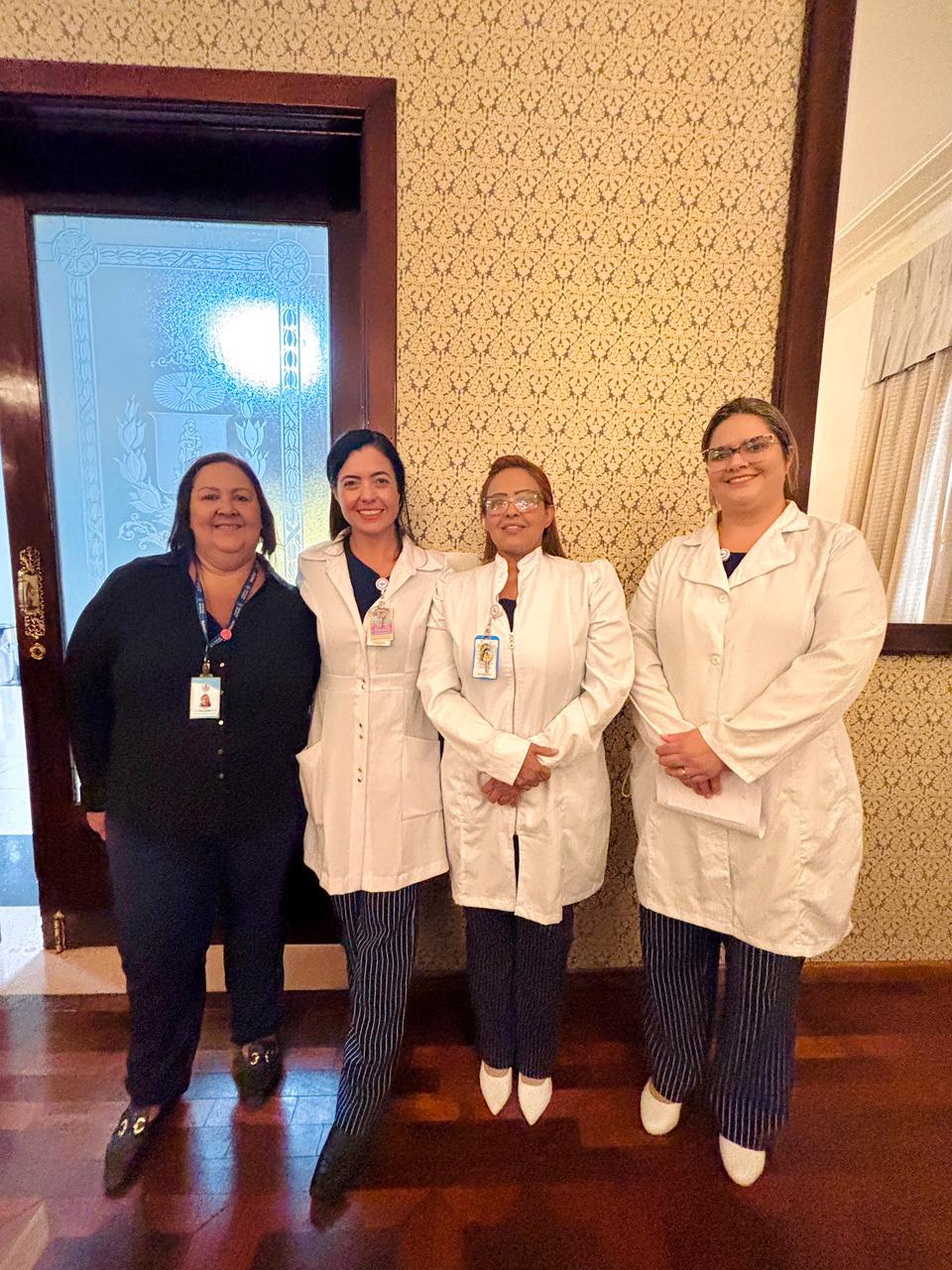 A mesa de honra foi composta pelo Diretor Administrativo Eduardo Pimentel representando a provedoria, pelo Diretor Técnico Dr. Alex Macedo, pela Gestora de Enfermagem Rita Rocha, pela representante do COREN Ivete Louzada Trotti e pela Presidente da Comissão de Ética de Enfermagem 2026 Thaís Fernandes.
