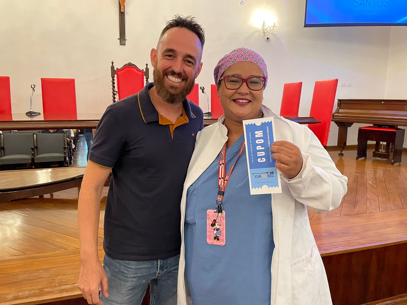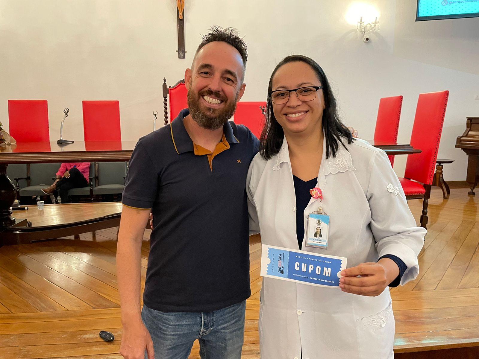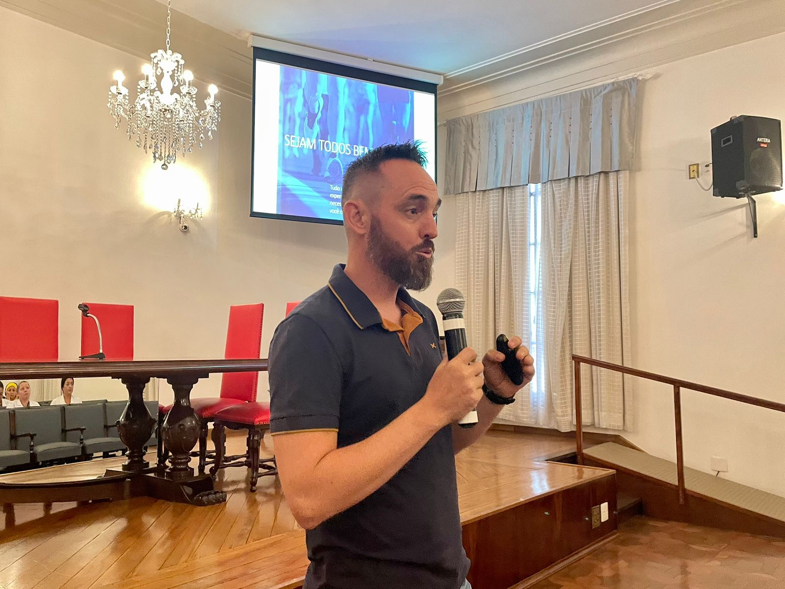 No segundo dia de evento, o atleta amador Cesar Meneguini falou sobre a importância da atividade física para a qualidade de vida e desempenho laboral. Cesar Meneguini é analista de sistemas e gerente da T.I. da Santa Casa e deu um depoimento motivador, destacando como a prática esportiva transformou a sua vida, e que essa mudança está ao alcance de todos.