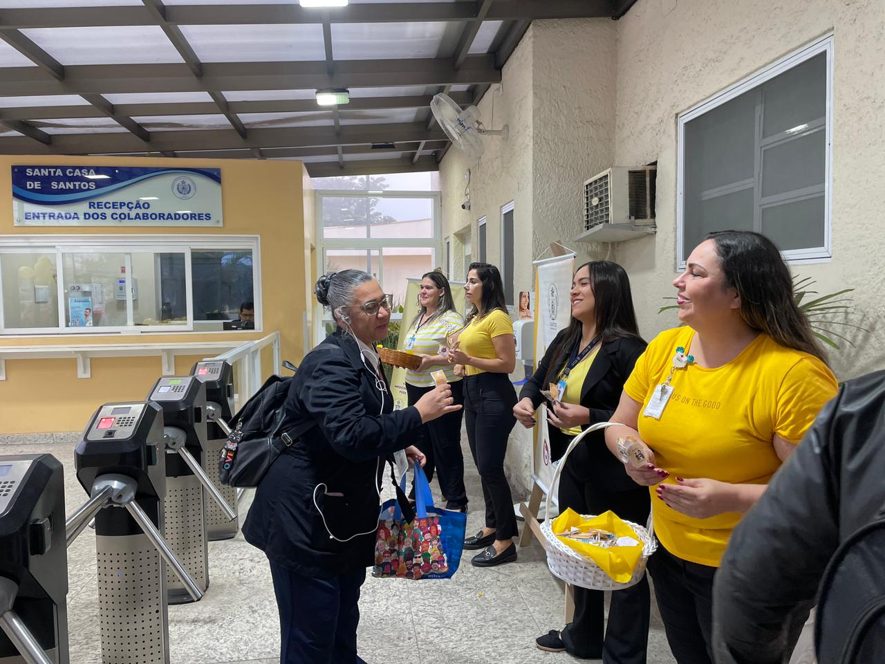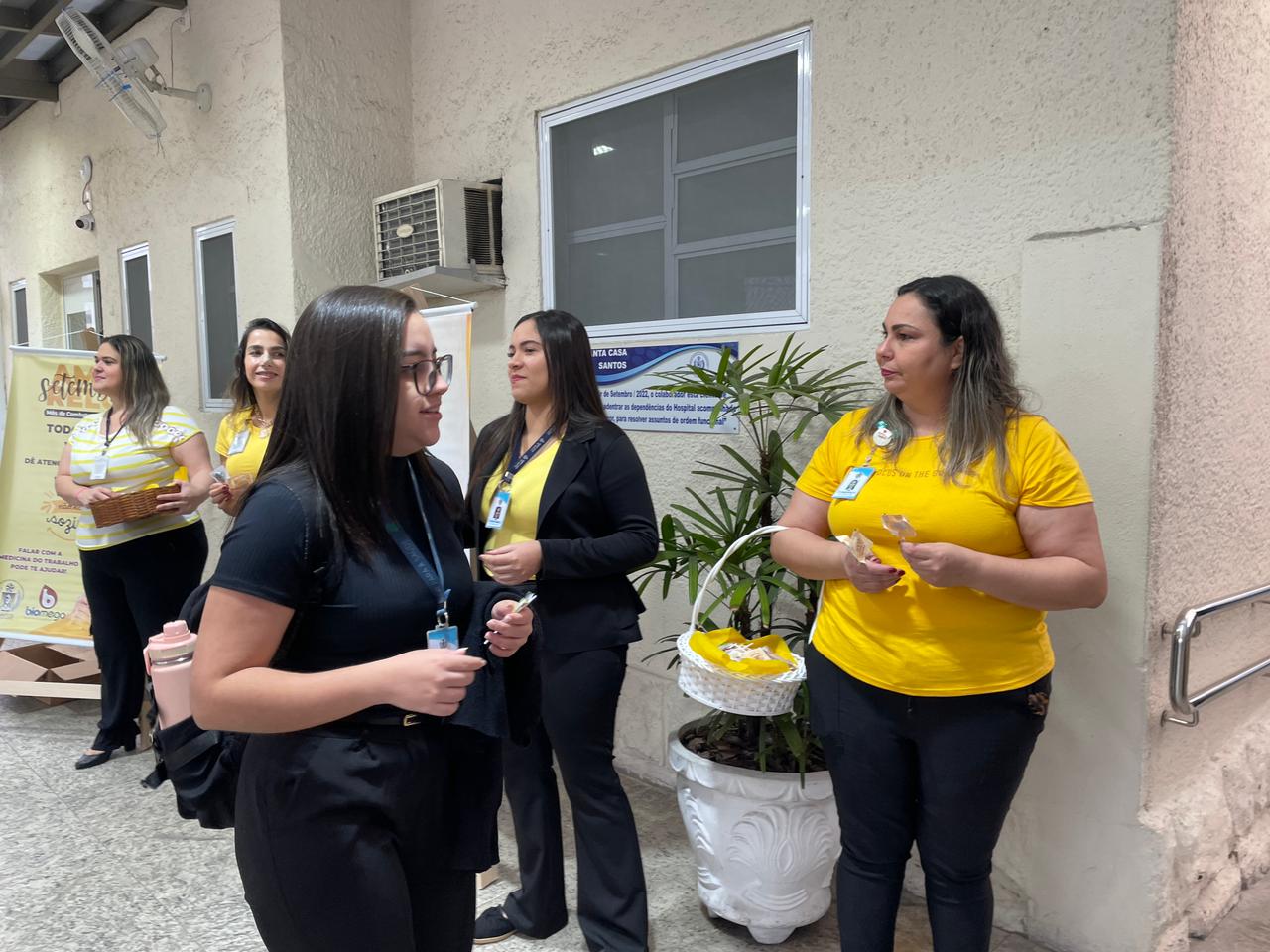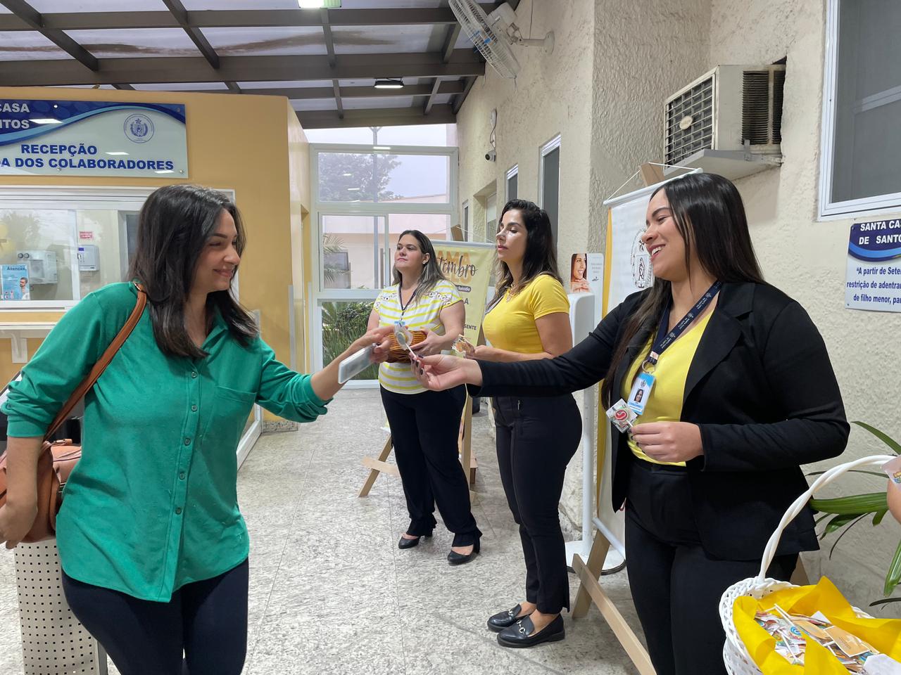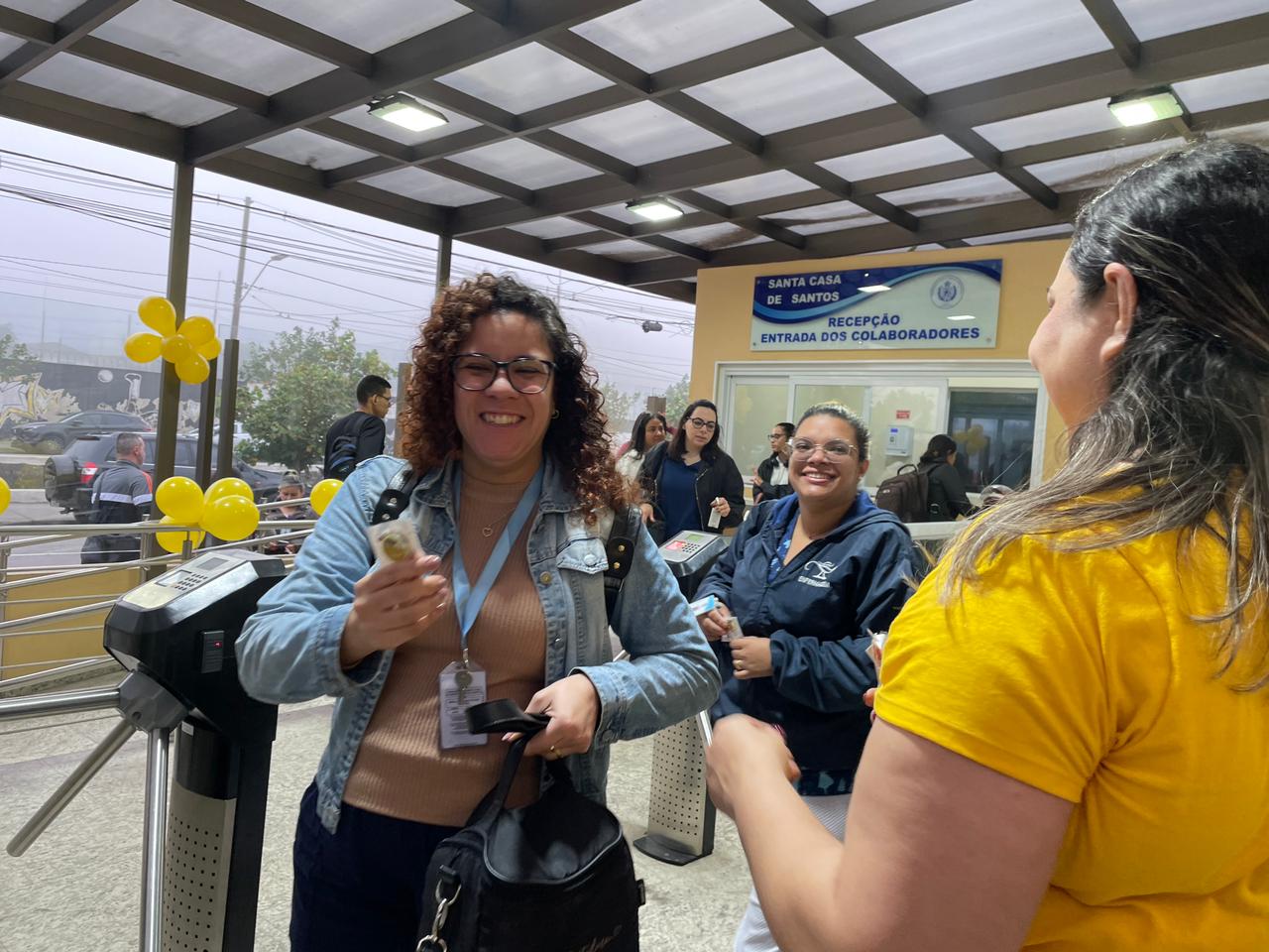 O início da semana na Santa Casa de Santos começou diferente para os funcionários da instituição, que foram recepcionados logo no primeiro horário da manhã com música e um grupo da comissão organizadora da campanha Setembro Amarelo entregando pirulitos com frases motivacionais.