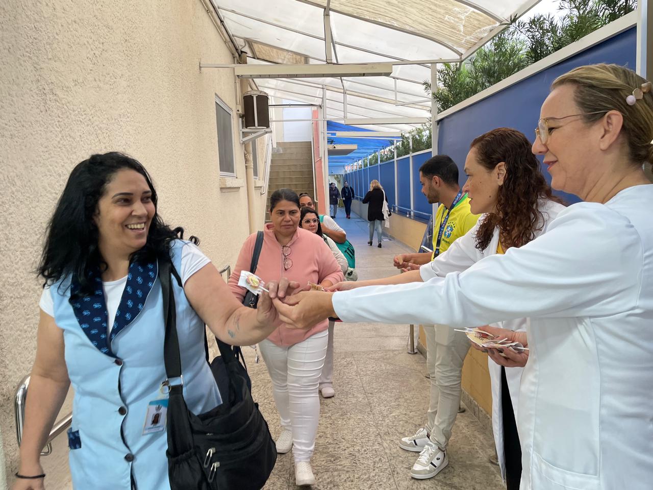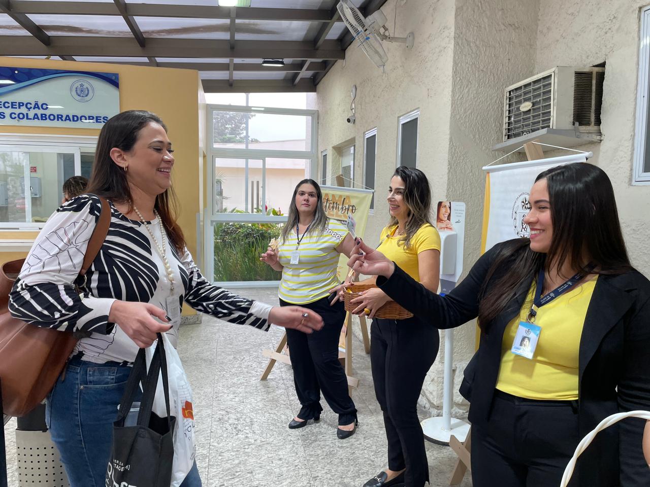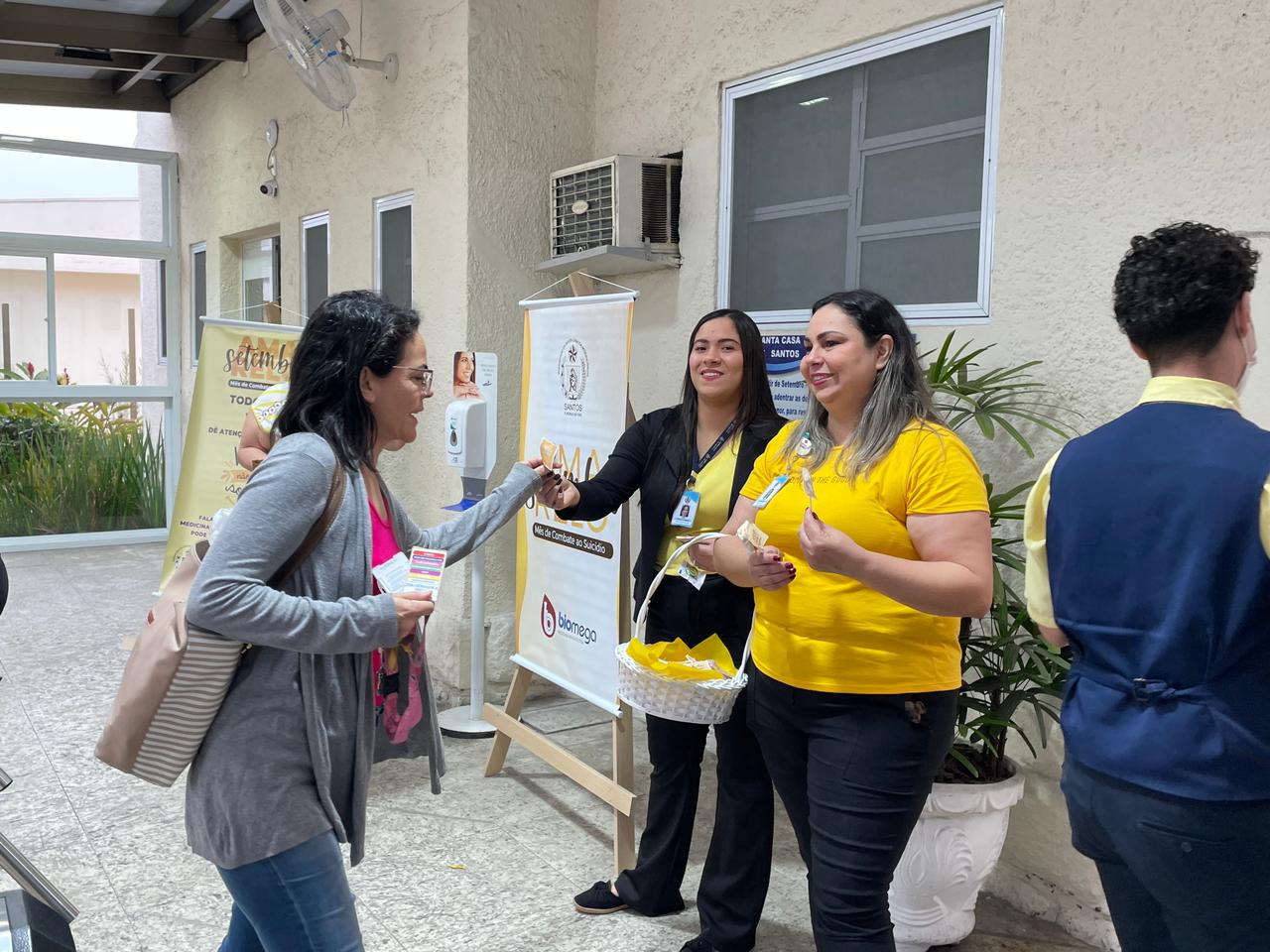 O início da semana na Santa Casa de Santos começou diferente para os funcionários da instituição, que foram recepcionados logo no primeiro horário da manhã com música e um grupo da comissão organizadora da campanha Setembro Amarelo entregando pirulitos com frases motivacionais.