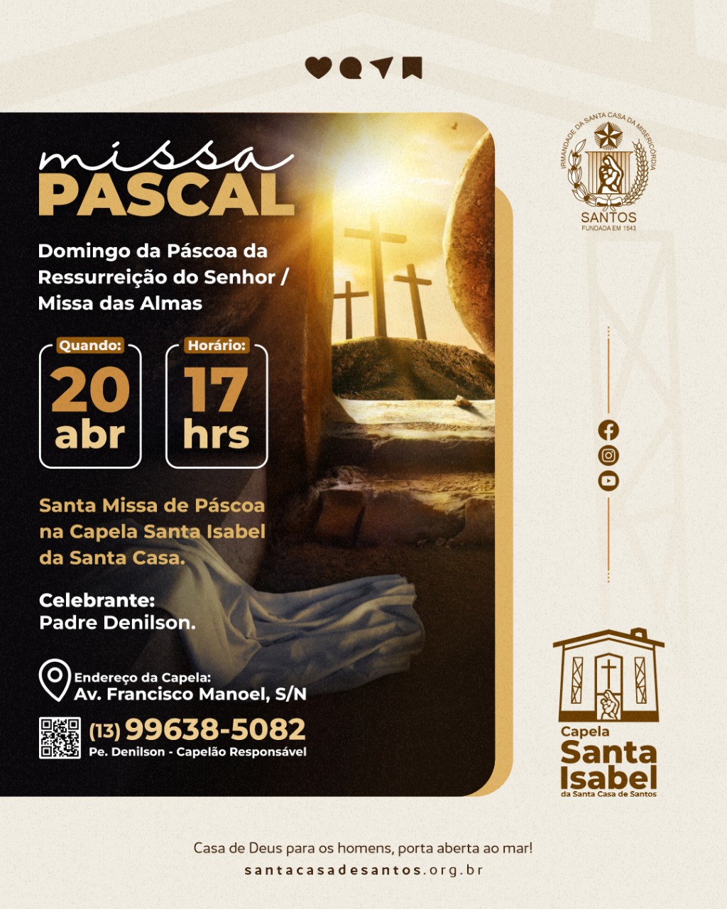 No Domingo de Páscoa da Ressurreição do Senhor, dia 20/4, às 17 horas, acontecerá a Santa Missa de Páscoa, com o celebrante Capelão Padre Denilson.