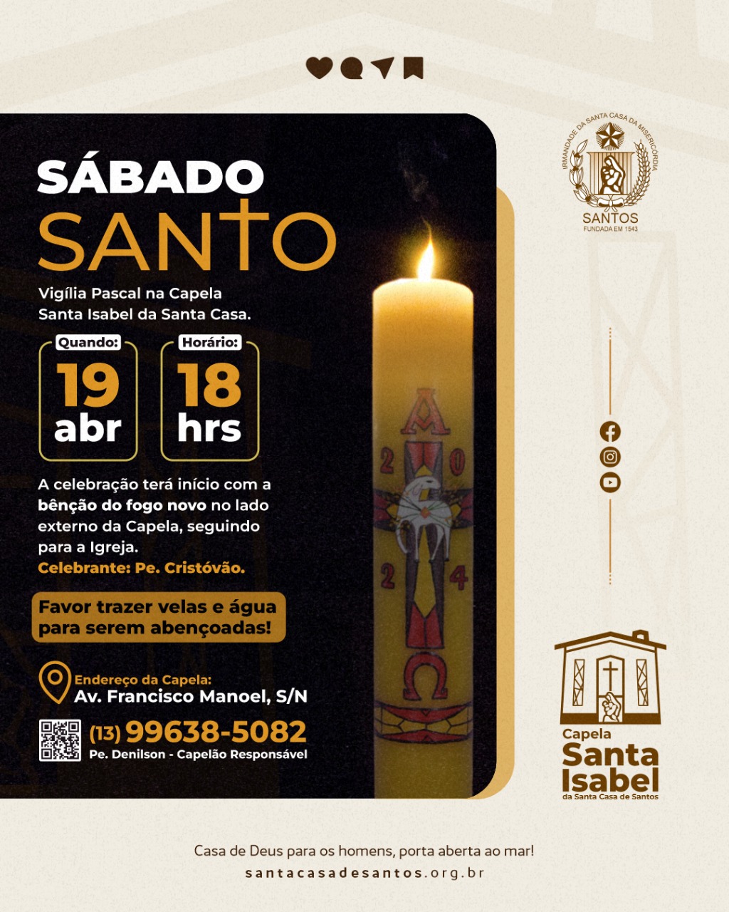 No Sábado Santo, em 19/4, às 18 horas, acontecerá a Vigília Pascal. A celebração terá início com a benção do fogo novo, que será realizada do lado externo da Capela, seguindo para a igreja. Neste dia a Santa Missa será celebrada pelo Capelão Padre Denilson. Os fiéis podem levar velas e água para serem abençoadas.