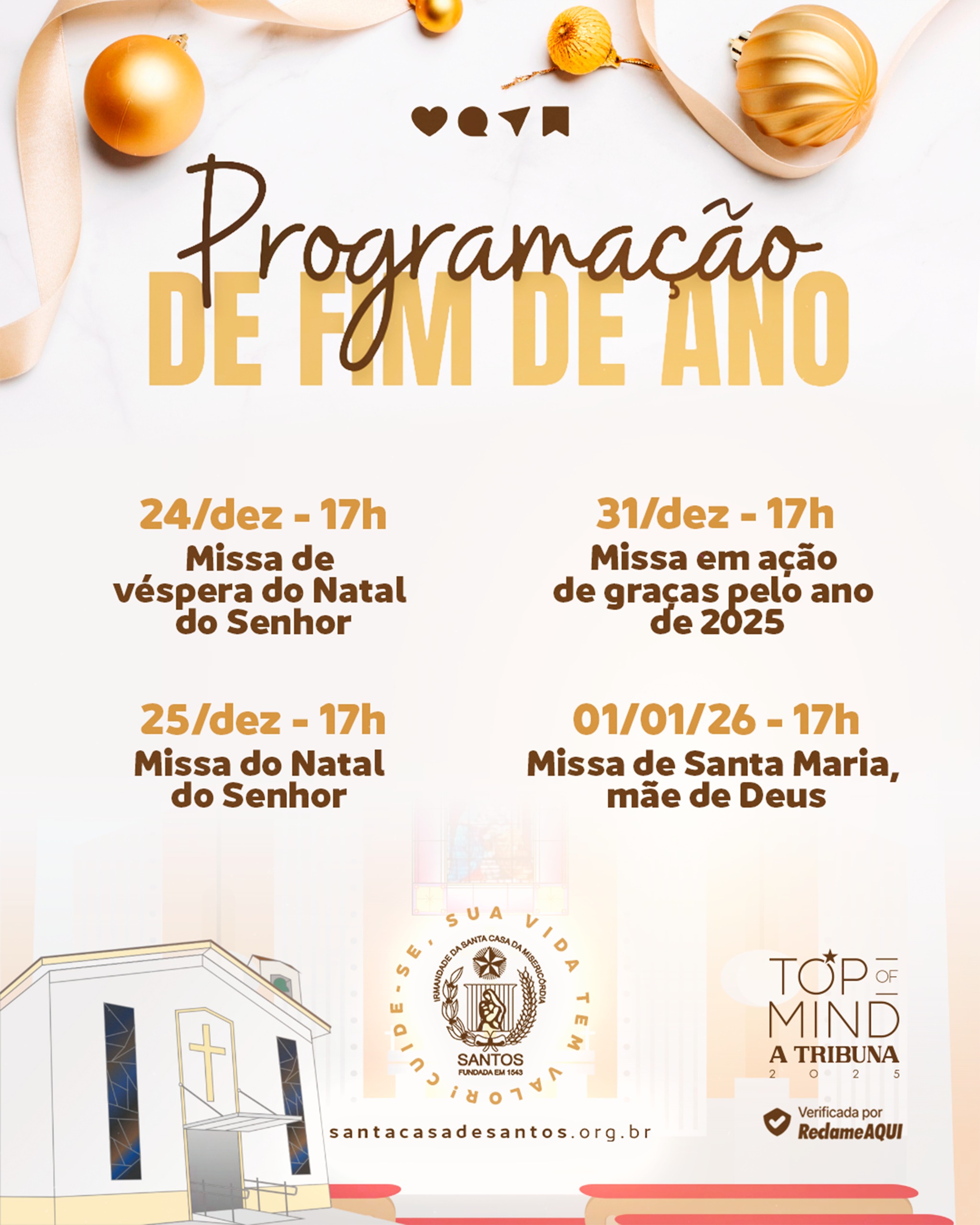 Encerrando o ano, no dia 31 de dezembro, às 17h, haverá a Missa em Ação de Graças pelo ano de 2025, momento dedicado à reflexão e agradecimento pelas conquistas e aprendizados do período.