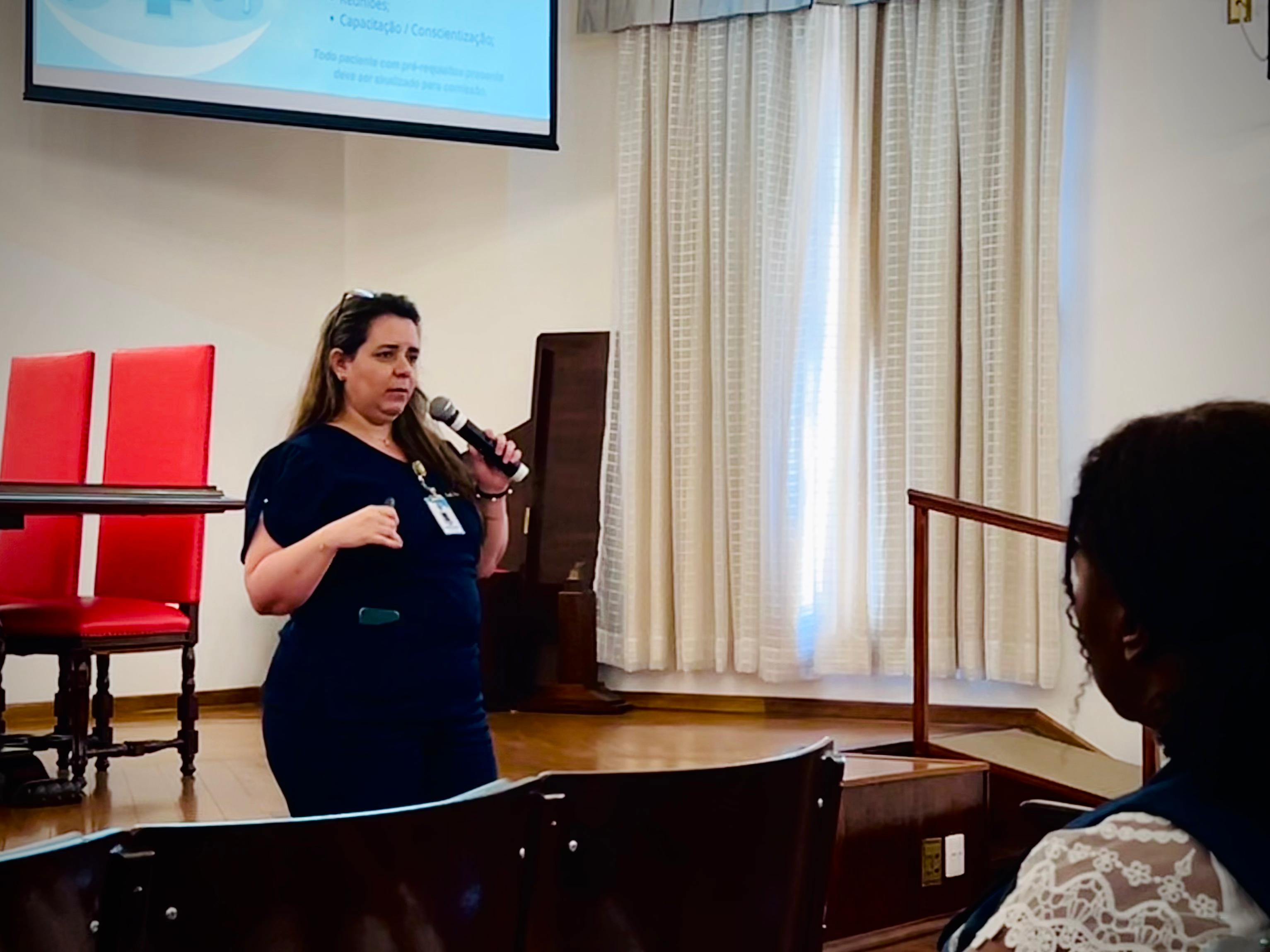 A seguir, a palestra foi ministrada pela enfª. Renata Joaquim, responsável pelo Serviço de Captação de Órgãos, que detalhou cada fase do protocolo de morte encefálica e o processo de doação dos órgãos.