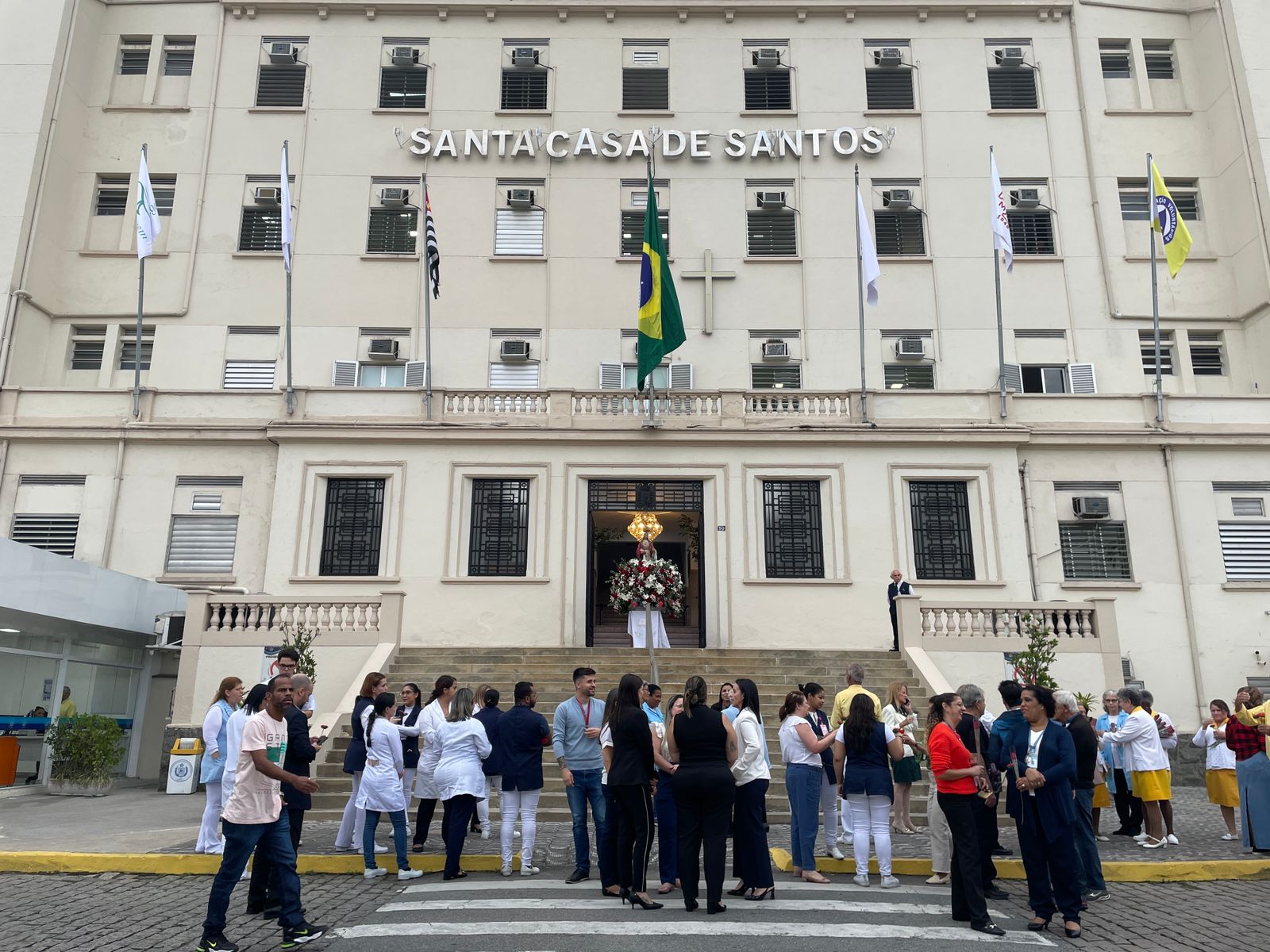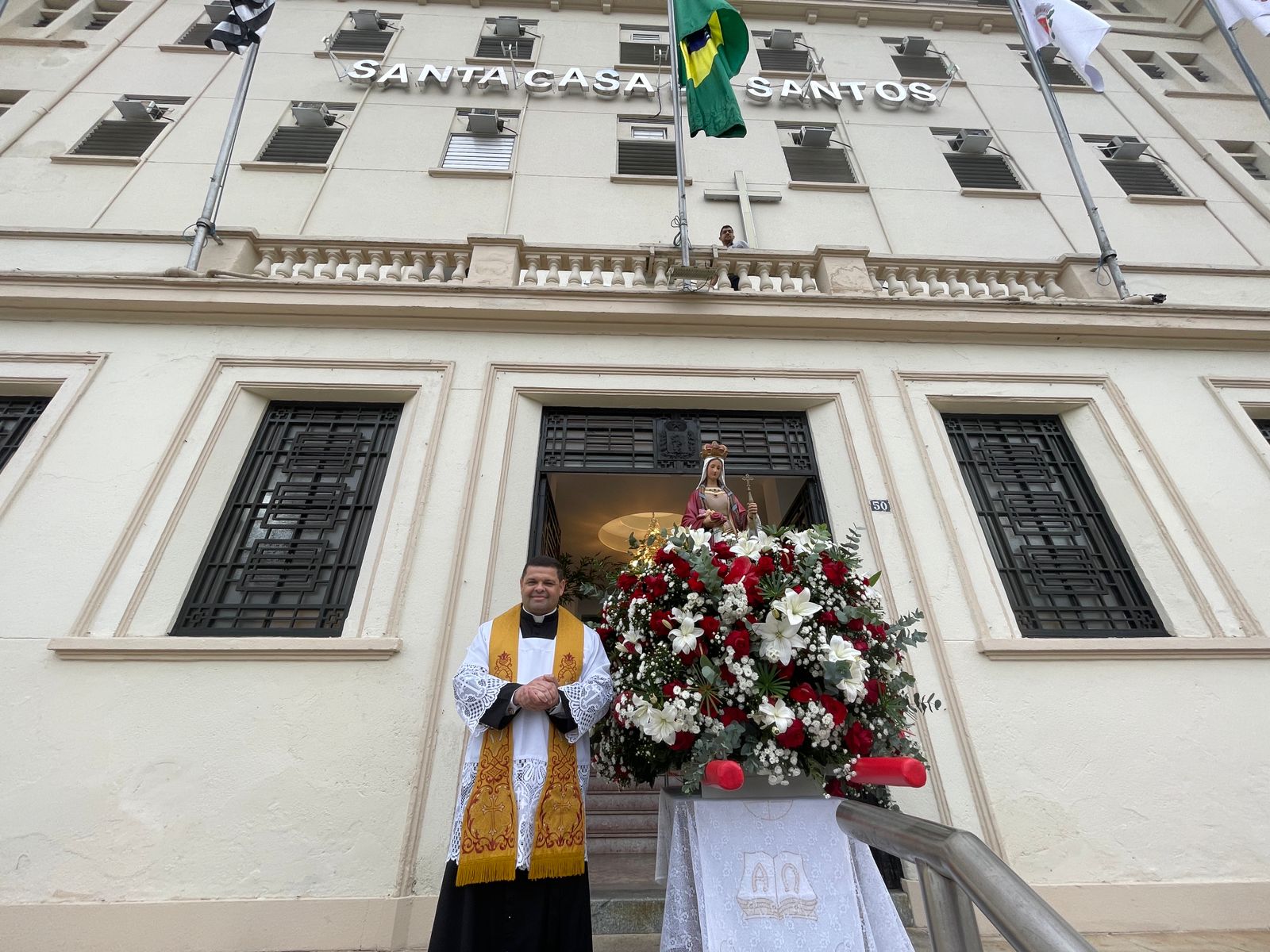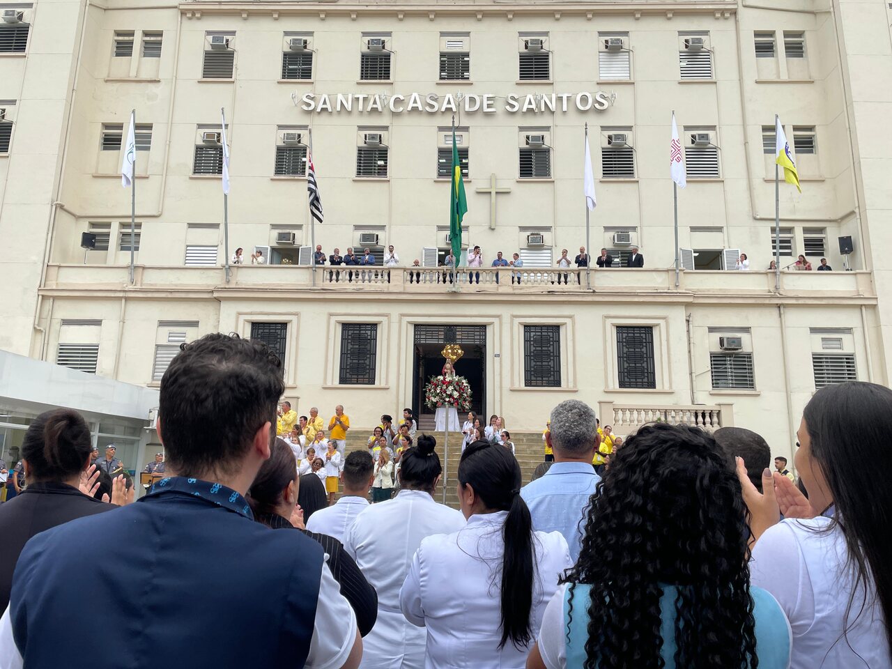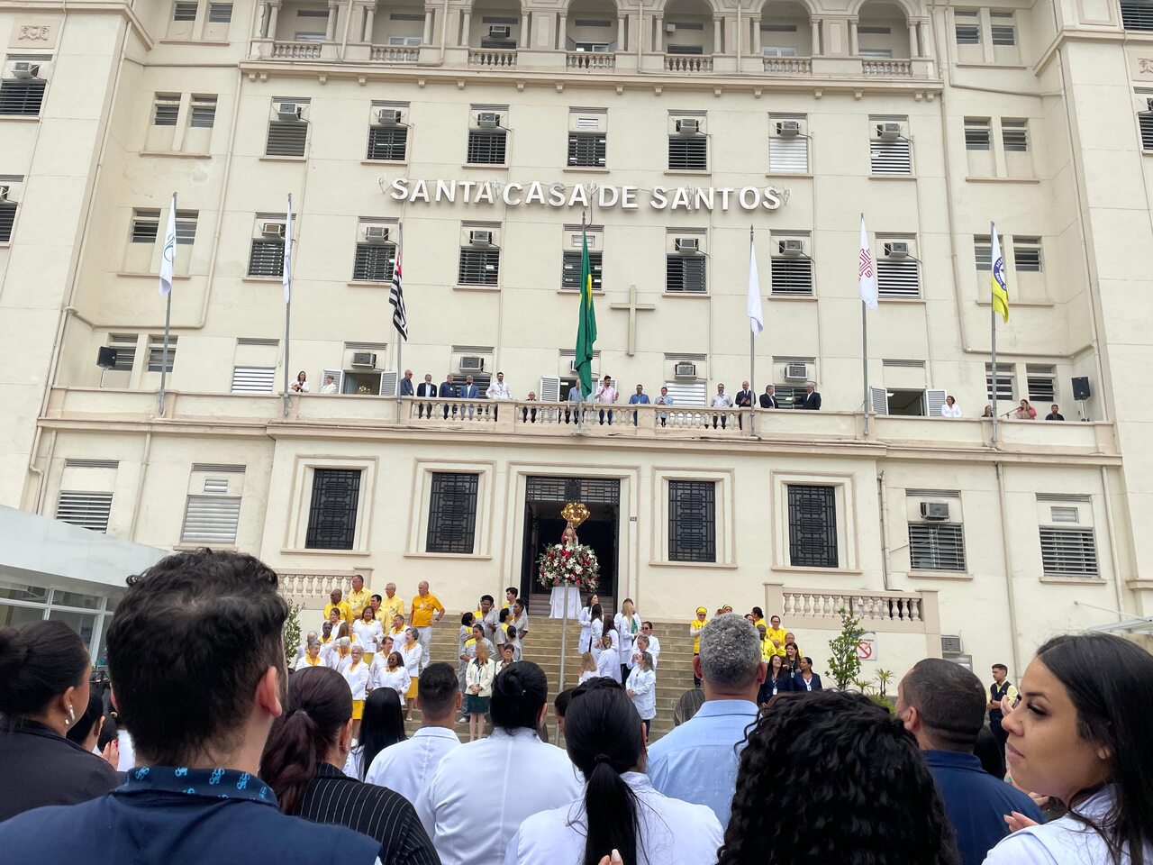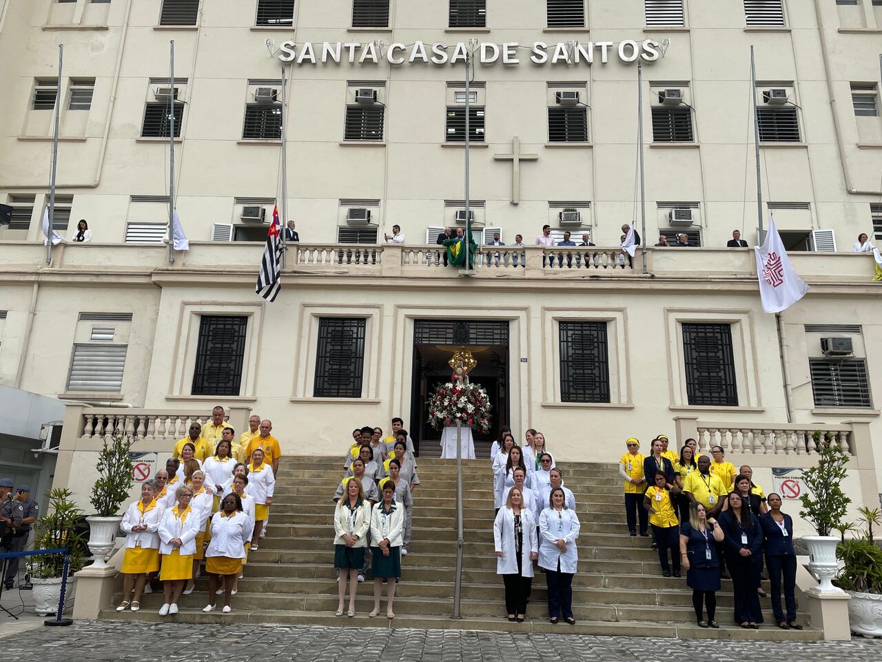 Da sacada da Santa Casa, gestores e membros da Mesa Administrativa e Conselho realizaram o hasteamento das bandeiras, conforme segue: provedor, Ariovaldo Feliciano (Bandeira do Brasil); presidente do Conselho Geral, Orlando Viscardi Junior (Bandeira de São Paulo); vice provedor e presidente da Câmara Municipal de Santos, Carlos Teixeira Filho (Bandeira de Santos); 1º Tesoureiro da Mesa Administrativa, Antonio Carvalho (Bandeira da Santa Casa de Santos); presidente da C.C.Q. , Eliana Lopes Feliciano (Bandeira do voluntariado da CCQ); presidente do voluntariado das Amarelinhas, Aparecida Regina Ramos Santos (Bandeira das Amarelinhas – AVOSC); gestora de Enfermagem, Enfª. Rita Rocha (Bandeira da Enfermagem). Também marcaram presença nos Festejos de Santa Isabel: o mordomo geral, Clóvis Moblize; a vice-presidente do Conselho Deliberativo, Marise Céspedes Tavolaro; o diretor de apoio, Octavio Tavolaro Filho; o diretor clínico, Dr. Constantino Kader Conde; o diretor comercial, Fábio Isoldi; o diretor jurídico, Dr. Aldo Santos Pinto; o diretor técnico, Dr. Alex Macedo; o vice-diretor clínico, Dr. Eloi Moccellin; e o coordenador médico do OS, Dr. Daniel Lustoza.