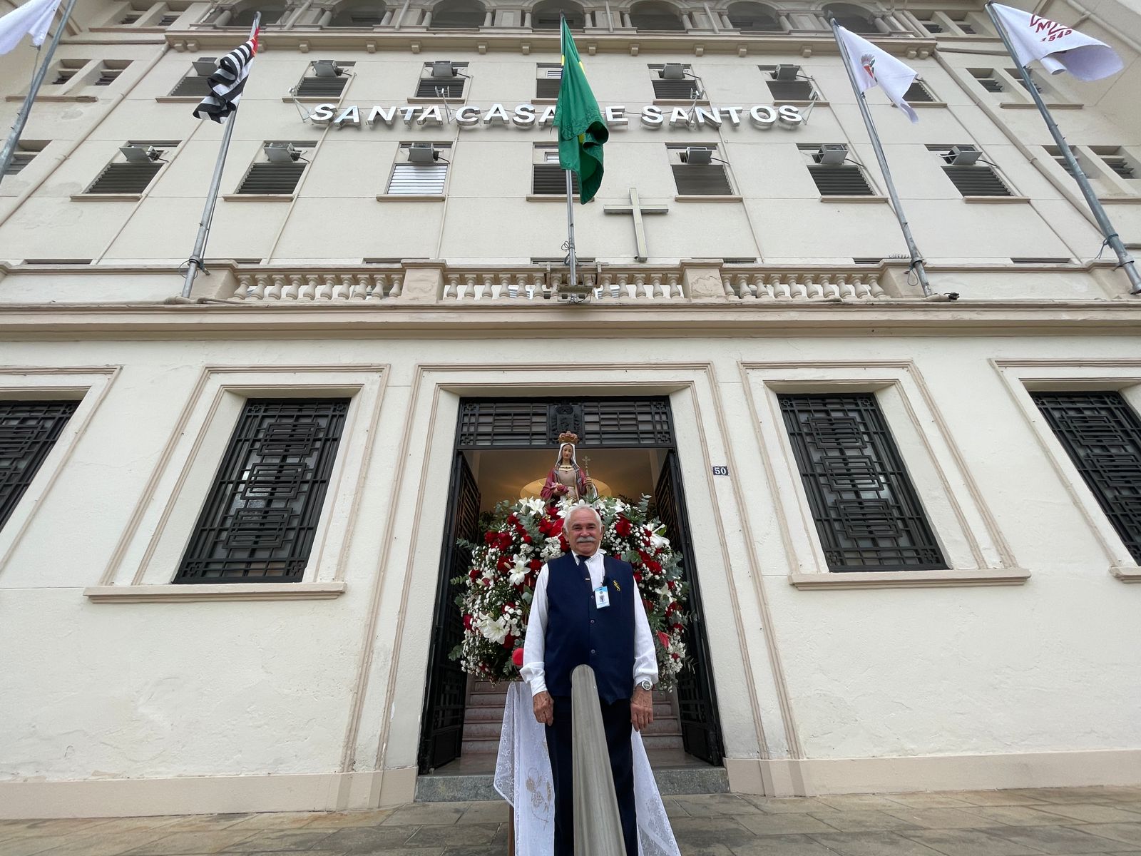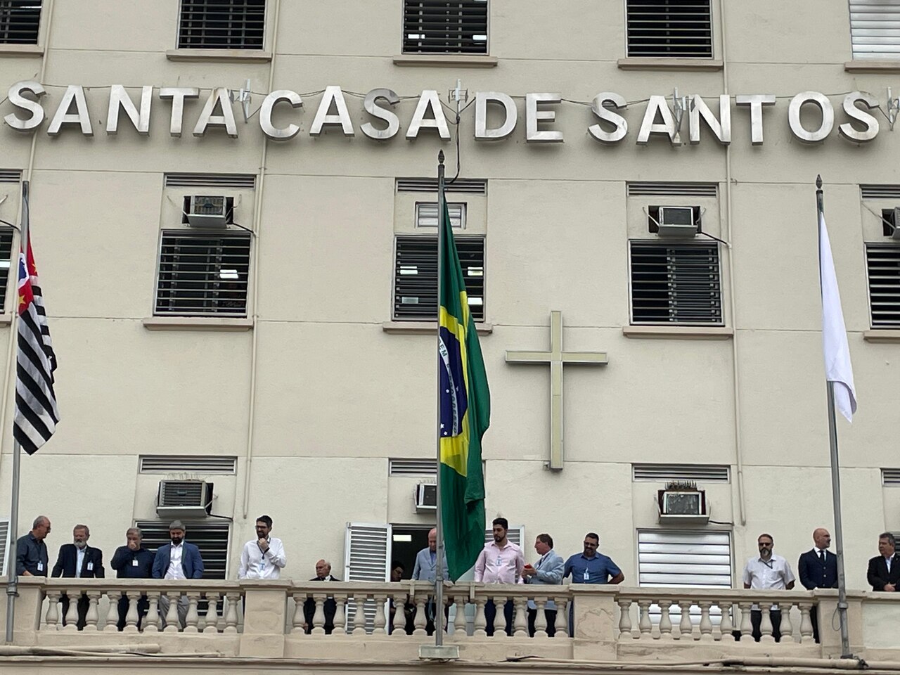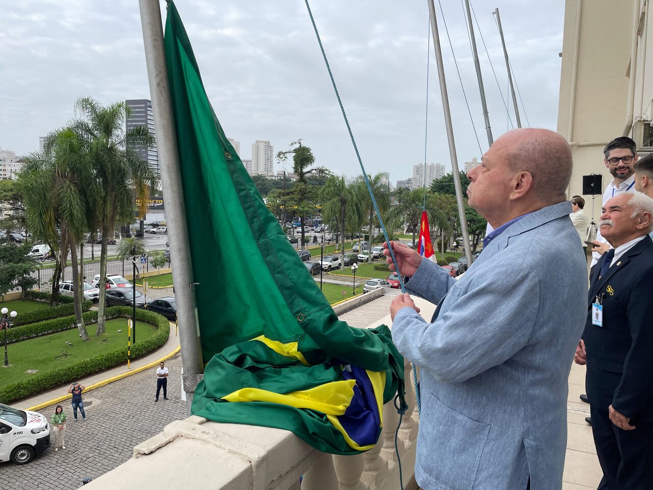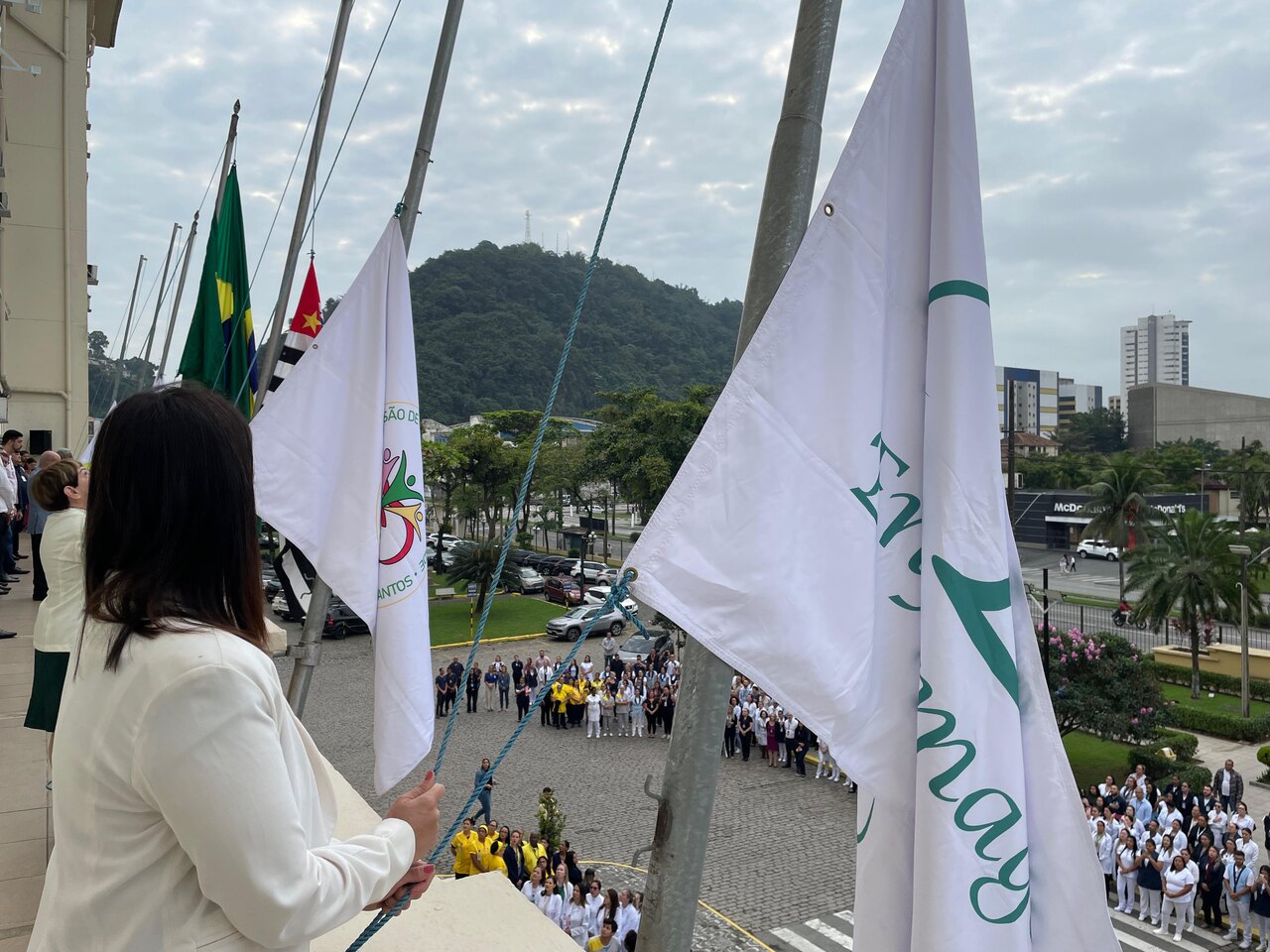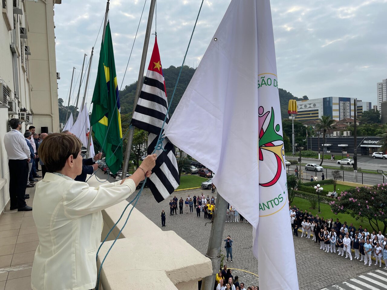 Da sacada da Santa Casa, gestores e membros da Mesa Administrativa e Conselho realizaram o hasteamento das bandeiras, conforme segue: provedor, Ariovaldo Feliciano (Bandeira do Brasil); presidente do Conselho Geral, Orlando Viscardi Junior (Bandeira de São Paulo); vice provedor e presidente da Câmara Municipal de Santos, Carlos Teixeira Filho (Bandeira de Santos); 1º Tesoureiro da Mesa Administrativa, Antonio Carvalho (Bandeira da Santa Casa de Santos); presidente da C.C.Q. , Eliana Lopes Feliciano (Bandeira do voluntariado da CCQ); presidente do voluntariado das Amarelinhas, Aparecida Regina Ramos Santos (Bandeira das Amarelinhas – AVOSC); gestora de Enfermagem, Enfª. Rita Rocha (Bandeira da Enfermagem). Também marcaram presença nos Festejos de Santa Isabel: o mordomo geral, Clóvis Moblize; a vice-presidente do Conselho Deliberativo, Marise Céspedes Tavolaro; o diretor de apoio, Octavio Tavolaro Filho; o diretor clínico, Dr. Constantino Kader Conde; o diretor comercial, Fábio Isoldi; o diretor jurídico, Dr. Aldo Santos Pinto; o diretor técnico, Dr. Alex Macedo; o vice-diretor clínico, Dr. Eloi Moccellin; e o coordenador médico do OS, Dr. Daniel Lustoza.