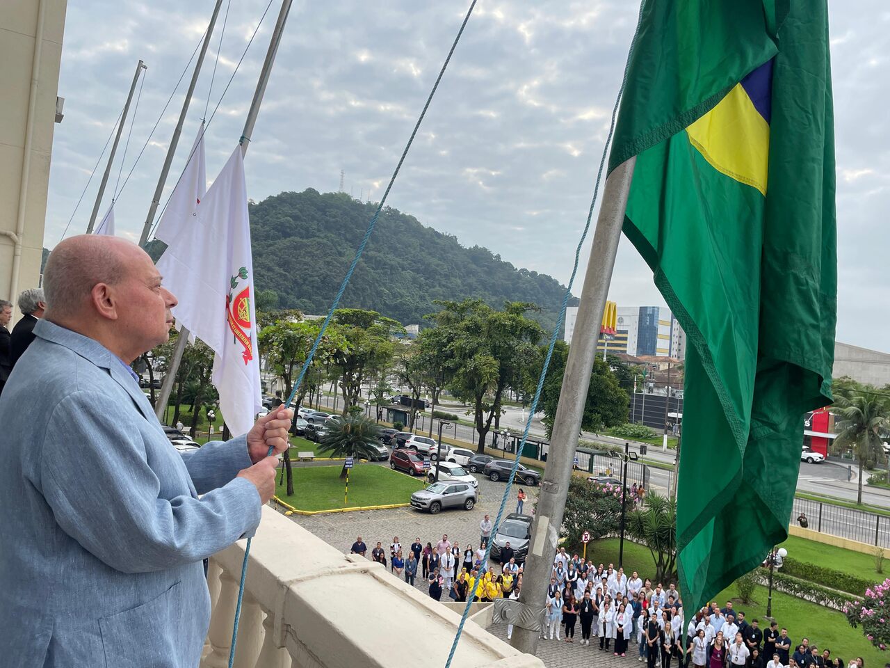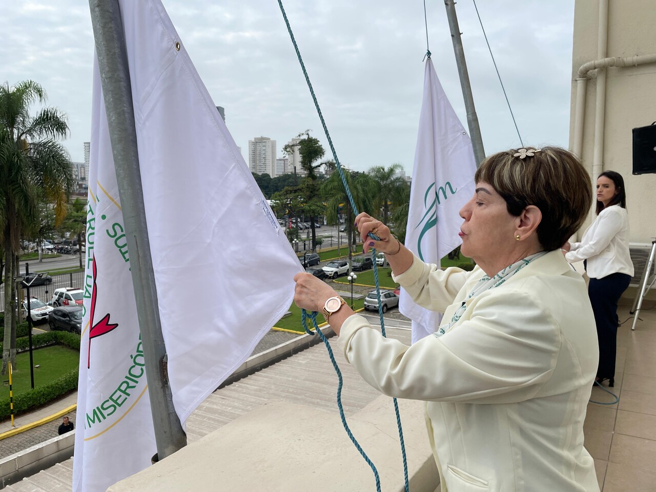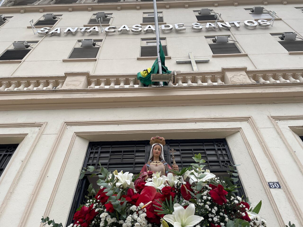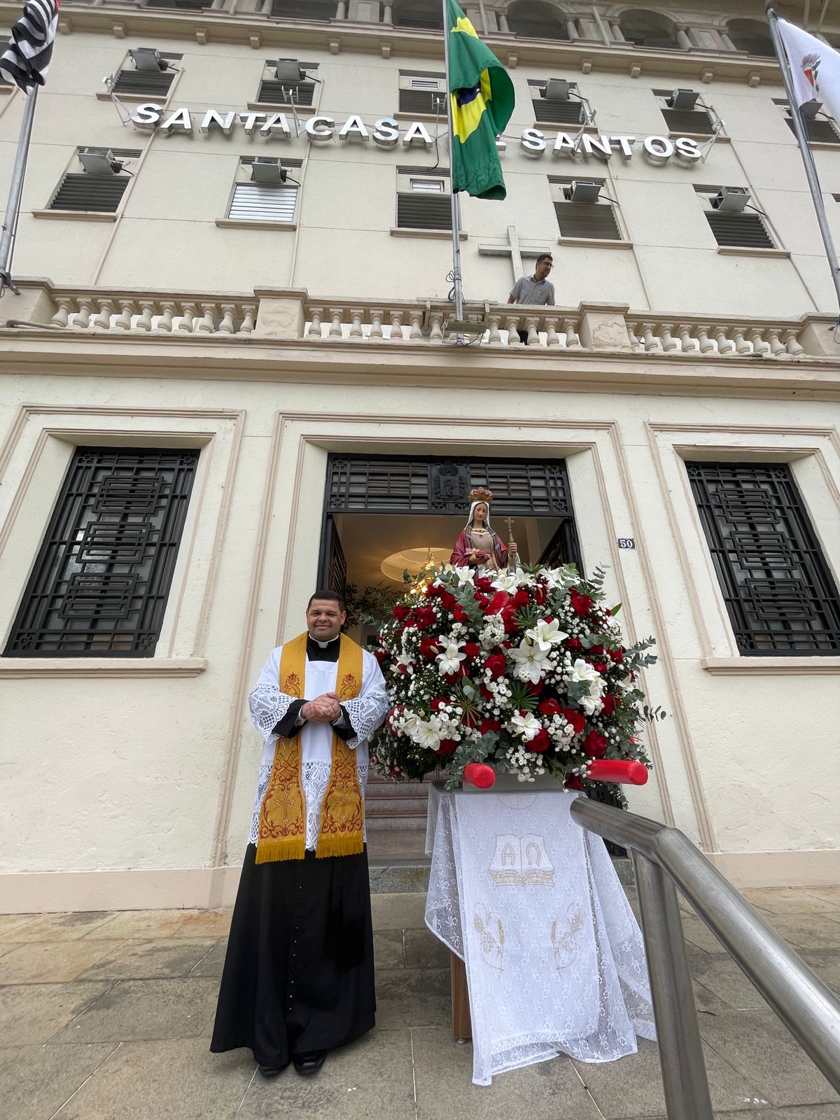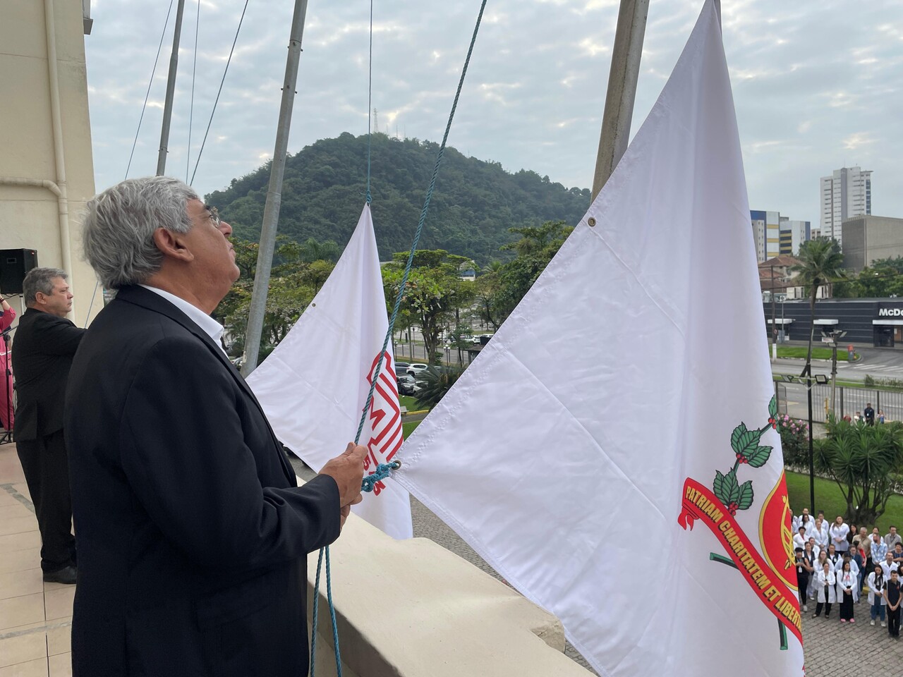 Da sacada da Santa Casa, gestores e membros da Mesa Administrativa e Conselho realizaram o hasteamento das bandeiras, conforme segue: provedor, Ariovaldo Feliciano (Bandeira do Brasil); presidente do Conselho Geral, Orlando Viscardi Junior (Bandeira de São Paulo); vice provedor e presidente da Câmara Municipal de Santos, Carlos Teixeira Filho (Bandeira de Santos); 1º Tesoureiro da Mesa Administrativa, Antonio Carvalho (Bandeira da Santa Casa de Santos); presidente da C.C.Q. , Eliana Lopes Feliciano (Bandeira do voluntariado da CCQ); presidente do voluntariado das Amarelinhas, Aparecida Regina Ramos Santos (Bandeira das Amarelinhas – AVOSC); gestora de Enfermagem, Enfª. Rita Rocha (Bandeira da Enfermagem). Também marcaram presença nos Festejos de Santa Isabel: o mordomo geral, Clóvis Moblize; a vice-presidente do Conselho Deliberativo, Marise Céspedes Tavolaro; o diretor de apoio, Octavio Tavolaro Filho; o diretor clínico, Dr. Constantino Kader Conde; o diretor comercial, Fábio Isoldi; o diretor jurídico, Dr. Aldo Santos Pinto; o diretor técnico, Dr. Alex Macedo; o vice-diretor clínico, Dr. Eloi Moccellin; e o coordenador médico do OS, Dr. Daniel Lustoza.