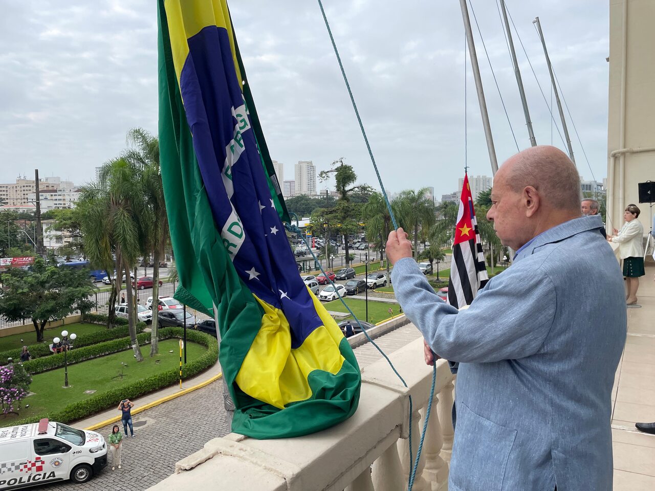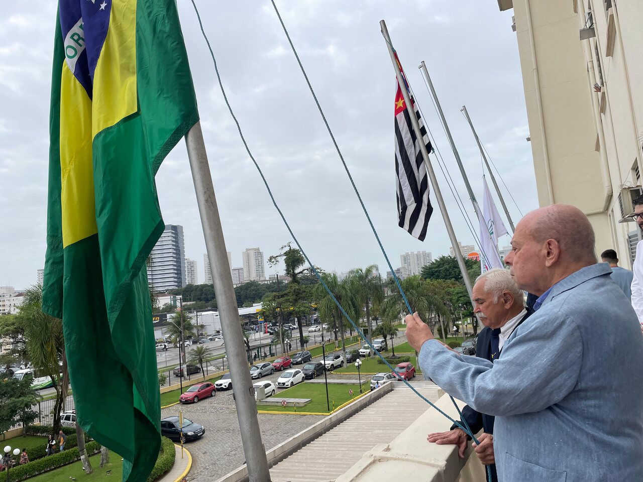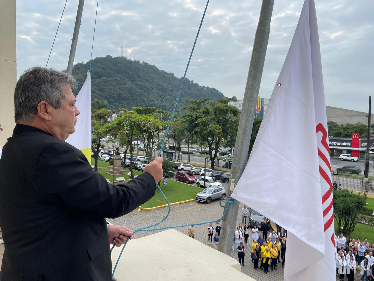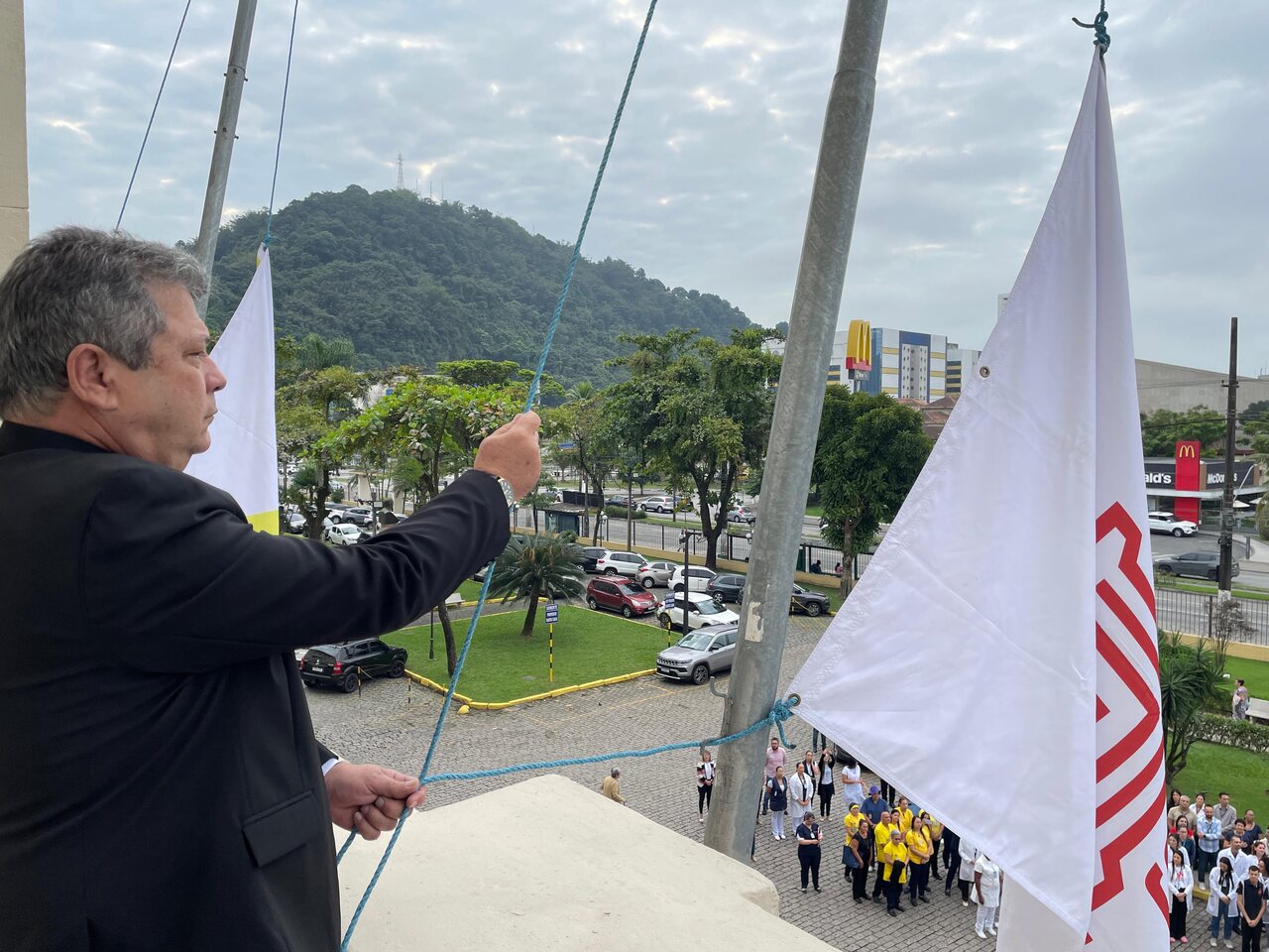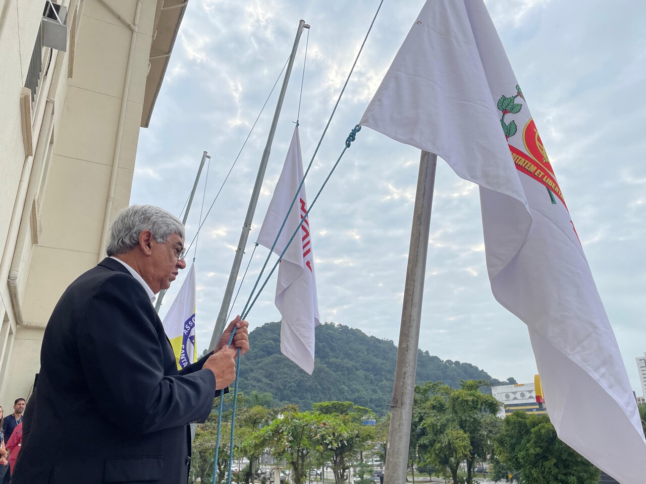 Da sacada da Santa Casa, gestores e membros da Mesa Administrativa e Conselho realizaram o hasteamento das bandeiras, conforme segue: provedor, Ariovaldo Feliciano (Bandeira do Brasil); presidente do Conselho Geral, Orlando Viscardi Junior (Bandeira de São Paulo); vice provedor e presidente da Câmara Municipal de Santos, Carlos Teixeira Filho (Bandeira de Santos); 1º Tesoureiro da Mesa Administrativa, Antonio Carvalho (Bandeira da Santa Casa de Santos); presidente da C.C.Q. , Eliana Lopes Feliciano (Bandeira do voluntariado da CCQ); presidente do voluntariado das Amarelinhas, Aparecida Regina Ramos Santos (Bandeira das Amarelinhas – AVOSC); gestora de Enfermagem, Enfª. Rita Rocha (Bandeira da Enfermagem). Também marcaram presença nos Festejos de Santa Isabel: o mordomo geral, Clóvis Moblize; a vice-presidente do Conselho Deliberativo, Marise Céspedes Tavolaro; o diretor de apoio, Octavio Tavolaro Filho; o diretor clínico, Dr. Constantino Kader Conde; o diretor comercial, Fábio Isoldi; o diretor jurídico, Dr. Aldo Santos Pinto; o diretor técnico, Dr. Alex Macedo; o vice-diretor clínico, Dr. Eloi Moccellin; e o coordenador médico do OS, Dr. Daniel Lustoza.