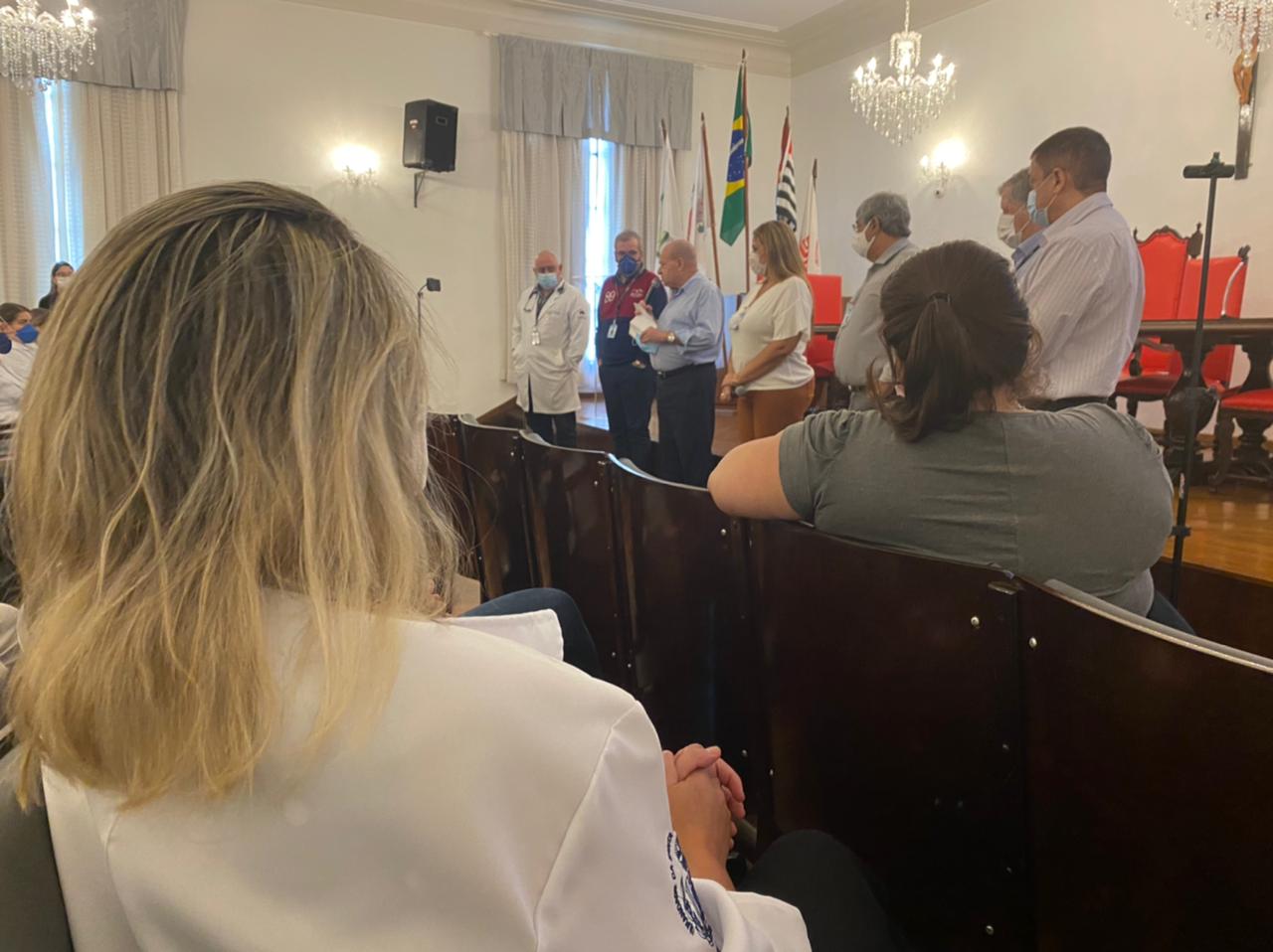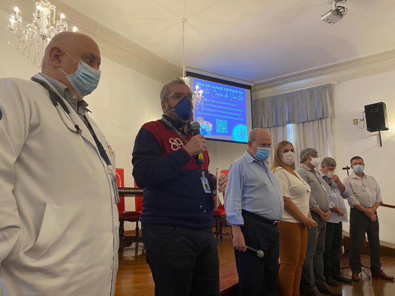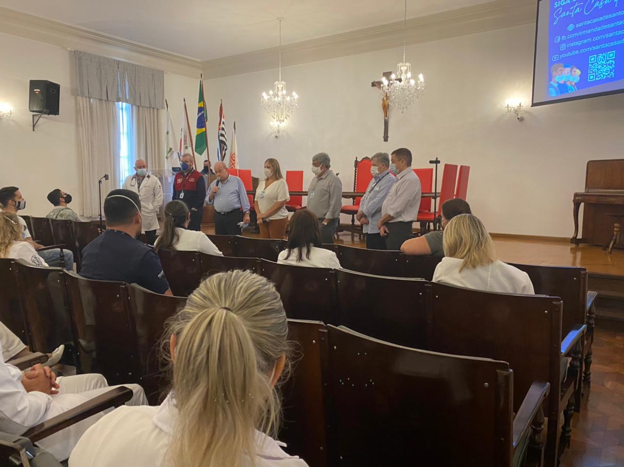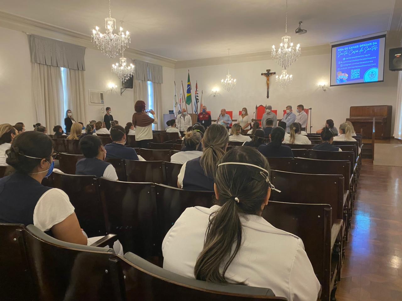 Para completar o sucesso da Semana da Enfermagem, nesta sexta, dia 21 de maio, o provedor Ariovaldo Feliciano reuniu a equipe de enfermeiros da Santa Casa de Santos para fazer o importante anúncio que, neste primeiro momento, contempla a categoria – a implantação do plano de cargos e salários para enfermeiros, investindo na remuneração do pessoal, e incentivando a qualificação dos profissionais.