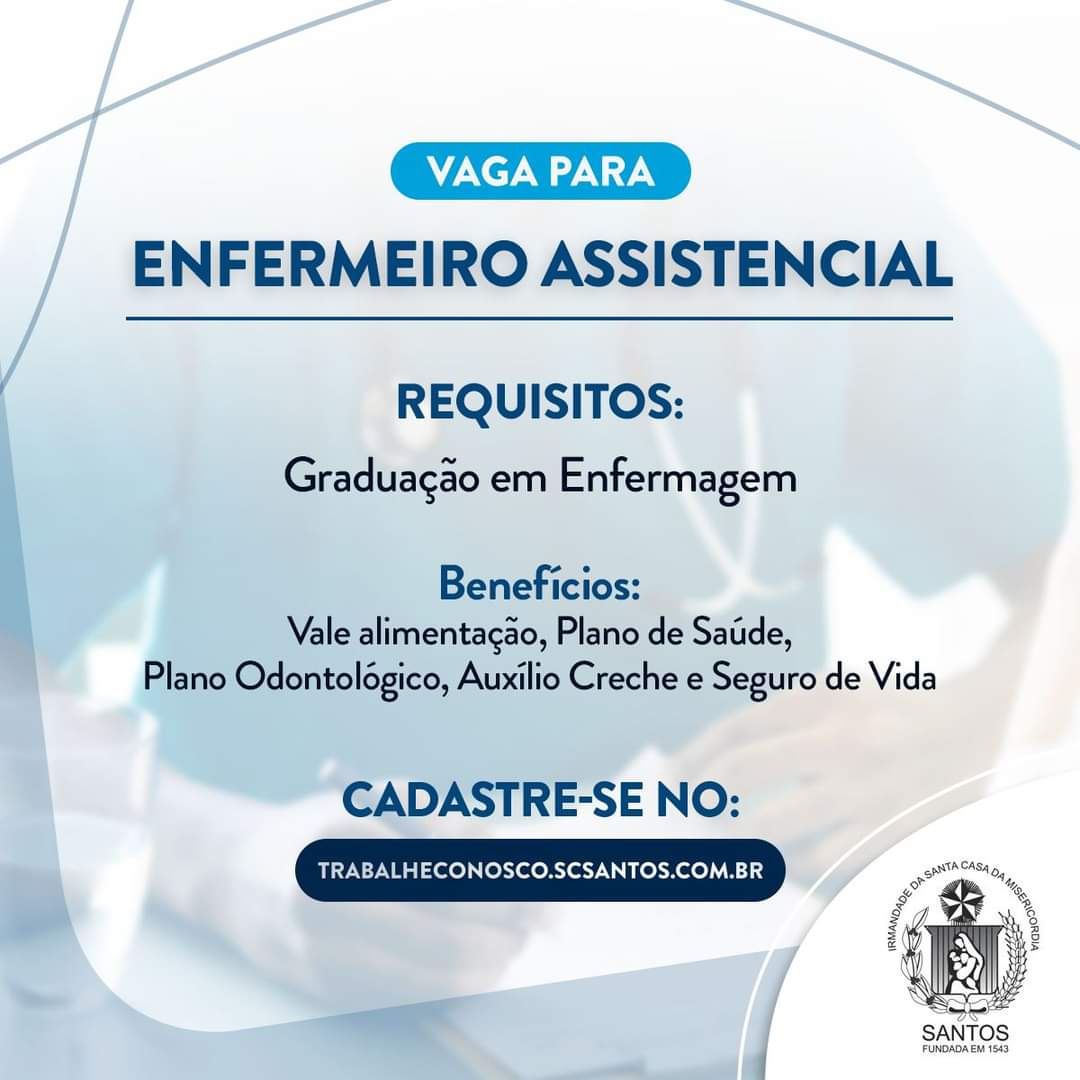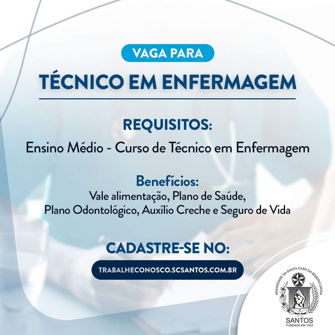 Já para as vagas de ENFERMEIROS ASSISTENCIAIS, os salários iniciais são de R$ 3.600 reais com plano de carreira, além dos benefícios. A instituição também está contratando Técnicos de Enfermagem. Todos os interessados para as vagas de enfermagem devem acessar o link www.trabalheconosco.scsantos.com.br, realizar o cadastro no Banco de Talentos da Santa Casa de Santos, e se candidatarem às vagas de interesse.