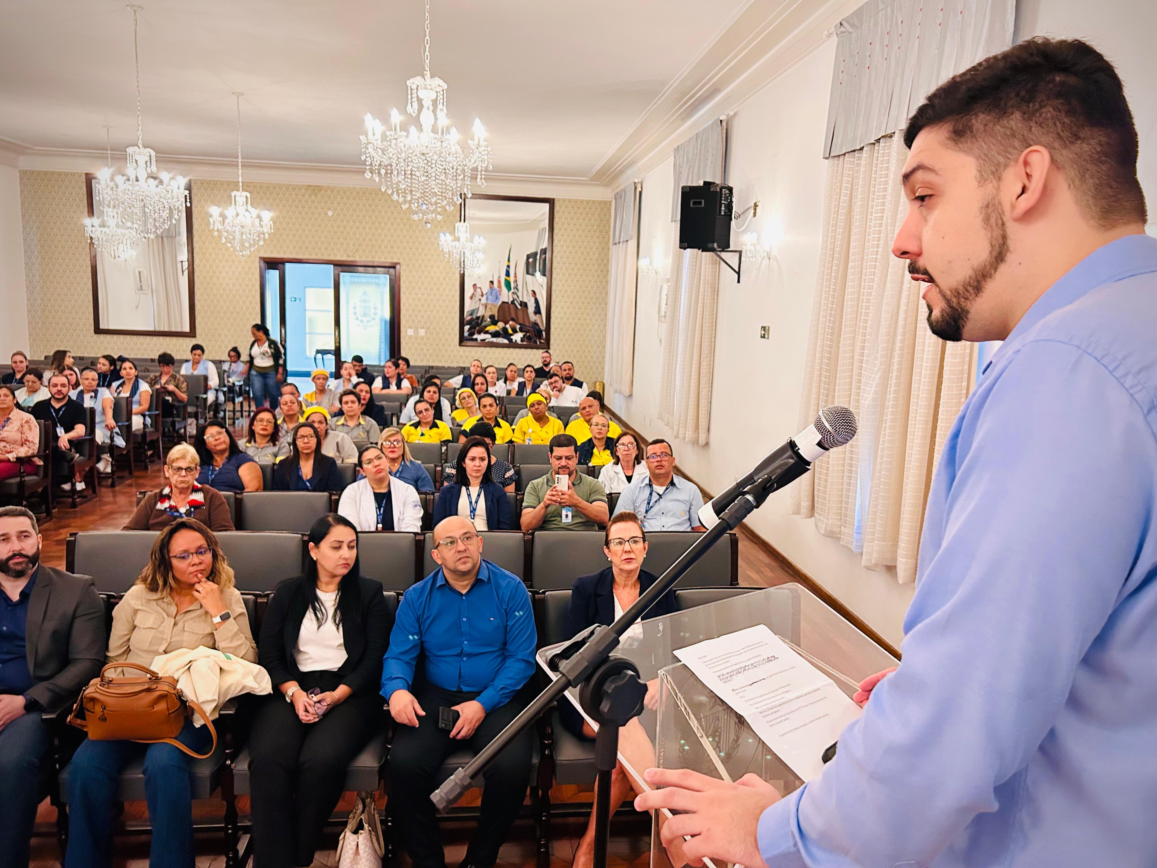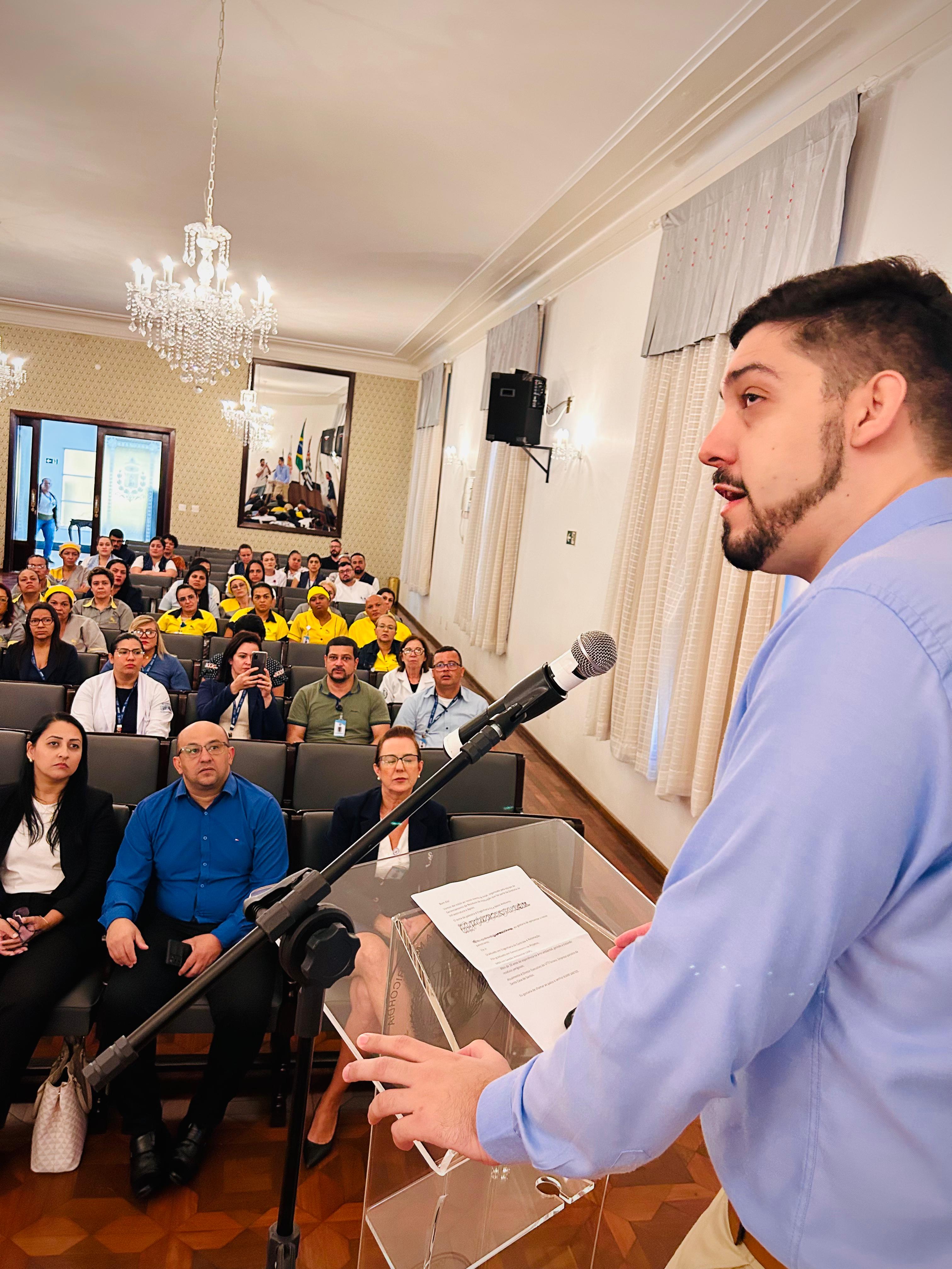 O evento teve início com a apresentação do mestre de cerimônias Luiz Lima do Departamento de Recursos Humanos, seguida pelo discurso de boas-vindas do Diretor de Infraestrutura e Apoio, Bruno Dantas, reforçando o compromisso da instituição com o desenvolvimento sustentável na área da saúde.