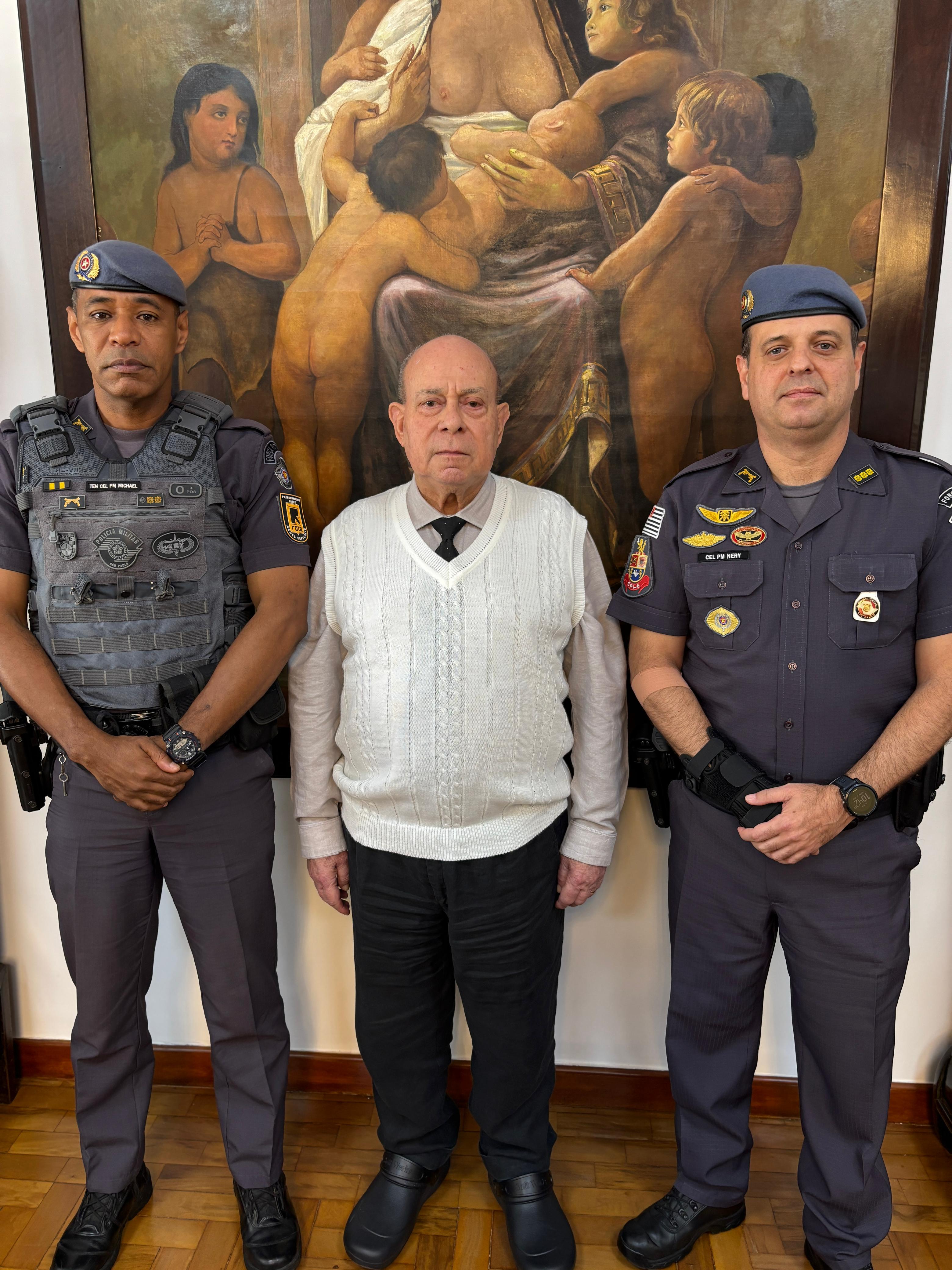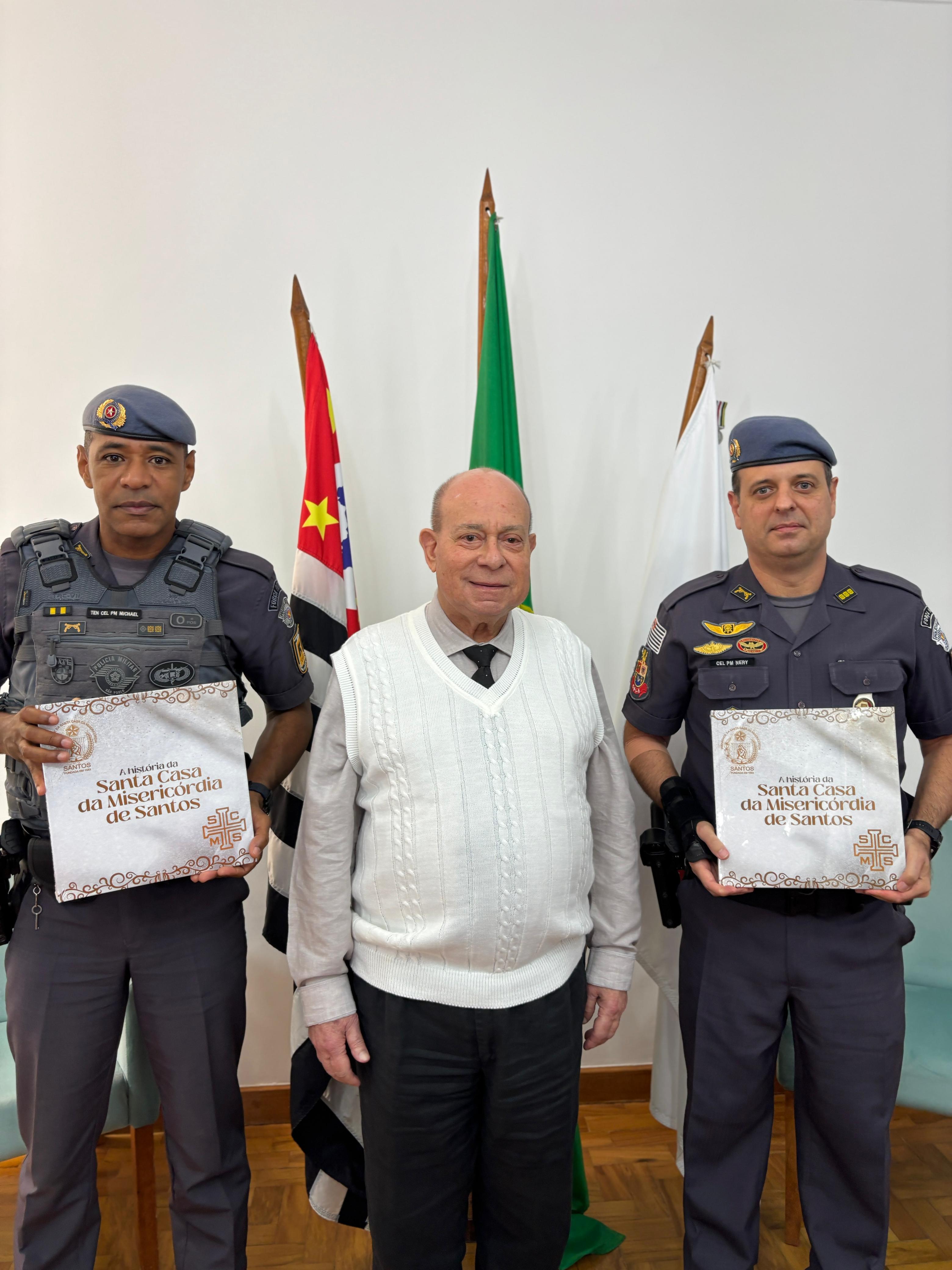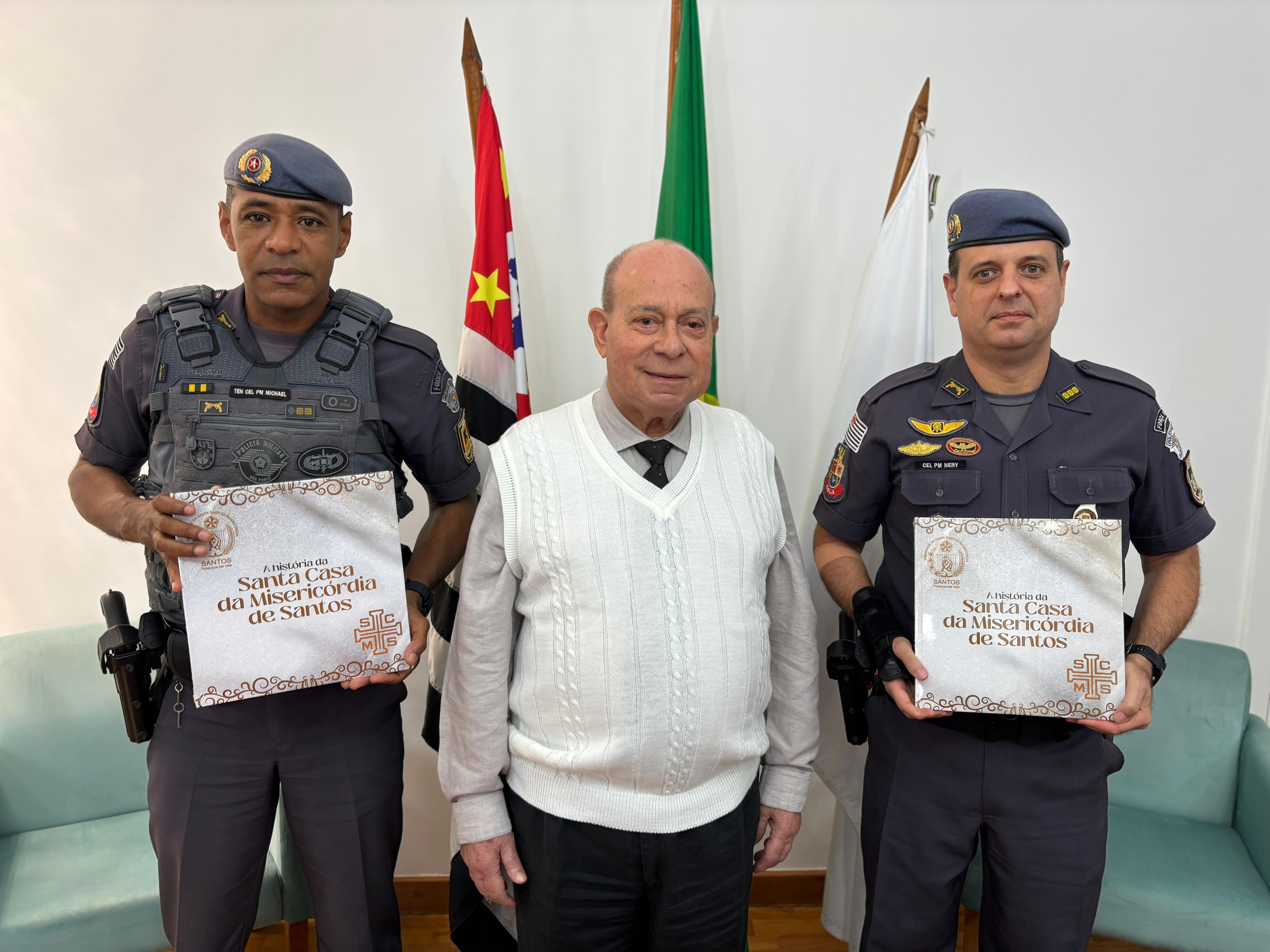Ao final da visita, o provedor Ariovaldo presenteou a comitiva da PM com o livro capitular que conta a história dos 482 anos da Santa Casa de Santos.
